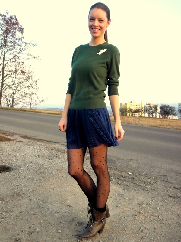 | sweater: second hand skirt: vintage pantyhose: e-shop ring: vintage nail polish: BeYu (green) brooch: D.I:Y shoes: Takko fashion lipstick: miss sporty |