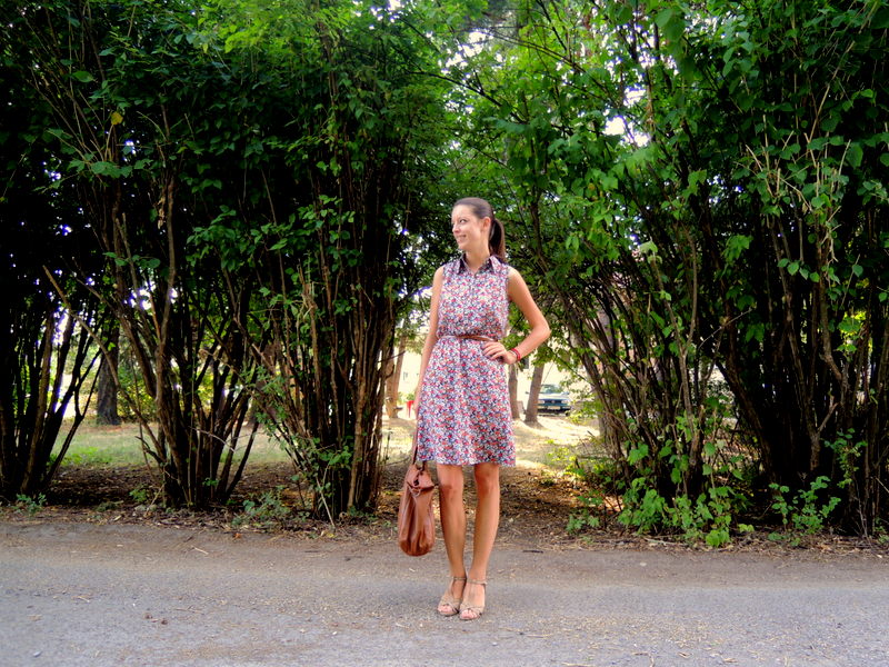 Šaty som doplnila hnedým úzkym opaskom, hnedou “pracovnou” kabelkou, nude sandálky na opätku a mix náramkov.