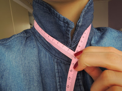 Následne som si odmerala obvod krku a vystrihla som si opäť pás cca 4-5 cm široký (odporúčam 5cm) a dlhý podla obvodu + 2cm (keby náhodou). Nezabudnite si merať obvod cez košeľu, aby sa vám nestalo to čo mne, že som ho musela nadpájať ehm.