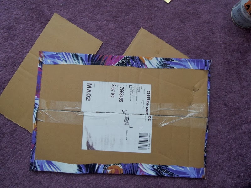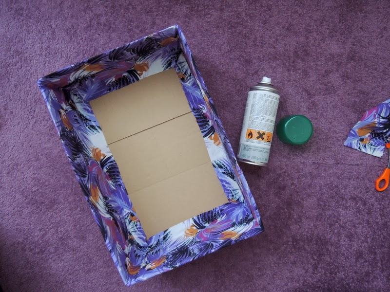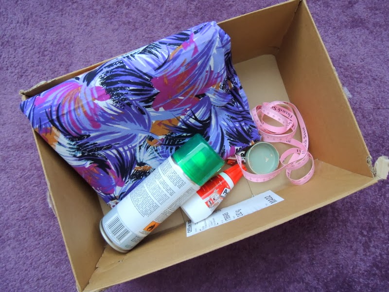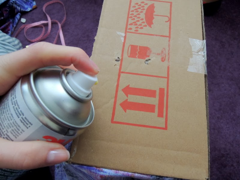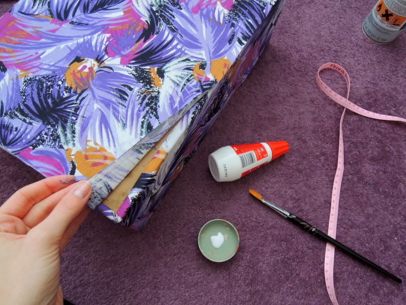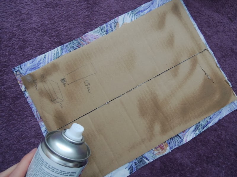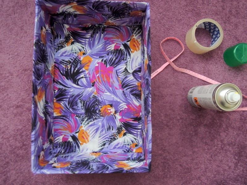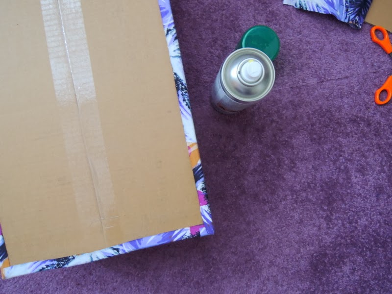 Predtým ako začnete lepiť látku na krabicu odstráňte všetky lepiace pásky a štítky, ktoré vám budú brániť v lepení. Na dno odporúčam použiť papierovú lepiacu pásku (ktorú som ja nepoužila, ale látka vám bude lepšie držať ako na klzkej priesvitnej lepiacej páske). Odmerajte si, koľko látky zahnete na vonkašiu a vnútornú stranu krabice a môžete začať nanášať lepidlo v spreji. Lepidlo kúpite v každom obchode s umeleckými potrebami. Lepidlo naneste na celú plochu a látku prikladajte a zatláčajte.