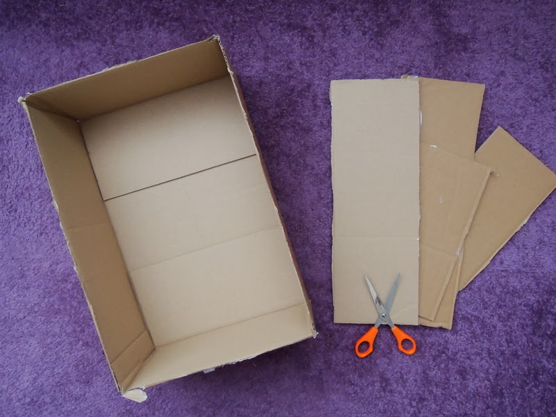 Najprv odporúčam rozložiť si noviny alebo igelit, aby ste od lepidla nemali všetko lepkavé. Z krabice odstrihnite vrchnú časť, aby vám zostali len steny a dno. Nevyhadzujte ich, budeme ich ešte potrebovať.