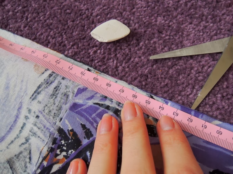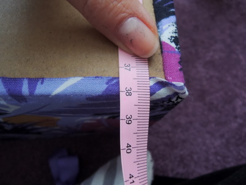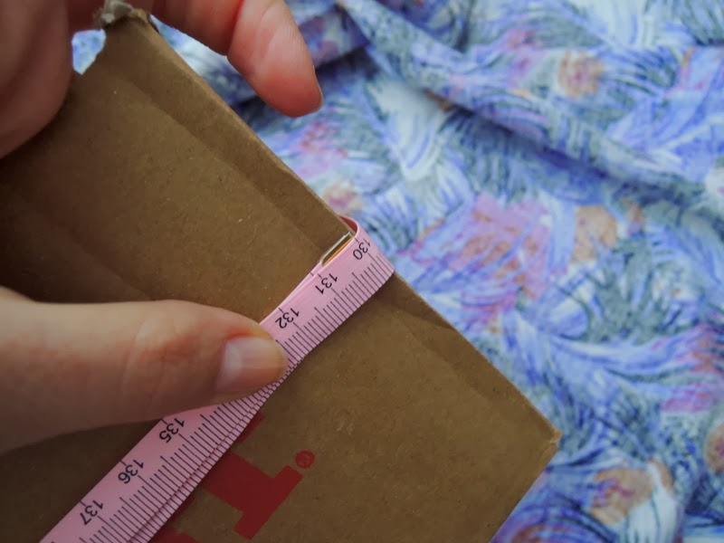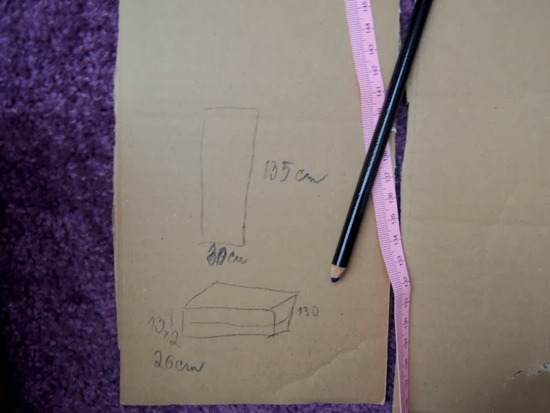 Odmerajte obvod a šírku krabice. K šírke/výške pridajte cca 5 cm a k obvodu cca 3-4 cm, ako záložku na vonkajšiu aj vnútornú stranu. Na jeden krát chceme oblepiť aj vonkajšie aj vnútorné strany krabice t.j. výšku krabice vynásobíme dva krát. Môj obvod krabice bol 130 cm a šírka alebo výška 13 cm (máte to na obrázku nakreslené) t.j. ja som strihala 135 cm (130 obvod + 5 cm záložka) x 30 cm (13 šírka/výška x 2 + 4 cm záložka).