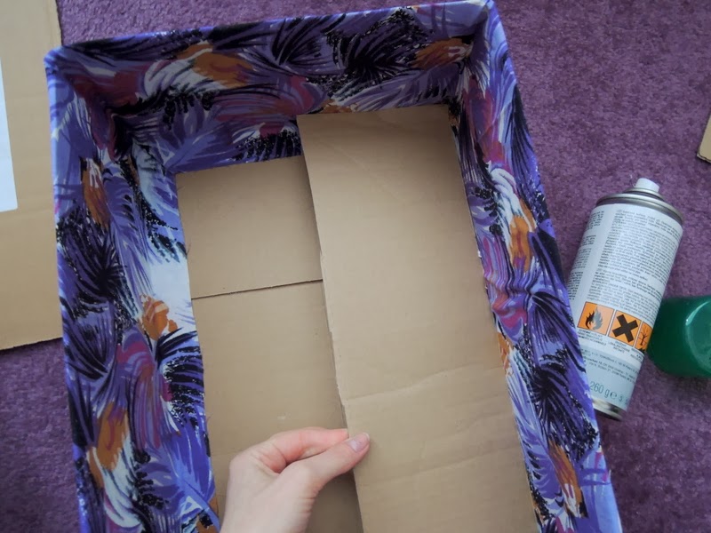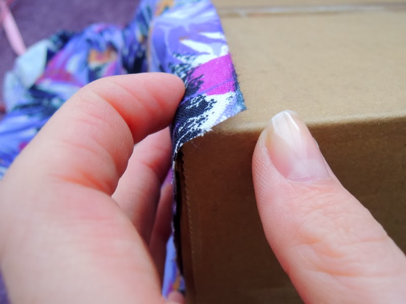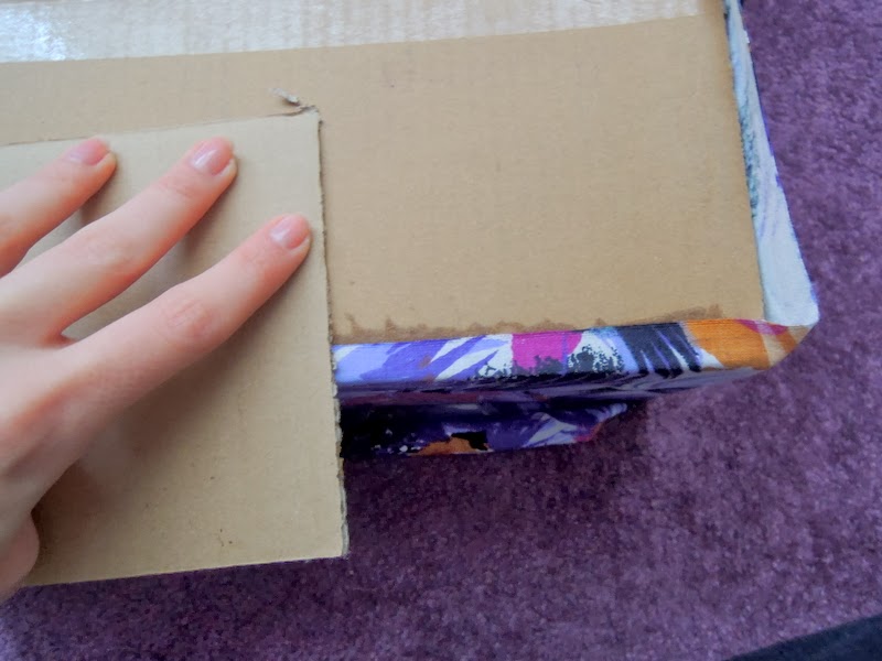 Do vnútornej časti som po dobu kým som pracovala na spodnej vonkajšej strane krabice, vložila odstrihnuté kartónové časti, aby sa látka dôkladne prilepila aj v rohoch.