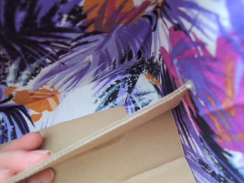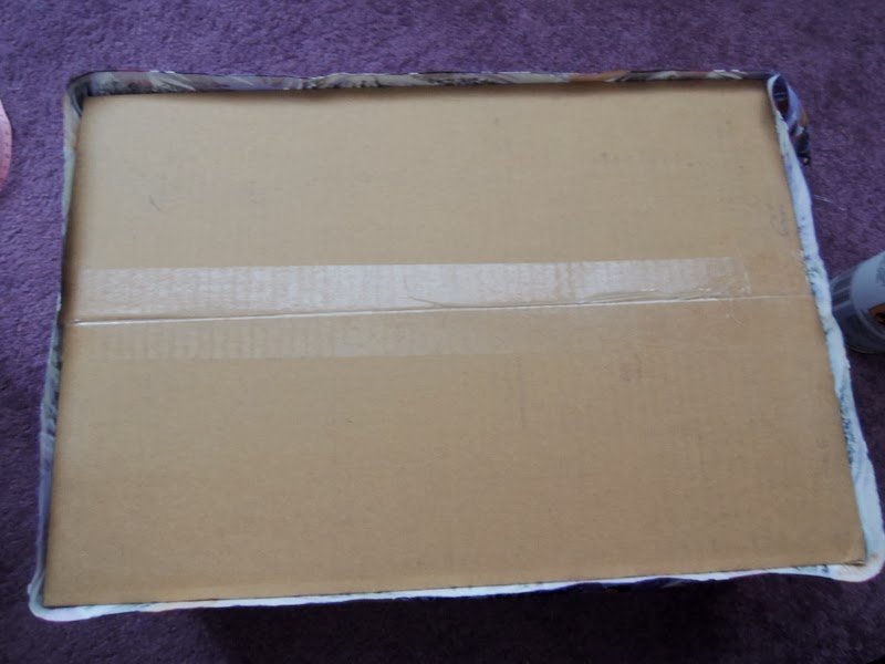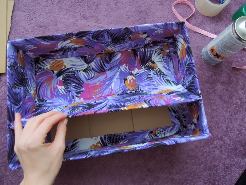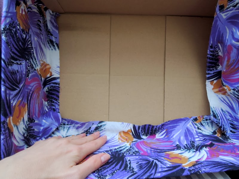 Zvnútra je teda krabica hotová, krásna. Teraz dokončite spodnú časť. Opäť som použila lepidlo v spreji, ale na okraje som použila štetec a univerzálne lepidlo. Je to jediná časť krabice, kde si musíte dávať pozor, aby bola látka poriadne zalepená. Na ostatných častiach je cez látku vždy niečo nalepené, zatlačené.