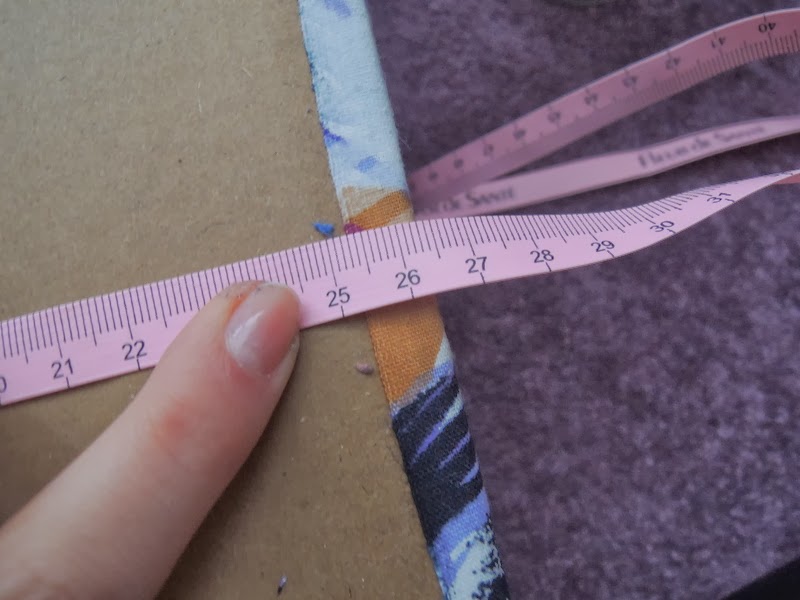 Otočte krabicu a odmerajte koľko látky budeme potrebovať, alebo zoberte odstrihnuté kartónové časti, ktoré majú rovnaké rozmery, ktoré budeme potrebovať na dokončenie krabice. Ja som zvolila kartónové časti, ktoré sme na začiatku odstrihli. Zlepila som ich lepiacou páskou a odstrihla som látku. Opäť som pridala pár centimetrov na záložku. Nastriekajte lepidlo a priložte látku. Takto Vám vznikne vnútorné dno krabice, ktoré sa bude dať vyberať. Nemá to žiadny skrytý význam, len sa mi lepšie nanášalo lepidlo aj látka ako keby som sa mala trápiť v krabici 🙂