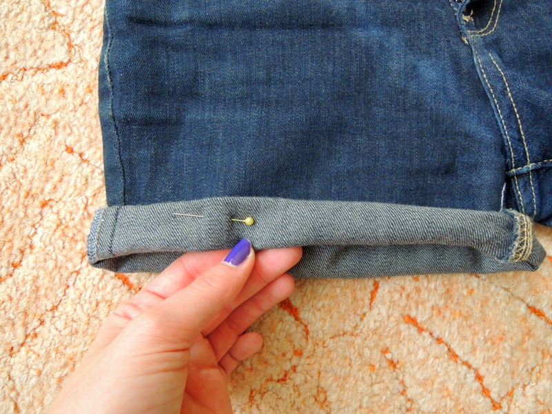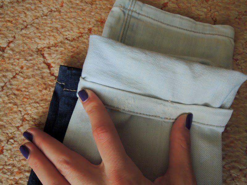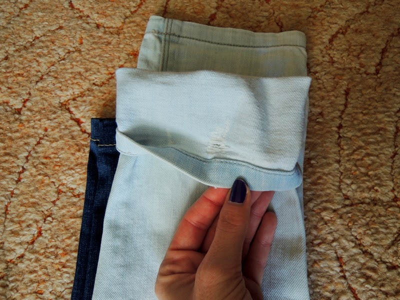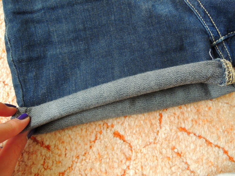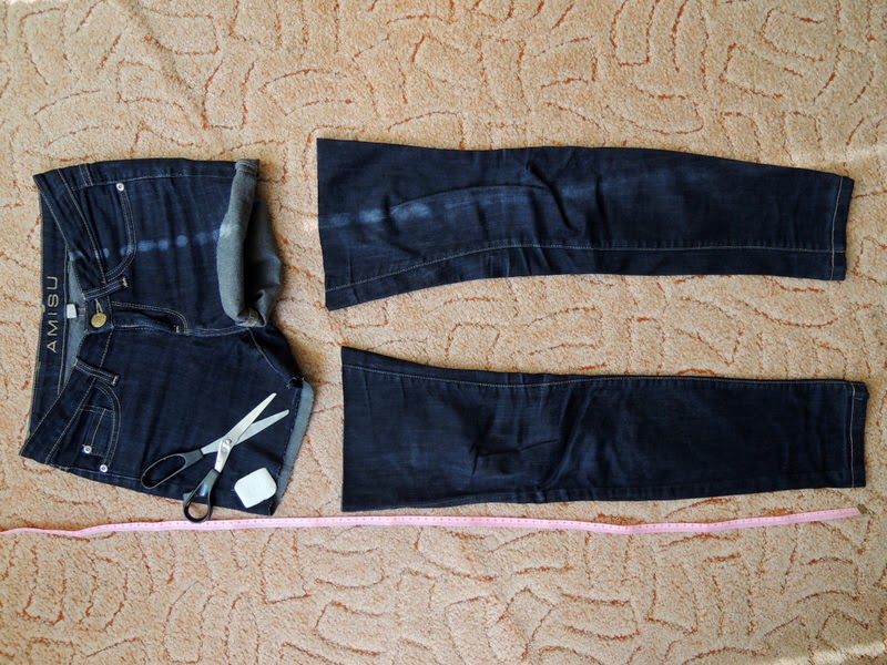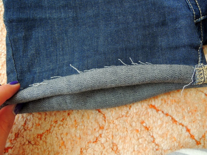 Najprv jeansy zahnite do dlžky akej chcete aby boli. Ja som skracovala podľa jeansov, ktoré majú tú správnu dĺžku, ale pre istotu si ich ešte premerajte, aby ste nemali jednu nohavicu kratšiu a druhú dlhšiu.