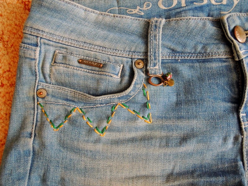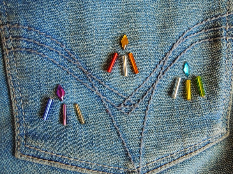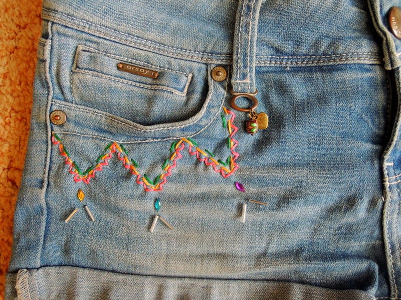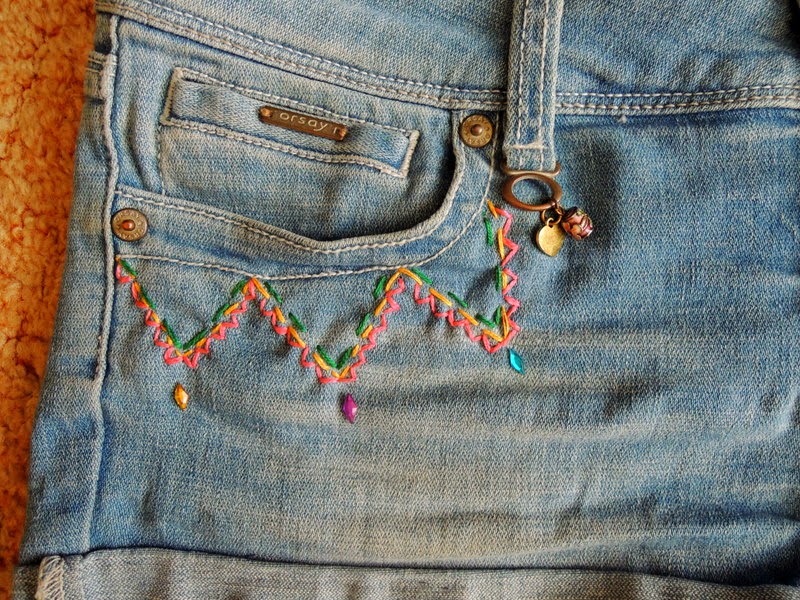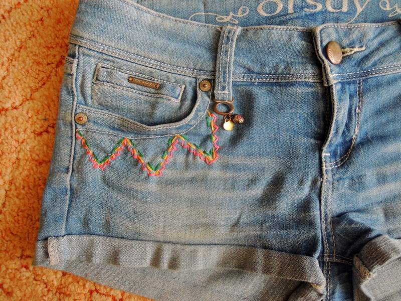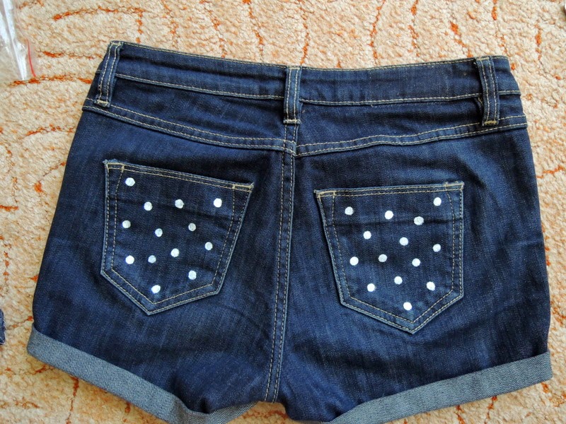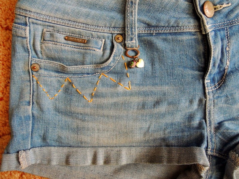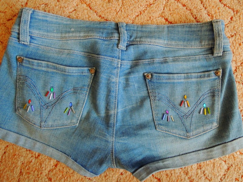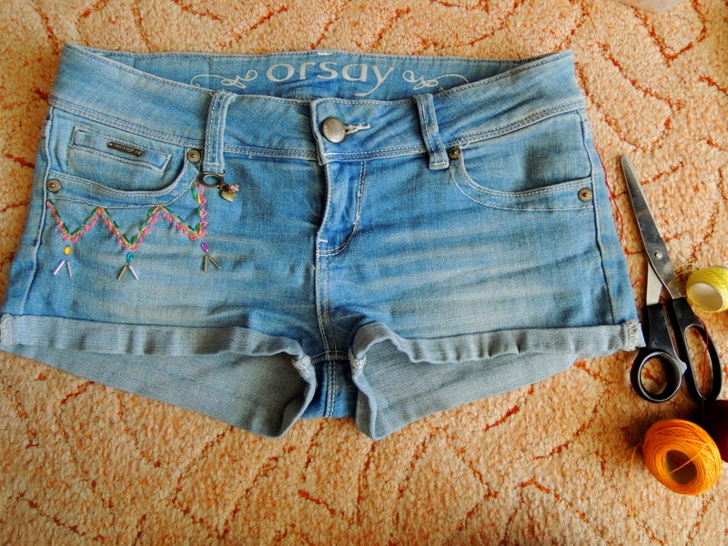 Tieto šortky som si vyrobila už pred cca 2 rokmi. Teraz ma už akosi začali nudiť. Vymyslela som si, že ich ozdobím korálkami a bavlnkami nasledovne: