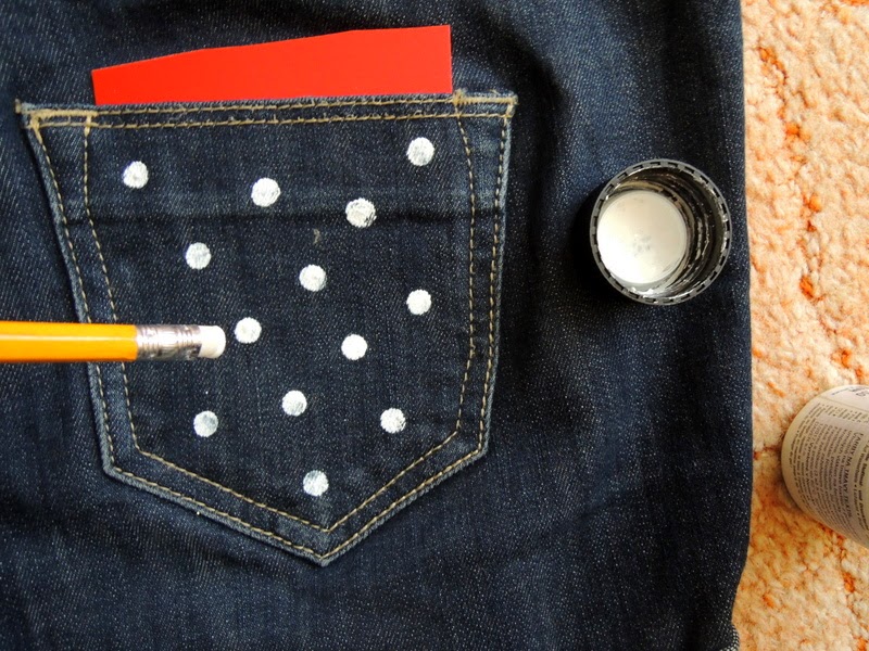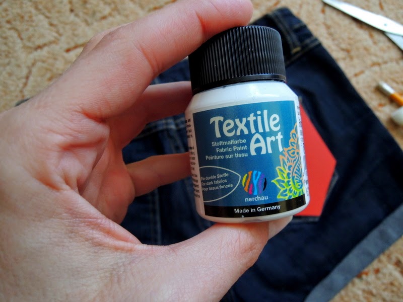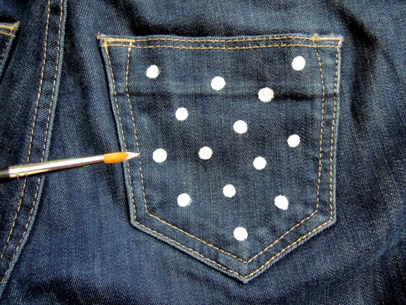 Na ozdobenie som použila bielu farbu na textil. Veď viete moja láska k bodkám 🙂 Z niečoho napríklad kartónu si vyrobte podložku, ktorú dáte do vrecka, aby farba neprešla na druhú vrstvu nohavíc 🙂