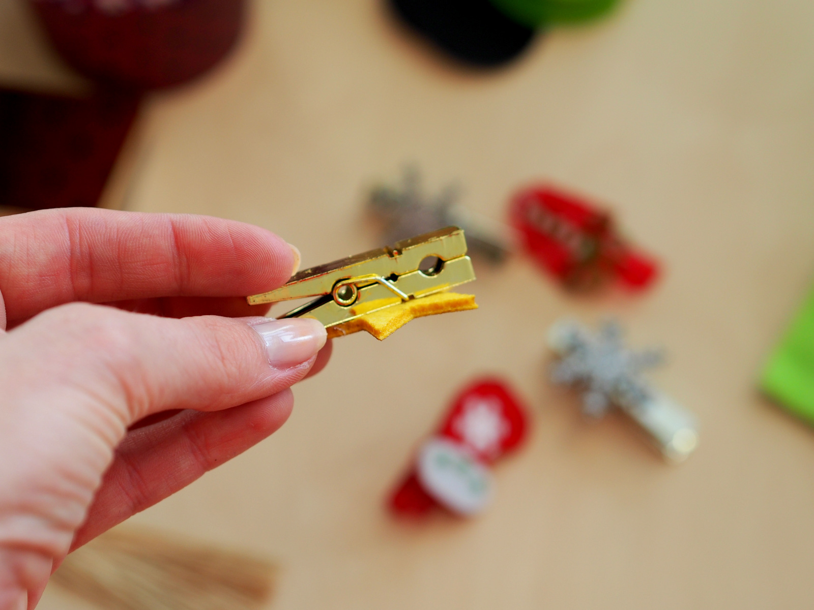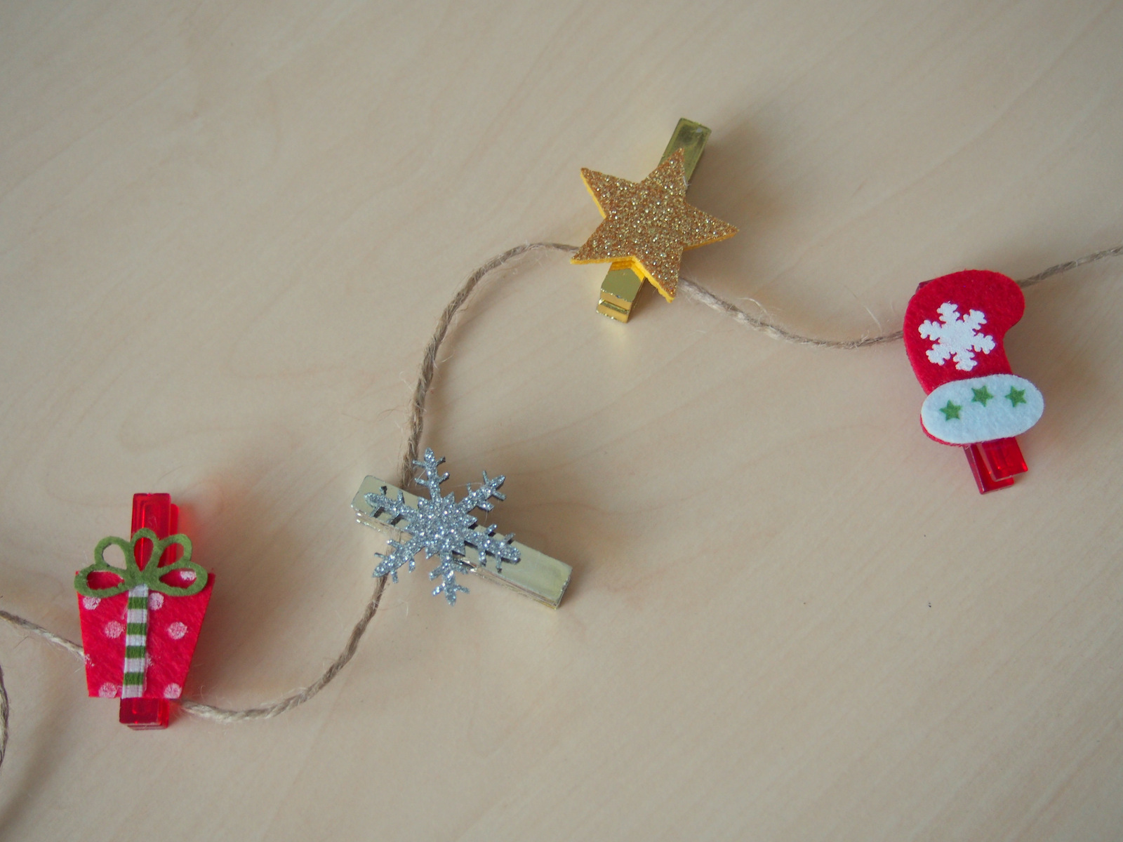 Vianočné štipceeee. Na tie som sa veľmi tešila. Zatiaľ mi zdobia kanceláriu, no okolo 20 decembra sa presunú na vianočné darčeky 🙂 Stačí vyrobiť menovku a pekne ju prištipcovať na zabalený darček. Prípadne môžete štipce využiť ako dekoráciu na servítky, zapnúť na špagát a zavesiť na stenu, alebo ho nosiť na kabelke 🙂 Je to veľmi milé, v sete sú dve pozlátené hviezdičky, dve postriebrené vločky a štyri červené štipce s mikulášskou čiapkou a darčekom 🙂