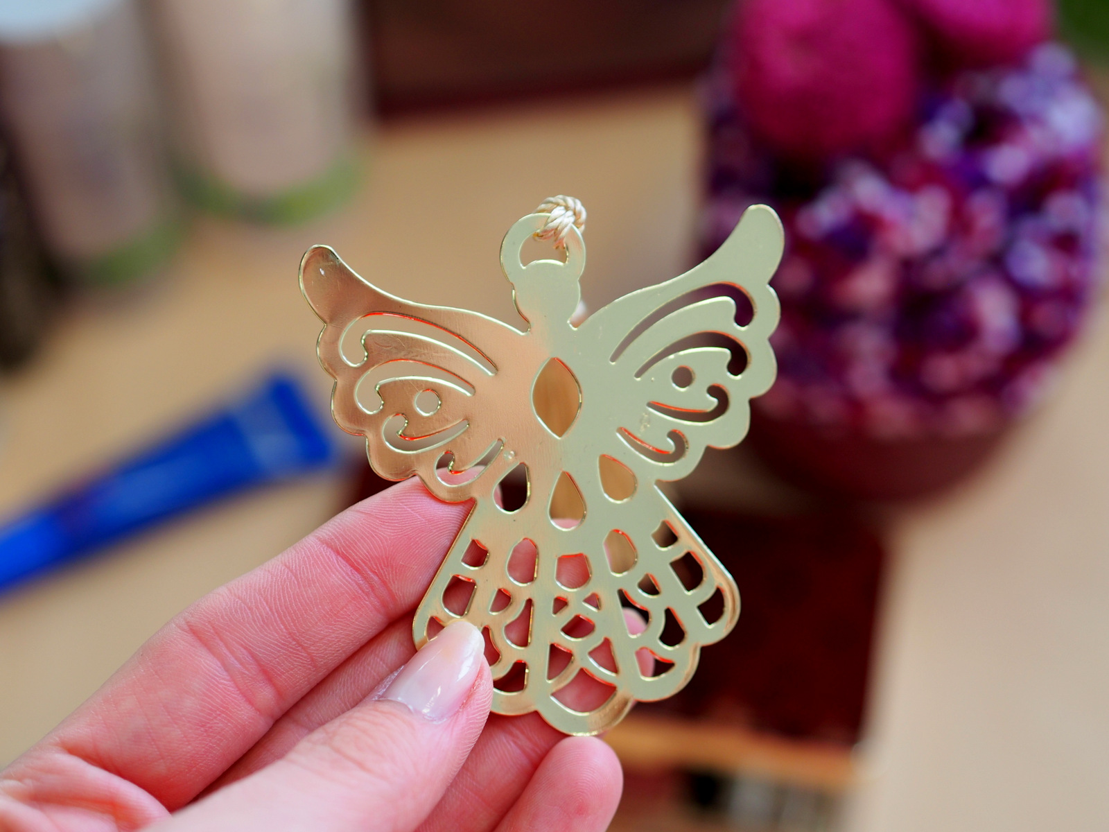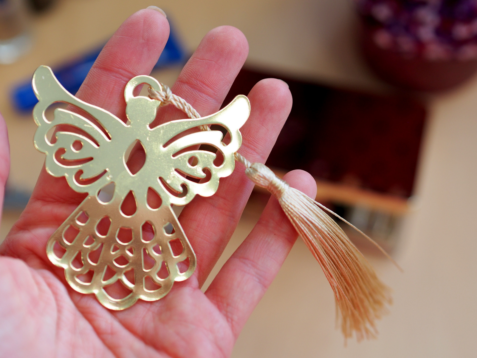 Ja ako nadšenec klasických kníh nemám záložiek nikdy dosť. Rozčítané mám aj štyri naraz. Záložky používam aj v učebniciach, no táto je vhodná aj ako ozdoba 🙂 Je pozlátená a ukončená trendy strapcom 🙂 Mne sa občas stáva, že sa mi záložka roztrhne alebo pokrčí v kabelke, no s týmto anjelikom to nehrozí. Z knihy vám trčí textilný strapec. KRÁSA!