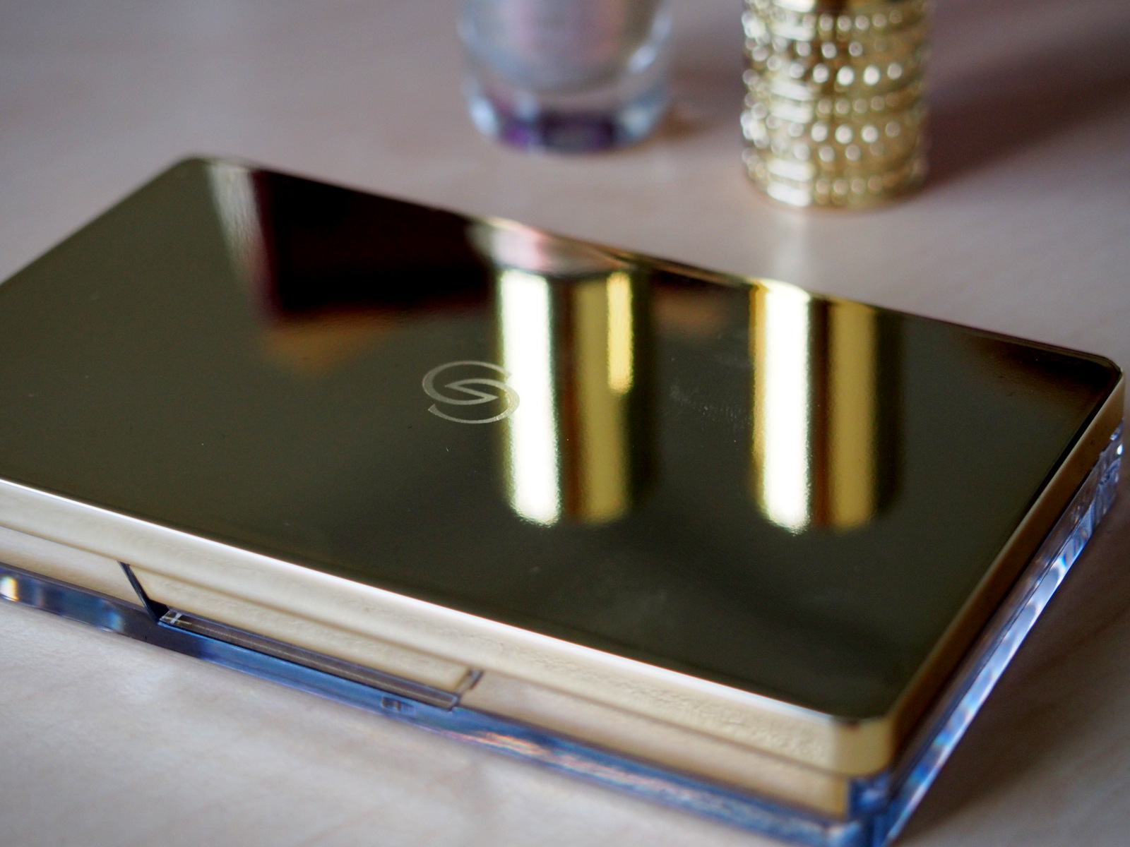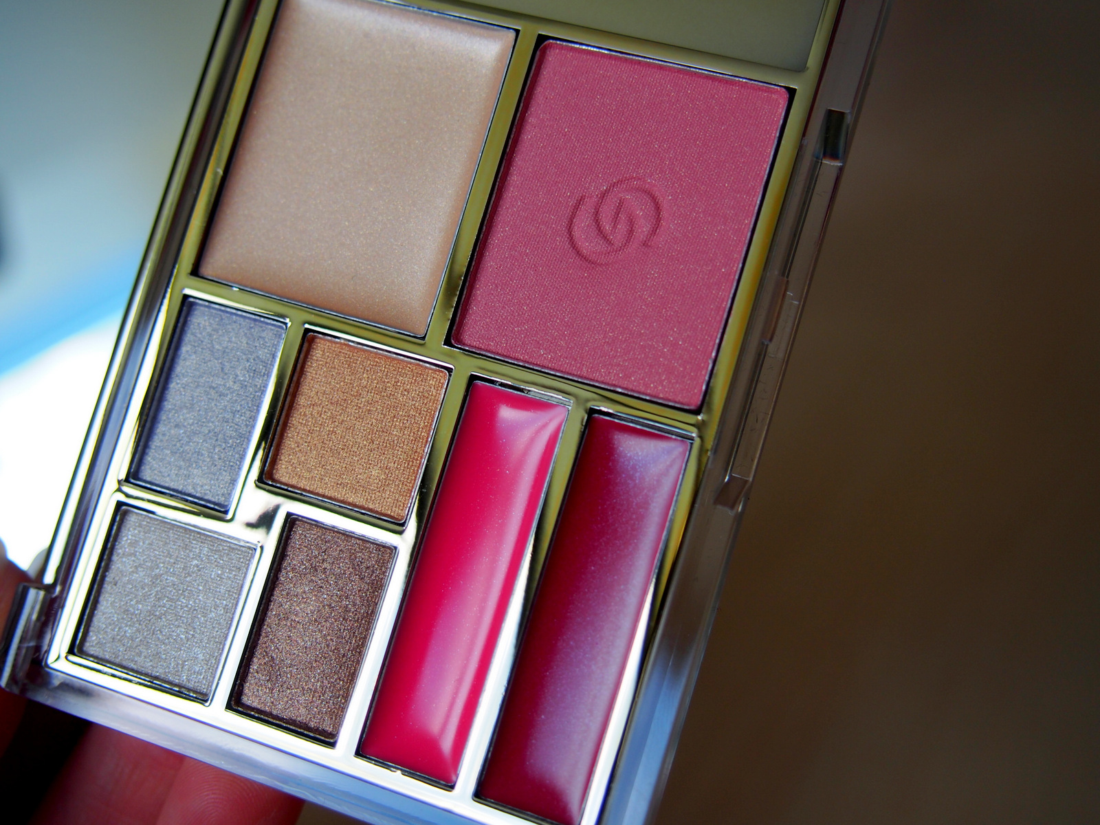 Kozmetická paleta v zlatistom kovovom puzdre obsahuje