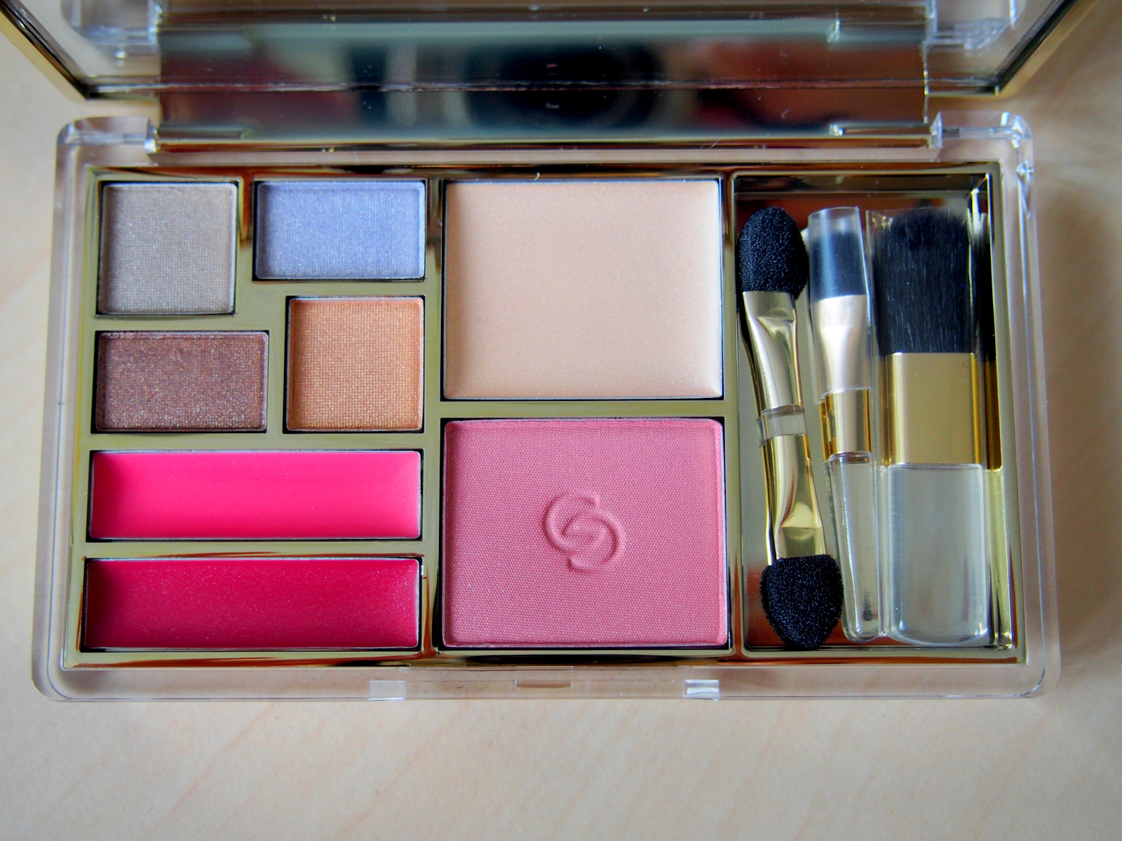 Okrem toho, že táto paletka vyzerá úplne nádherne,na čo sme si už zvykli pri dekoratívnej kozmetike GG, kladne hodnotím aj samotný produkt. Štyri očné tiene sa krásne lesknú a sú dobre pigmentované. Dajú sa navzájom pekne kombinovať a môžete si vytvoriť viacero variant líčenia. Lesky na pery sú lesky, takže nemôžete očakávať sýte farby s nekonečným efektom. Lesky sú s jemným nádychom ružovej a vínovej, tak ako to vidíte na fotkách. Perám dodajú lesk a budú vyzerať zdravo. Nemajú žiadnu vôňu, nelepia a na nanášanie môžete použiť priložený aplikátor, alebo vlastný štetec 🙂 Aplikátory sú v balení hneď tri. Okrem jedného obojstranného na tiene (na každý tieň jedna strana), na lesk na pery, tu nájdete aj aplikátor na farbu na líca a rozjasňovač. Rozjasňovač ma prekvapil svojim leskom a krémovou konzistenciou. Lícne kosti pekne zvýrazní a hlavne rozjasní 🙂 to je jeho hlavná úloha. Farba na líčka je takisto pekne pigmentovaná a má príjemnú prirodzenú farbu, takže nebudete vyzerať ako Marfuša z Mrázika 🙂 Páči sa mi aj veľké zrkadielko, ktoré je v balení a zamatové vrecúško, ktoré takisto nájdete v balení. Dokonalé do kabelky, keď napríklad máte dlhý deň a nestíhate sa ísť upraviť po práci domov. Stačí mať túto krásnu paletku a všetko máte po ruke. Stačí viac zvýrazniť oči, líca a perám dodať viac lesku.