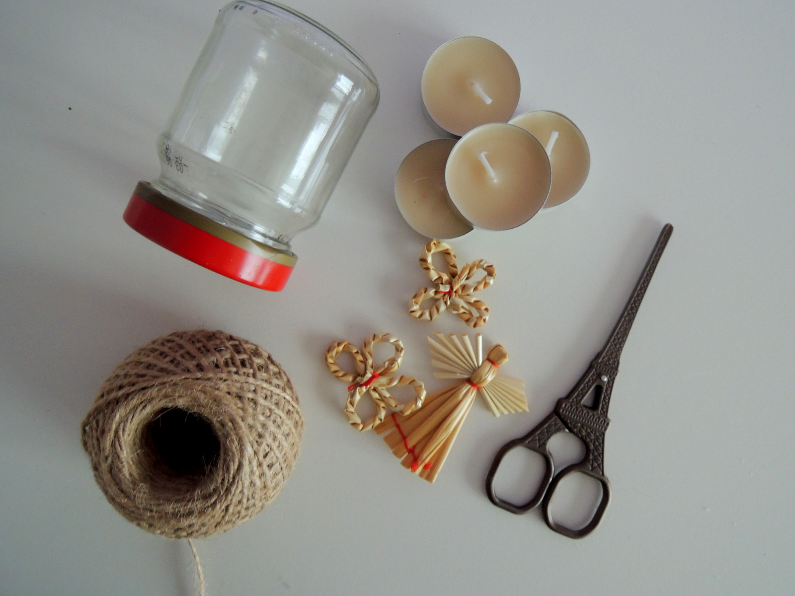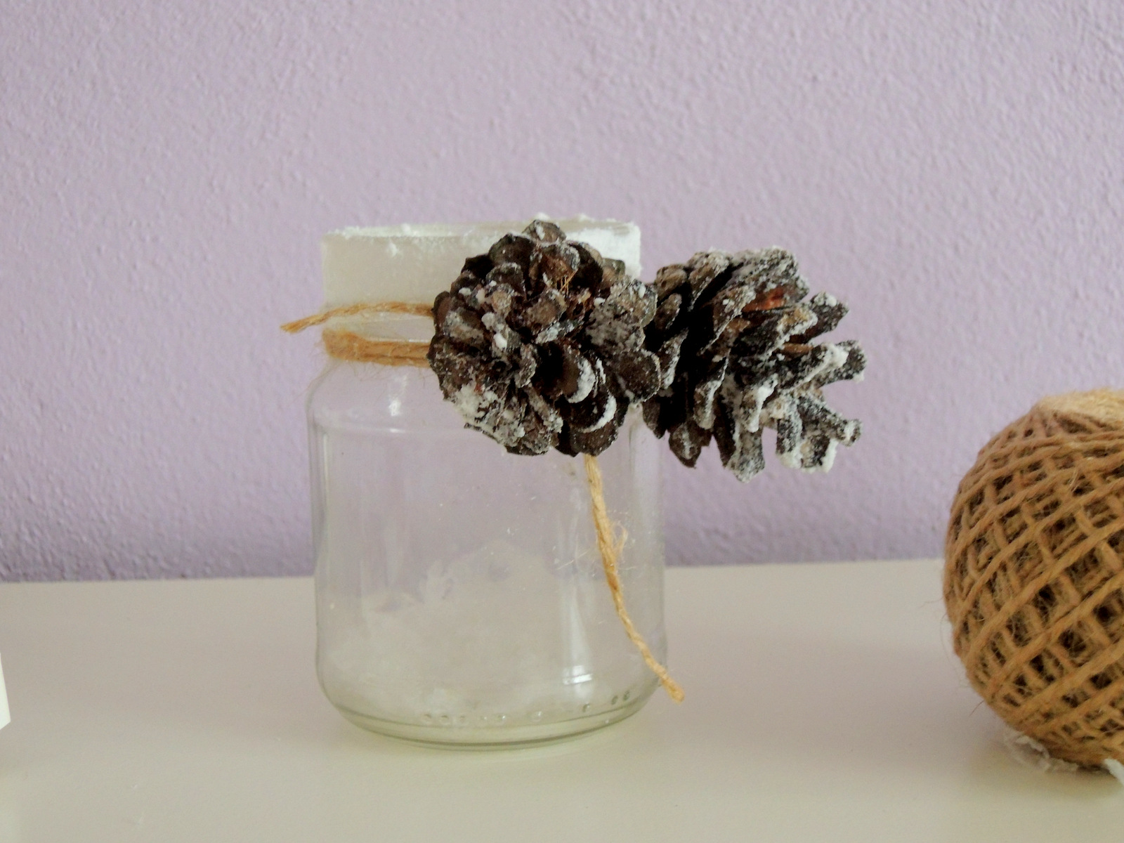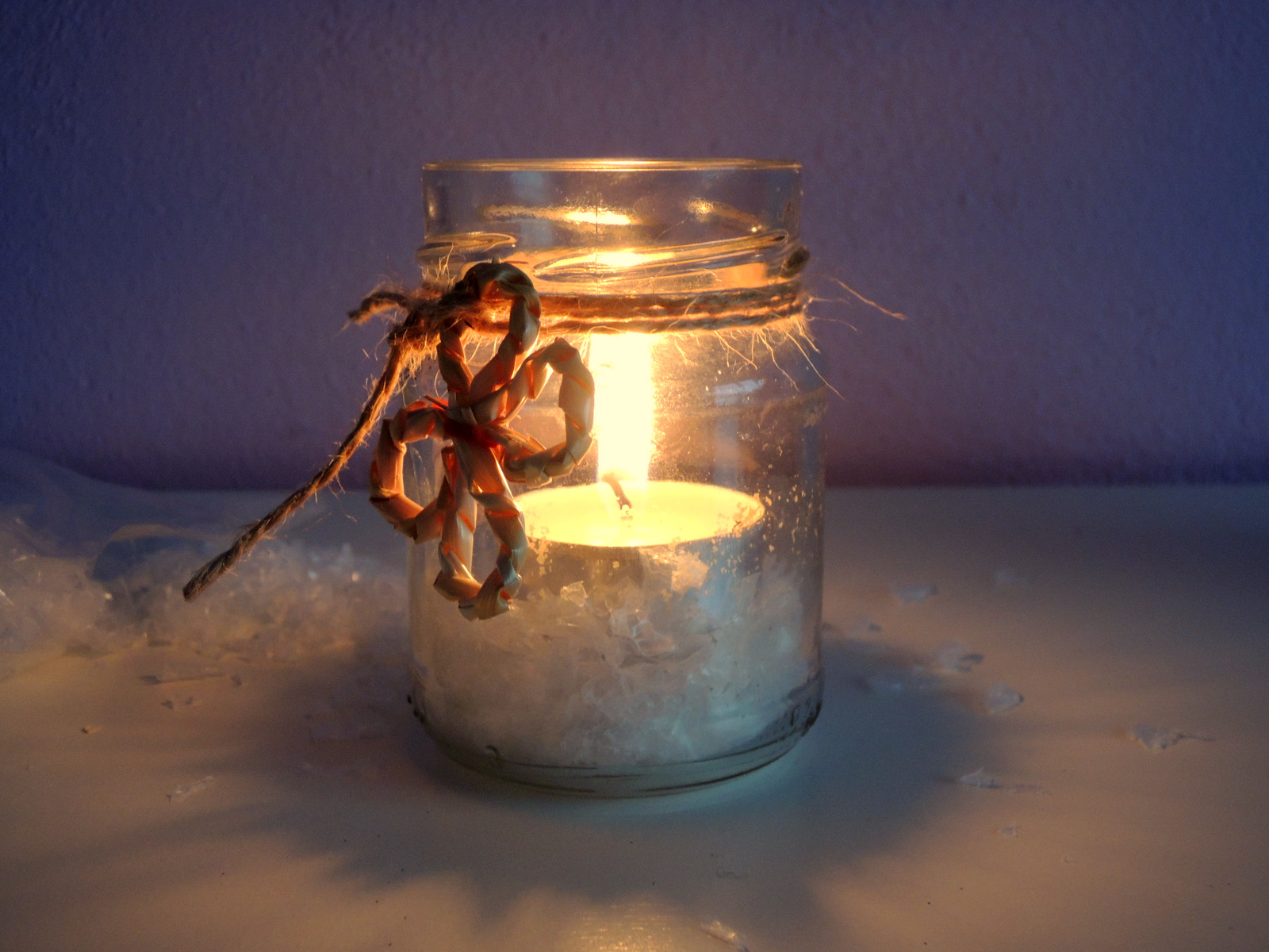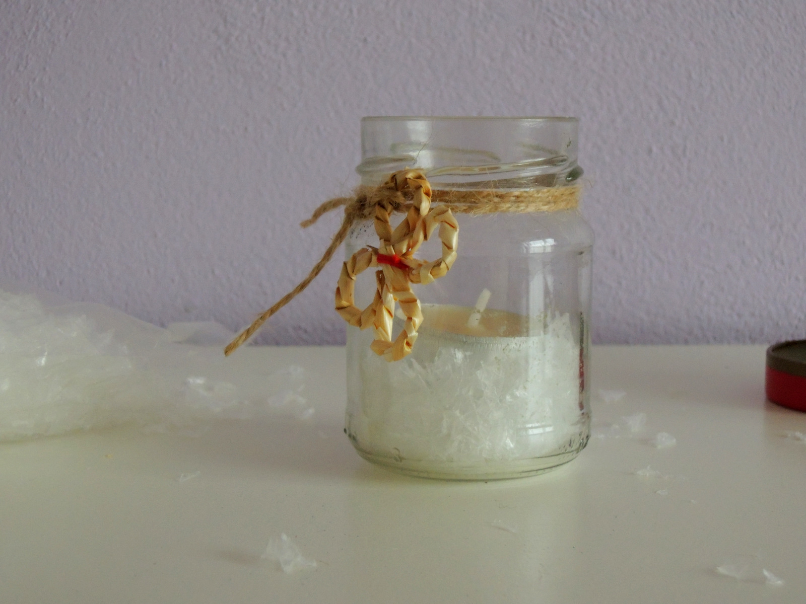 Keď máme vyčistený pohár, okolo jeho hrdla obmotáme niekoľkokrát prírodný špagát. Na koniec priviažeme ozdobu, napr. ja som použila slamené kvietky. Takto pripravený pohár naplníme dekoračným snehom a vložíme čajovú sviečku. Pohár je krásny 🙂