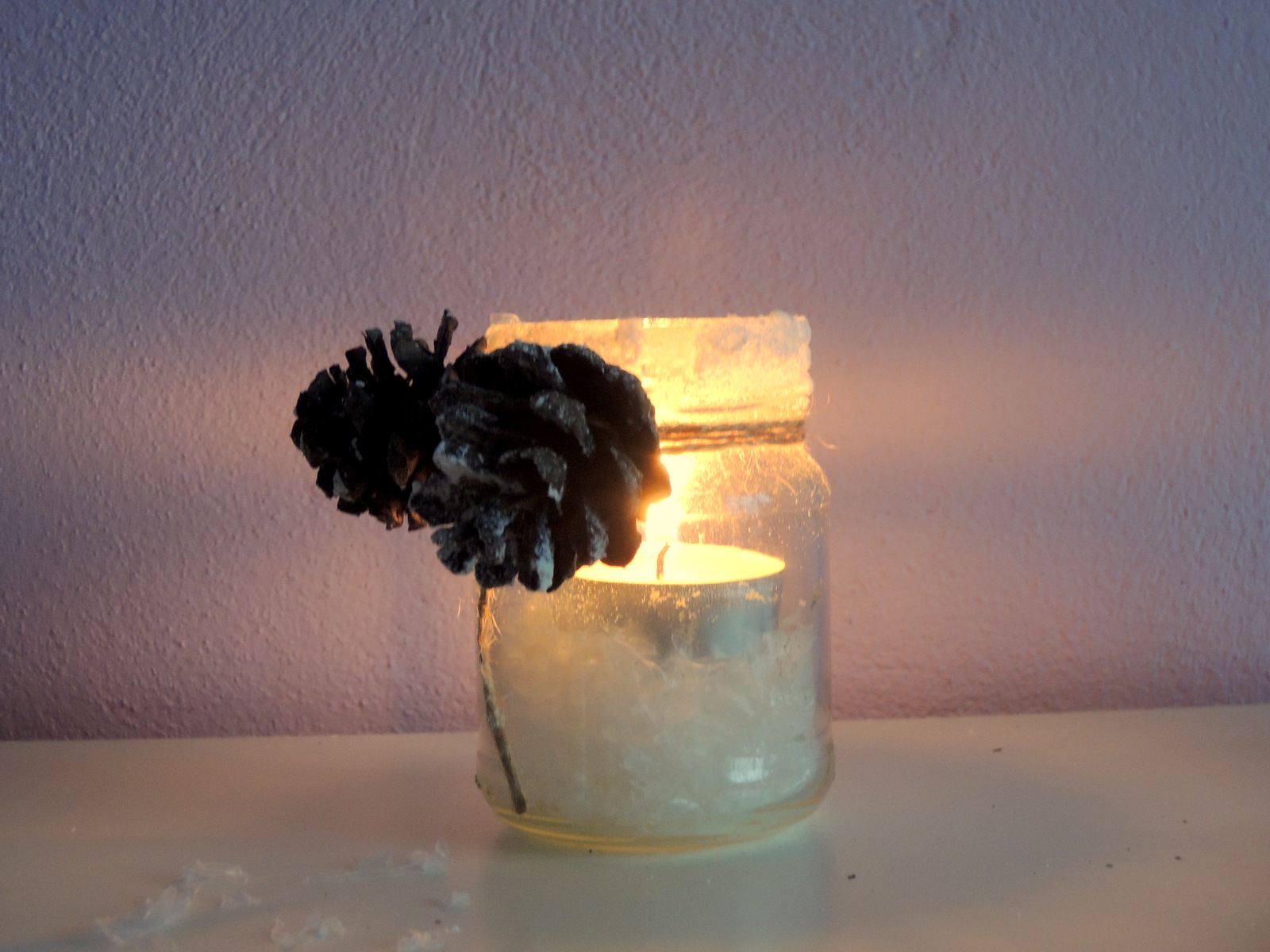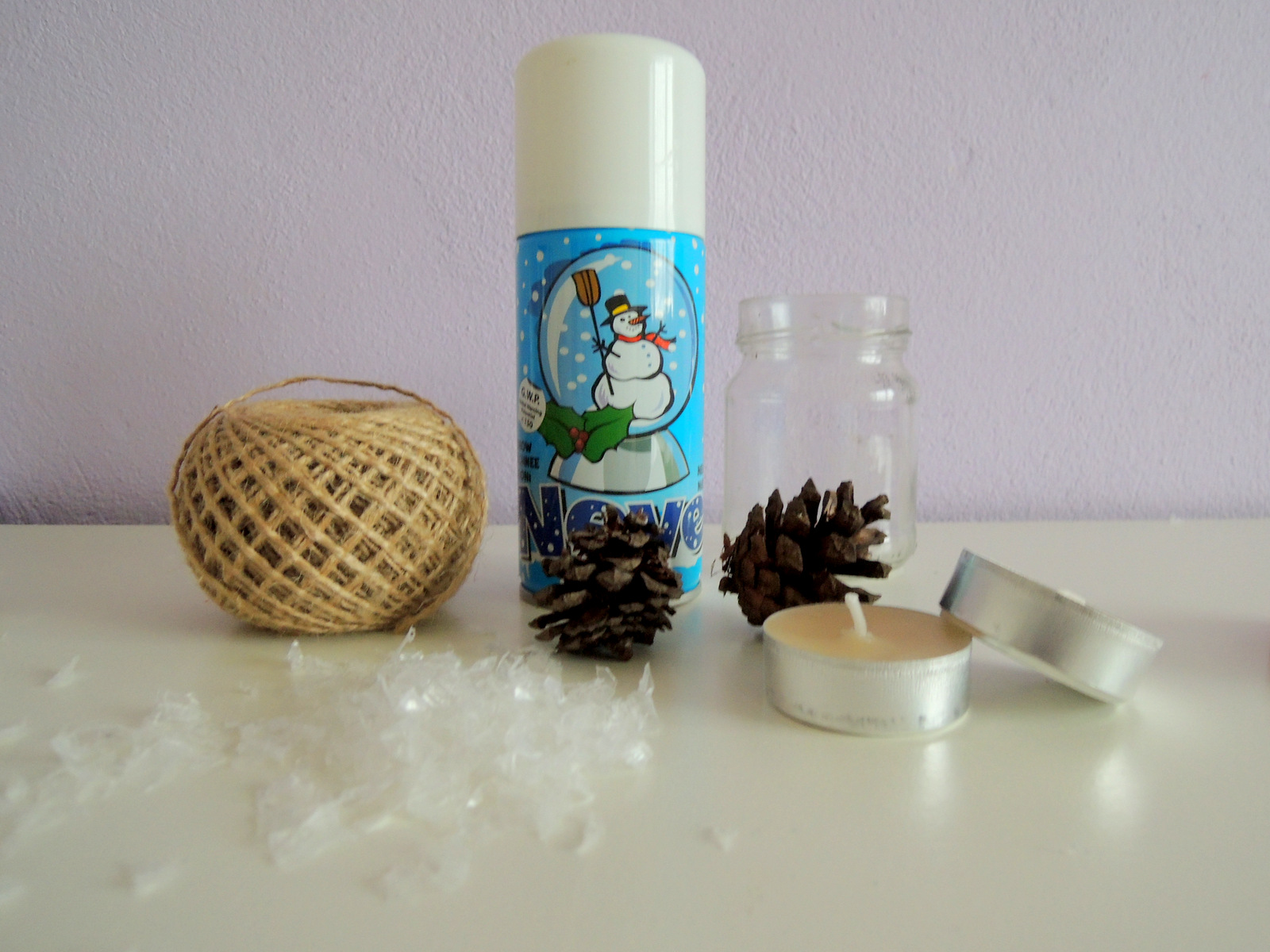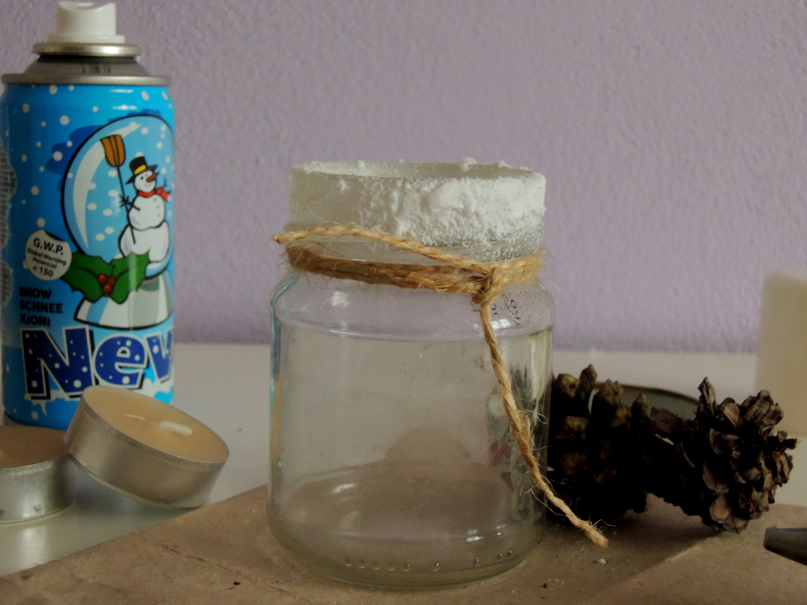 Na umytý pohár opäť obviažeme niekoľko krát špagát. V hornej časti vytvoríme efekt snehu. Najlepšie snehom v spreji. Necháme chvíľu uschnúť a potom na špagát prilepíme pomocou tavného lepidla niekoľko malých šišiek, ktoré takisto ozdobíme snehom v spreji. Nakoniec naplníme pohár dekoračným snehom a vložíme čajovú sviečku.