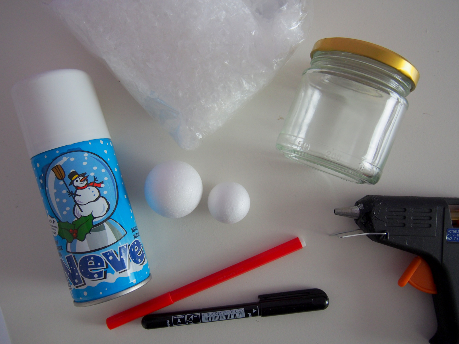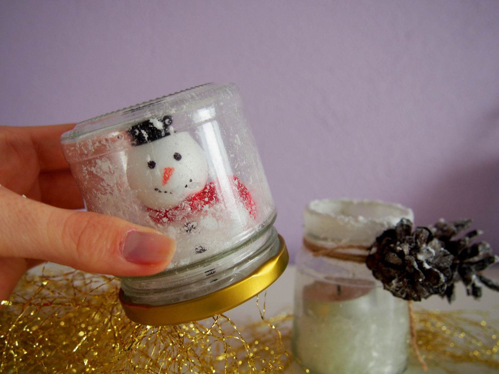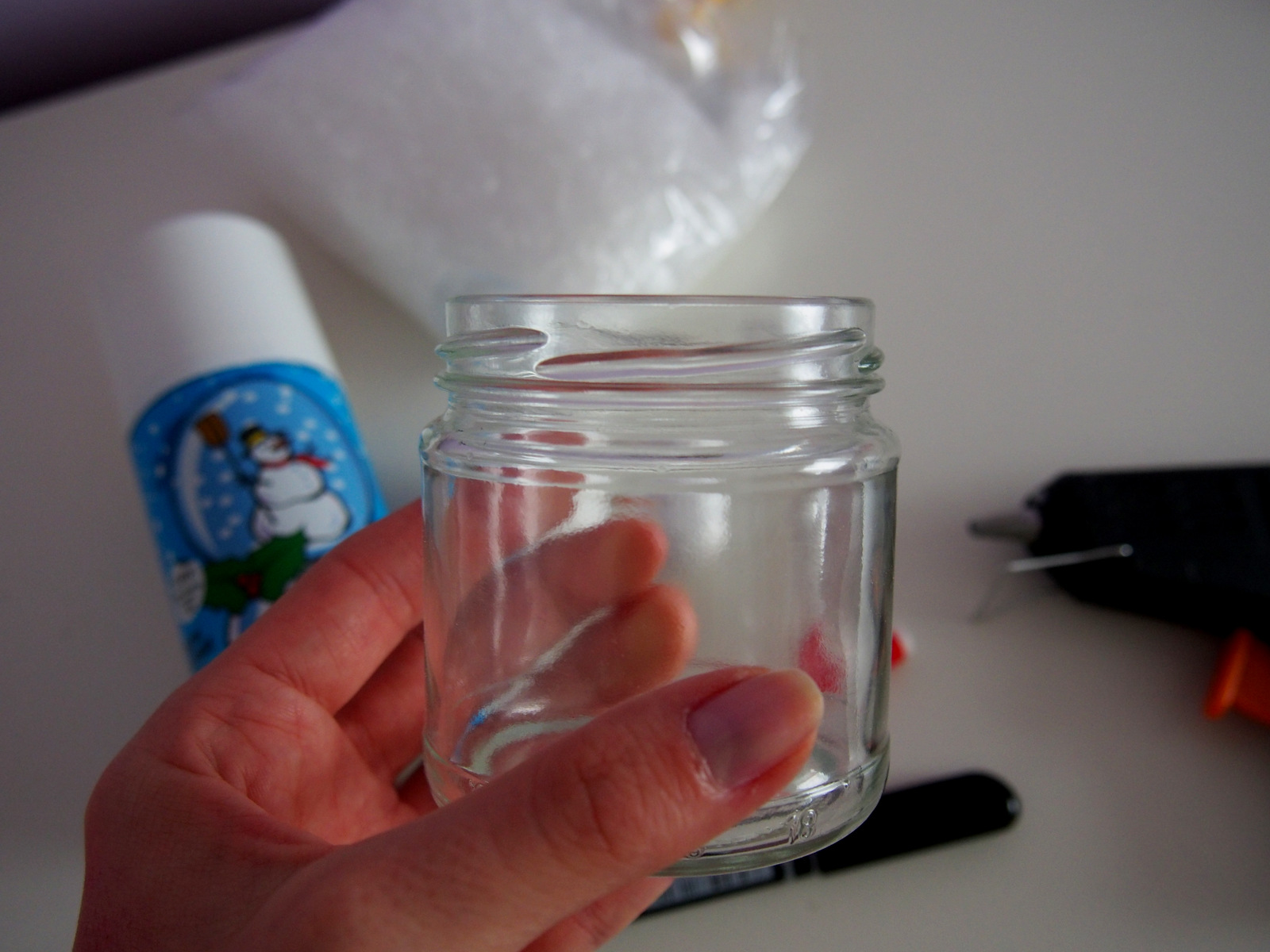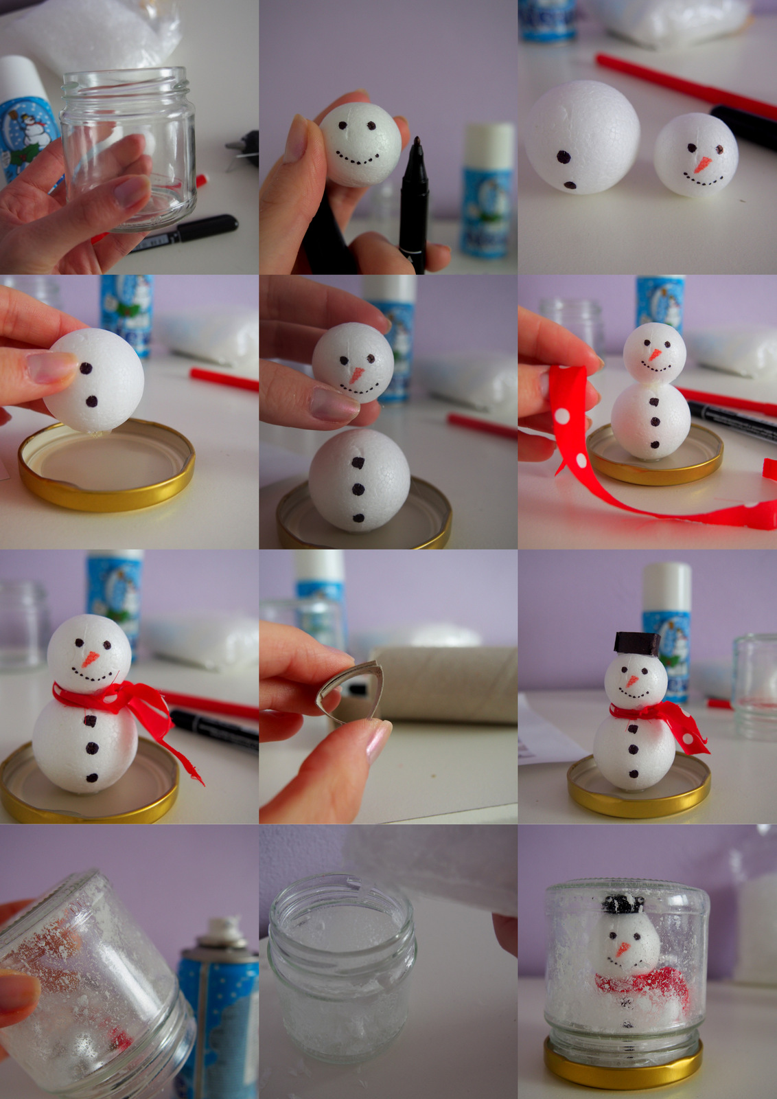 Vyzerá to zložito, ale je to jednoduché. Umyjeme pohár. Ak máme viečko farebné, nafarbíme ho napríklad na zlato alebo strieborno pomocou dekoračných sprejov (ja som mala zlaté takže som nefarbila). Viečko otočíme spodnou časťou a nalepíme snehuliaka 🙂 Fixkou mu vytvoríme tvár a gombíky a  z kúsku hocijakej látky vytvoríme šál. Klobúk môžeme vytvoriť z kartónu alebo čohokoľvek, len pozor na výšku pohára, aby sa vám dal zakrútiť. Potom v pohári vytvoríme sneh pomocou snehu v spereji a zasnežený snehuliak je na svete 🙂