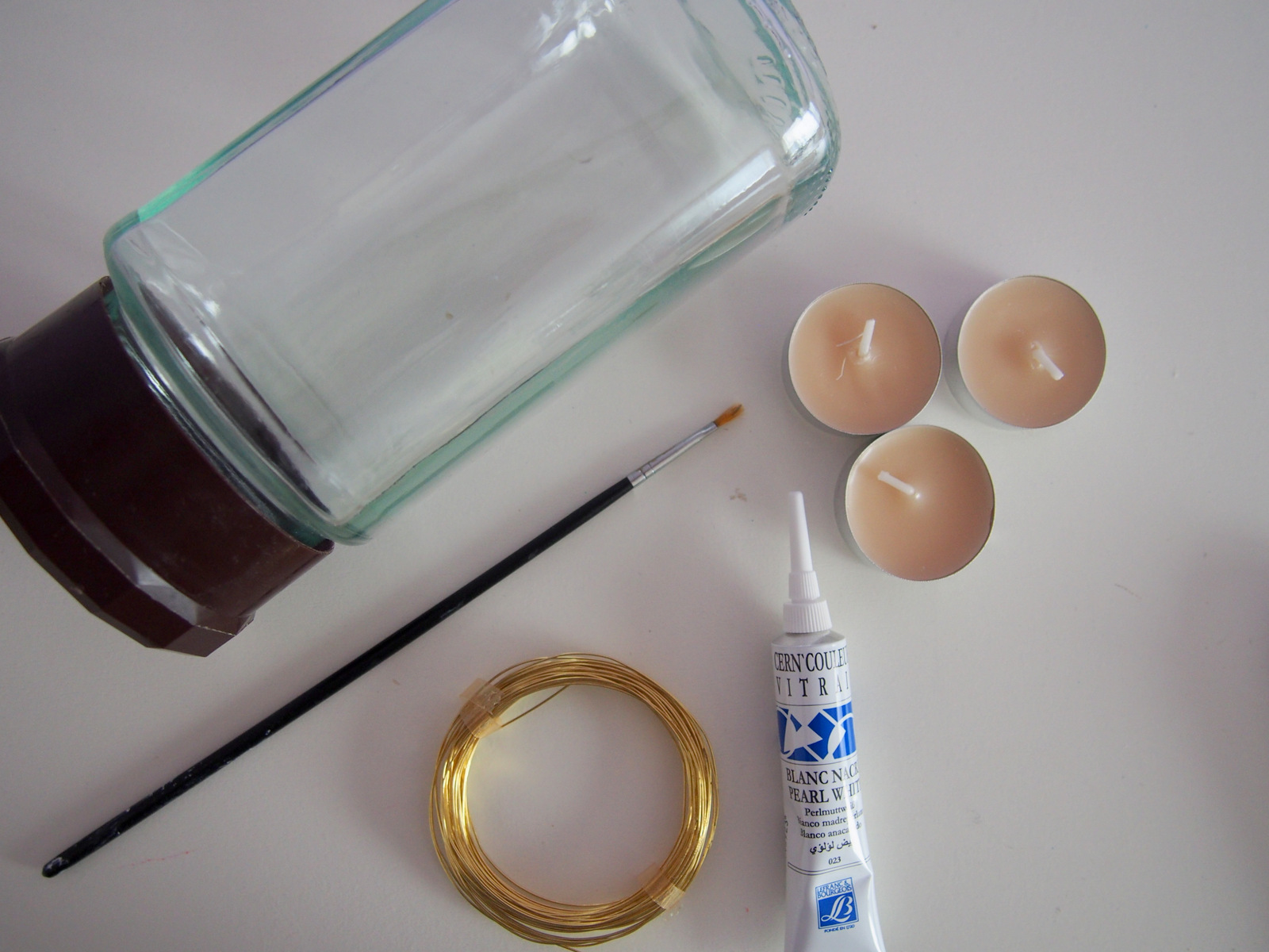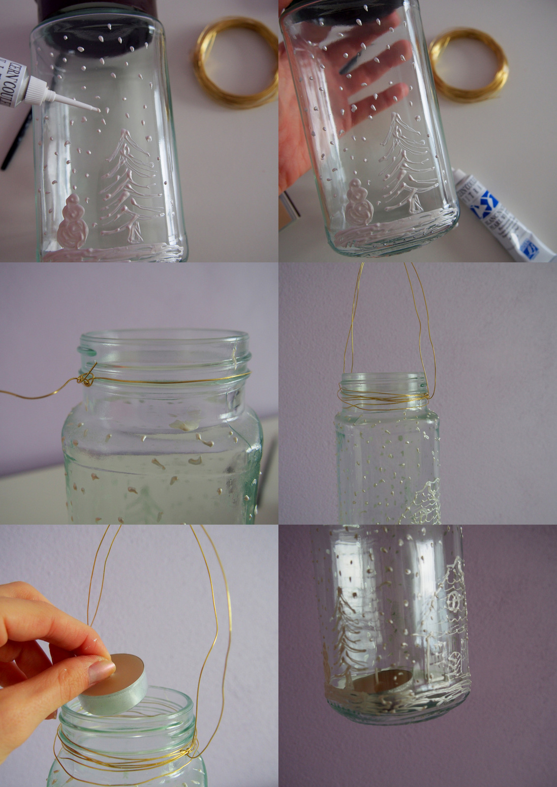 Na umytý pohár nakreslíme vianočnú dedinku alebo zvončeky alebo stromčeky a sneh si tento krát vytvoríme farbou 🙂 Potom okolo hrdla pohára obmotáme drôtik a vložíme sviečku. Dekorácia je hotová 🙂