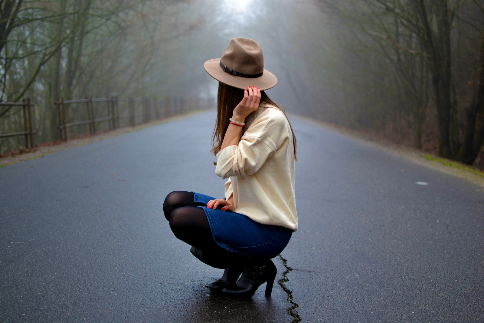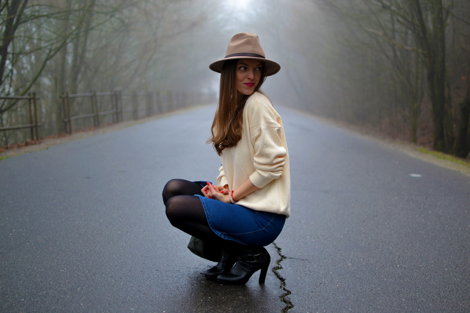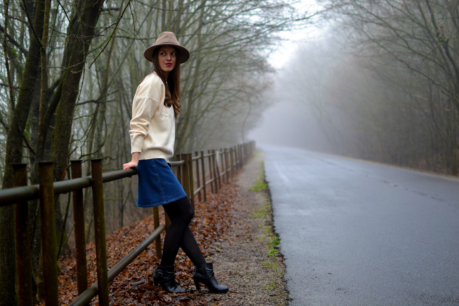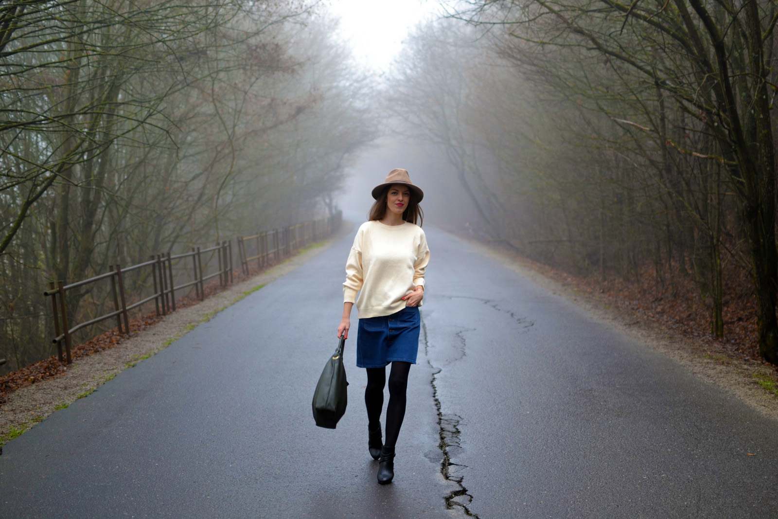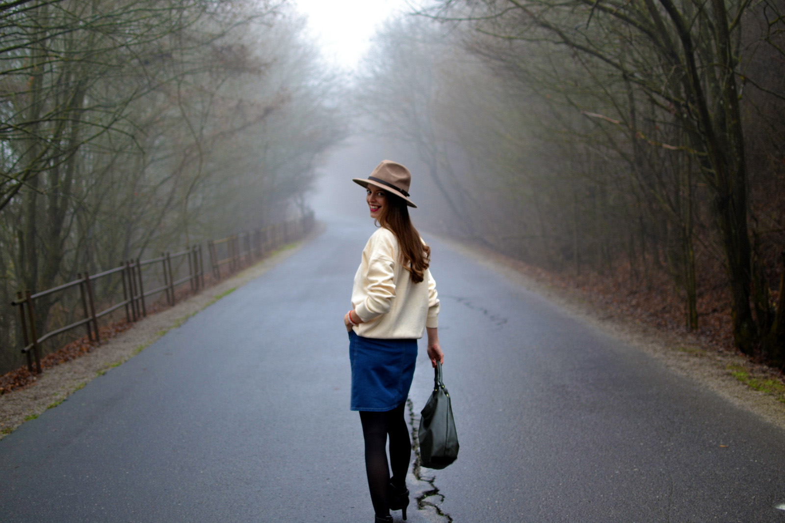 Hmla nie a nie ustúpiť. Ale v podstate keď sa pozriem z okna von, vyzerá to ako keby bol sneh všade navôkol alebo ako snehová chumelica 🙂 To vás však baví sledovať tak deň, no skoro dva týždne? to je veľa asi na nás všetkých. Tohtoročný posledný outfit sme nafotili s bratom a opäť sme využili mystickú hmlu 🙂 Obľúbenú rifľovú sukňu z leta som skombinovala s čiernymi pančuchami a teplým svetrom. Doplnky tvorila olivovozelená kabelka oriflame a svetlohnedý klobúk, ktorý je už tretí v mojej zbierke klobúkov 🙂 Tento je podobný ako vínový, len má trošku vyššiu vrchnú časť a po obvode má namiesto stuhy koženkový remienok. Mám veľmi rada kúsky, ktoré sa dajú nosiť v lete aj v zime 🙂