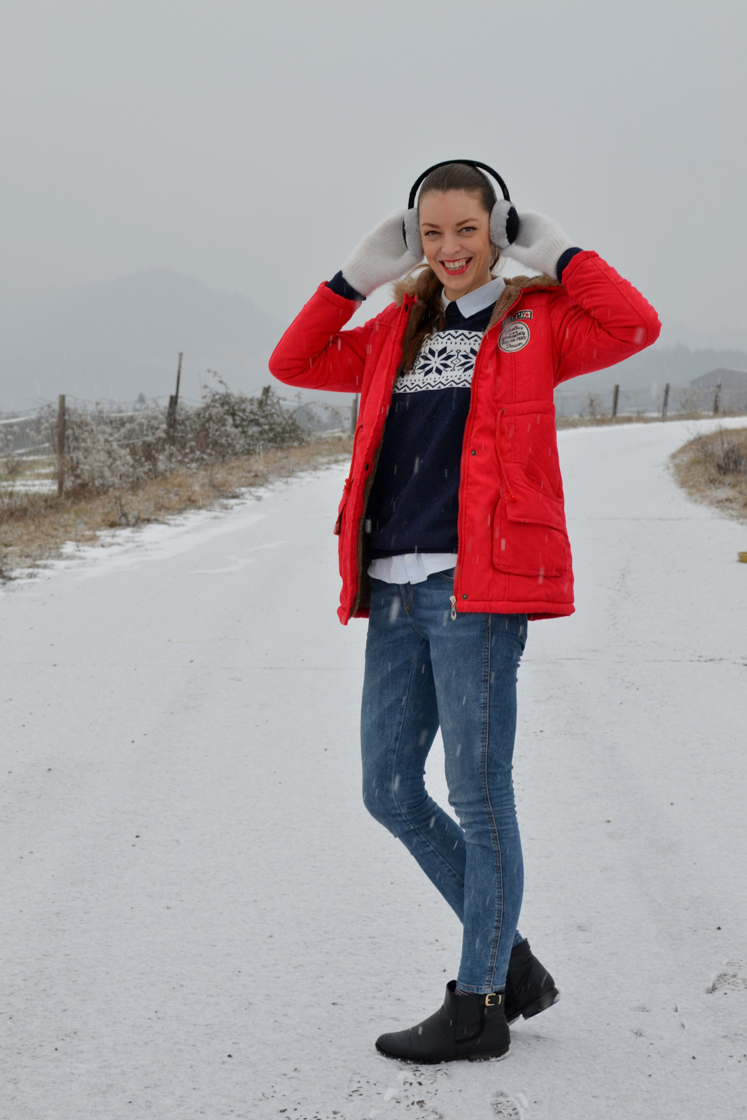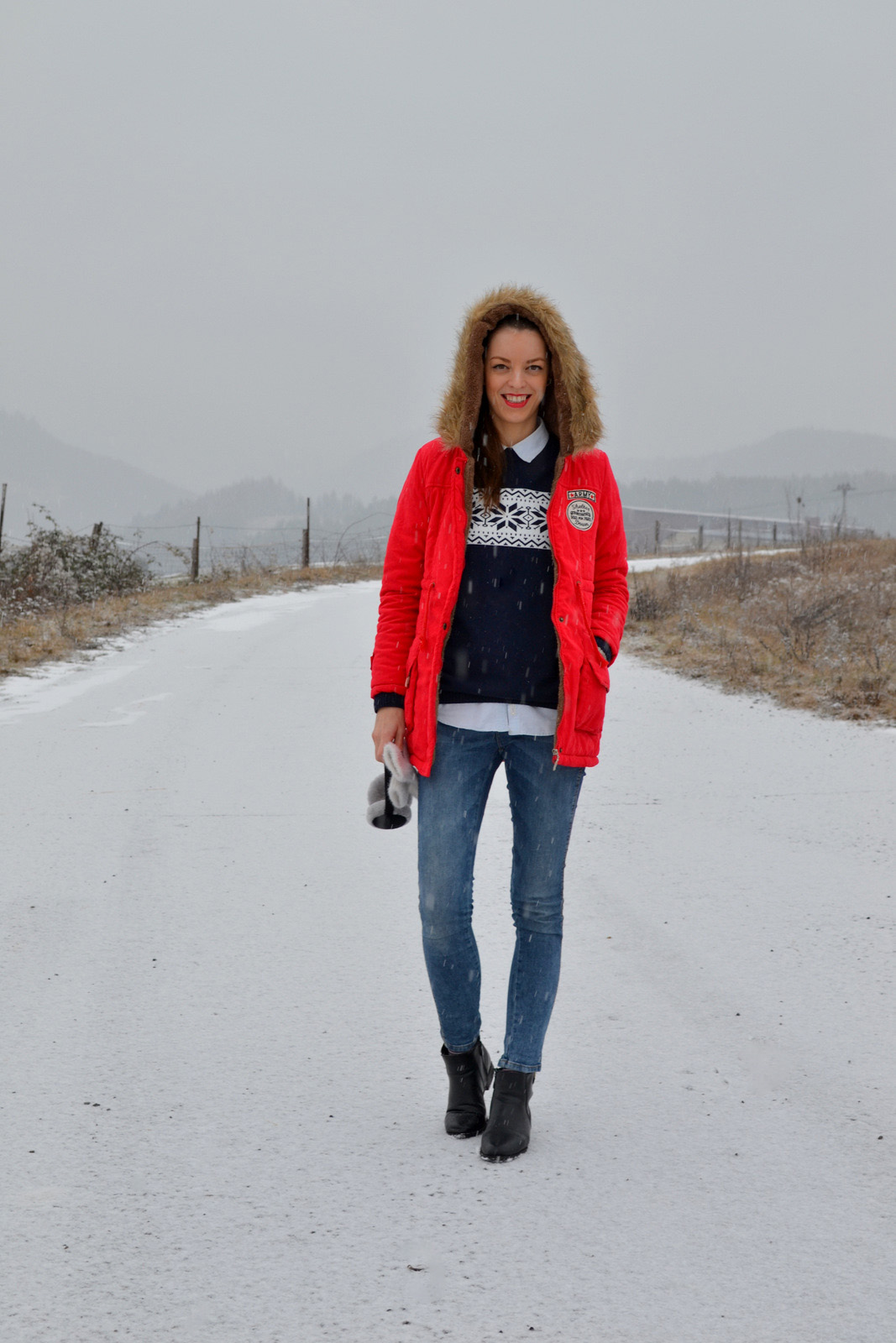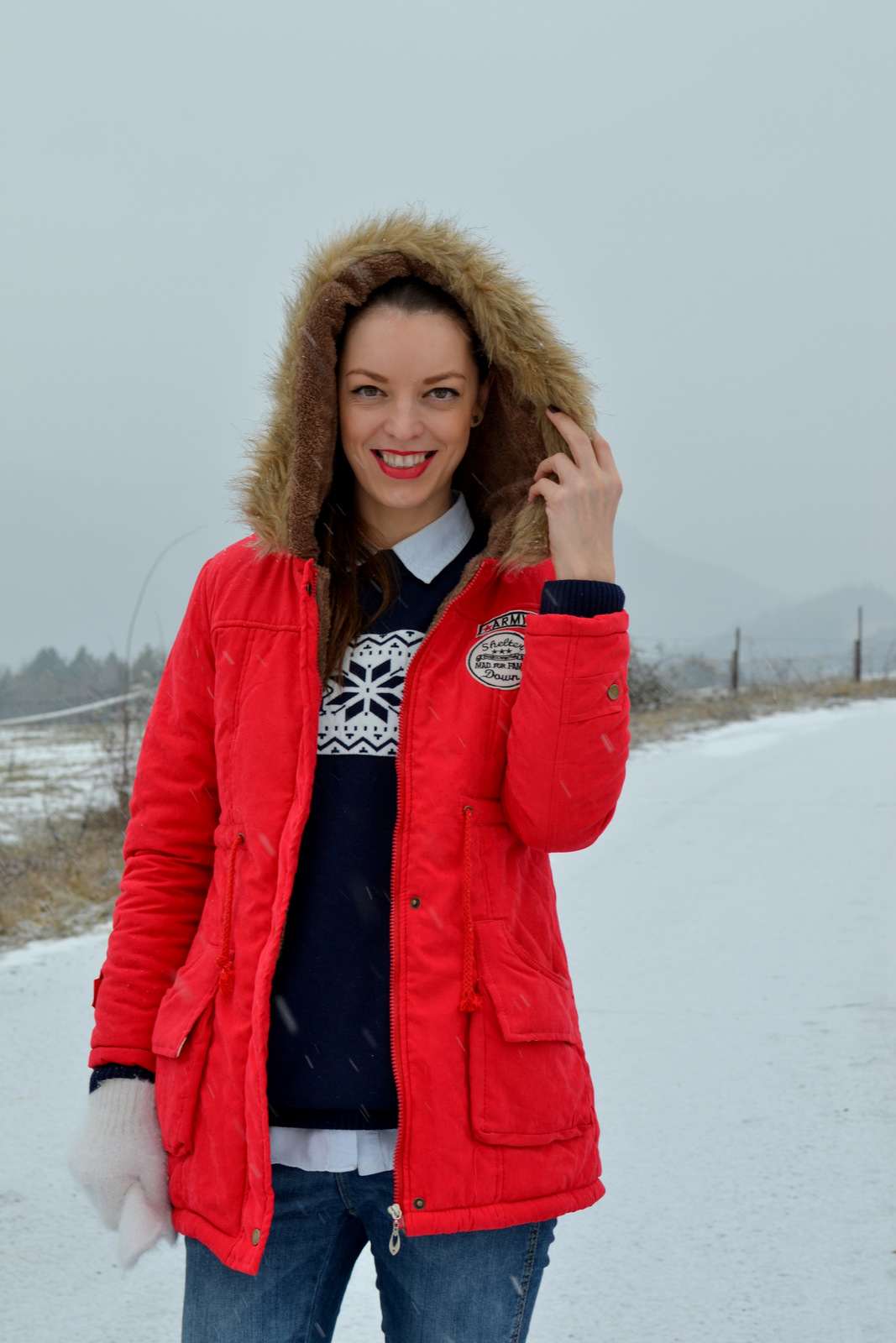 Červená vetrovka je ten správny kontrast do bielej zimy 🙂 Nielen, že vás rýchlejšie nájdu keby ste sa stratili v (zasneženom) lese, ale aj krásne rozžiari ulice plné pochmúrnych farieb. Kedysi (naozaj to je už dávno) som si robila srandu z ľudí s červenými zimnými vetrovkami, že vyzerajú ako z horskej služby. A je to tu, pridala som sa k nim aj ja 🙂 Po posledných odporúčaniach od kolegýň “čo vymýšľaš, veď sa ti červená hodí” (nikdy som ju nenosila) som sa rozhodla, že po červených letných šatách s rozkošnými bodkami a červených (červeno-oranžových) zimných šatách, si objednám červenú zimnú vetrovku. Má úplne dokonalú červenú farbu, nie je ani “do bordova” ani “do oranžova” jednoducho, takto si predstavím, keď sa povie červená. Zvnútra je celá teplučká a mäkučká, ako plyšový medvedík, má super vrecká a kožušinku okolo kapucni, ktorá je pevne prišitá. Jediný “problém” je, že mi poslali nesprávnu veľkosť, čo asi vidíte na dĺžke rukávov a umiestnenia šnúrky, ktorá má byť v páse, preto sme sa s e-shopom dohodli, že mi pošlú správnu veľkosť a túto červenú krásku môžete vyhrať v súťaži vy, moji čitatelia. Tešíte sa? Pravidlá nájdete na konci článku 🙂 Vašej pozornosti by nemal uniknúť ani tmavomodrý sveter so zimným motívom. Prekvapil ma materiál, ktorý je veľmi príjemný na dotyk. Sveter sa hodí ku košeli alebo aj na šaty. Btw. na ušiach mám slúchadlá, ktoré nie sú len také obyčajné, aby mi nebola zima. K slúchadlám je aj kábel t.j. môžem počúvať hudbu a ešte mi je aj teplo.