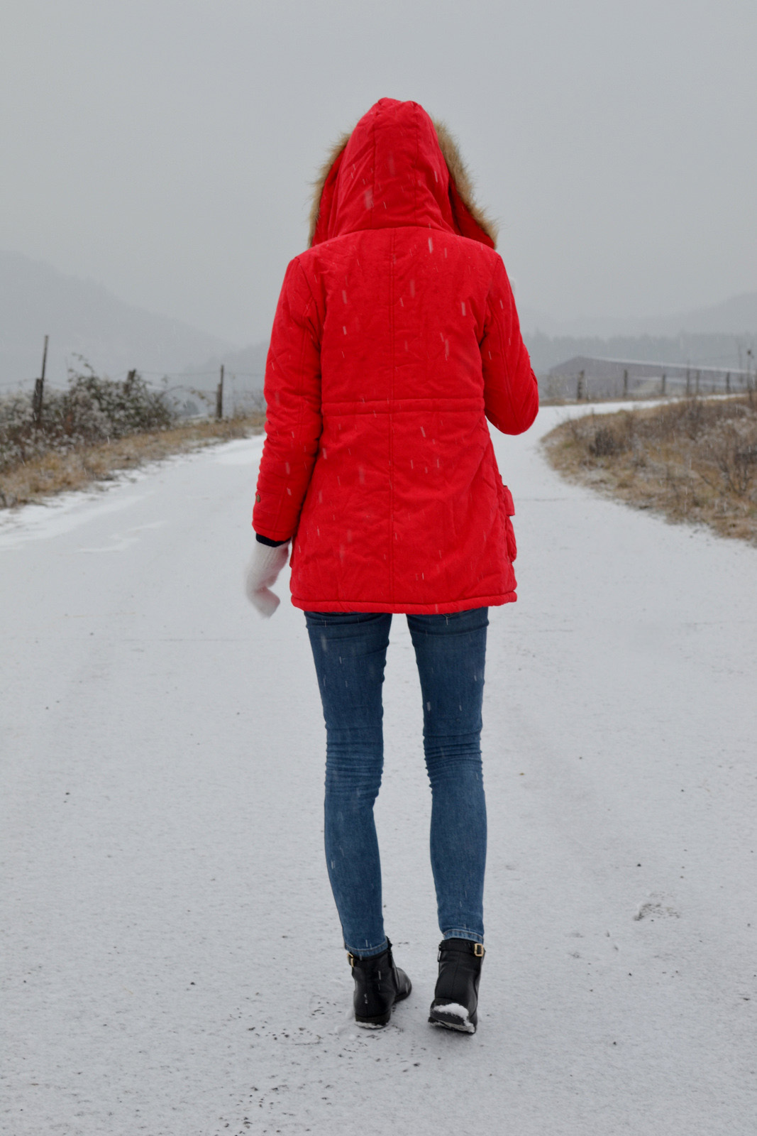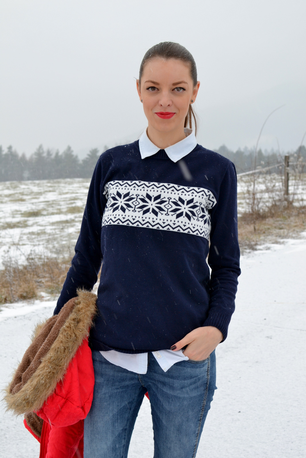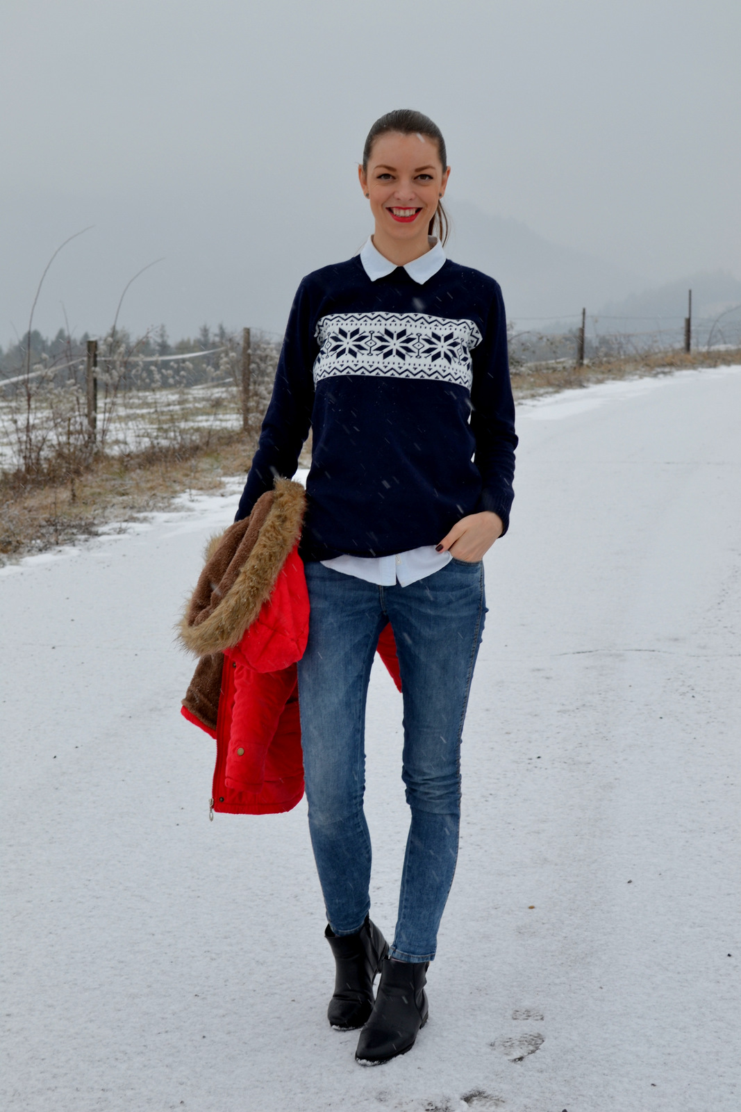 Červená vetrovka je ten správny kontrast do bielej zimy 🙂 Nielen, že vás rýchlejšie nájdu keby ste sa stratili v (zasneženom) lese, ale aj krásne rozžiari ulice plné pochmúrnych farieb. Kedysi (naozaj to je už dávno) som si robila srandu z ľudí s červenými zimnými vetrovkami, že vyzerajú ako z horskej služby. A je to tu, pridala som sa k nim aj ja 🙂 Po posledných odporúčaniach od kolegýň “čo vymýšľaš, veď sa ti červená hodí” (nikdy som ju nenosila) som sa rozhodla, že po červených letných šatách s rozkošnými bodkami a červených (červeno-oranžových) zimných šatách, si objednám červenú zimnú vetrovku. Má úplne dokonalú červenú farbu, nie je ani “do bordova” ani “do oranžova” jednoducho, takto si predstavím, keď sa povie červená. Zvnútra je celá teplučká a mäkučká, ako plyšový medvedík, má super vrecká a kožušinku okolo kapucni, ktorá je pevne prišitá. Jediný “problém” je, že mi poslali nesprávnu veľkosť, čo asi vidíte na dĺžke rukávov a umiestnenia šnúrky, ktorá má byť v páse, preto sme sa s e-shopom dohodli, že mi pošlú správnu veľkosť a túto červenú krásku môžete vyhrať v súťaži vy, moji čitatelia. Tešíte sa? Pravidlá nájdete na konci článku 🙂 Vašej pozornosti by nemal uniknúť ani tmavomodrý sveter so zimným motívom. Prekvapil ma materiál, ktorý je veľmi príjemný na dotyk. Sveter sa hodí ku košeli alebo aj na šaty. Btw. na ušiach mám slúchadlá, ktoré nie sú len také obyčajné, aby mi nebola zima. K slúchadlám je aj kábel t.j. môžem počúvať hudbu a ešte mi je aj teplo.