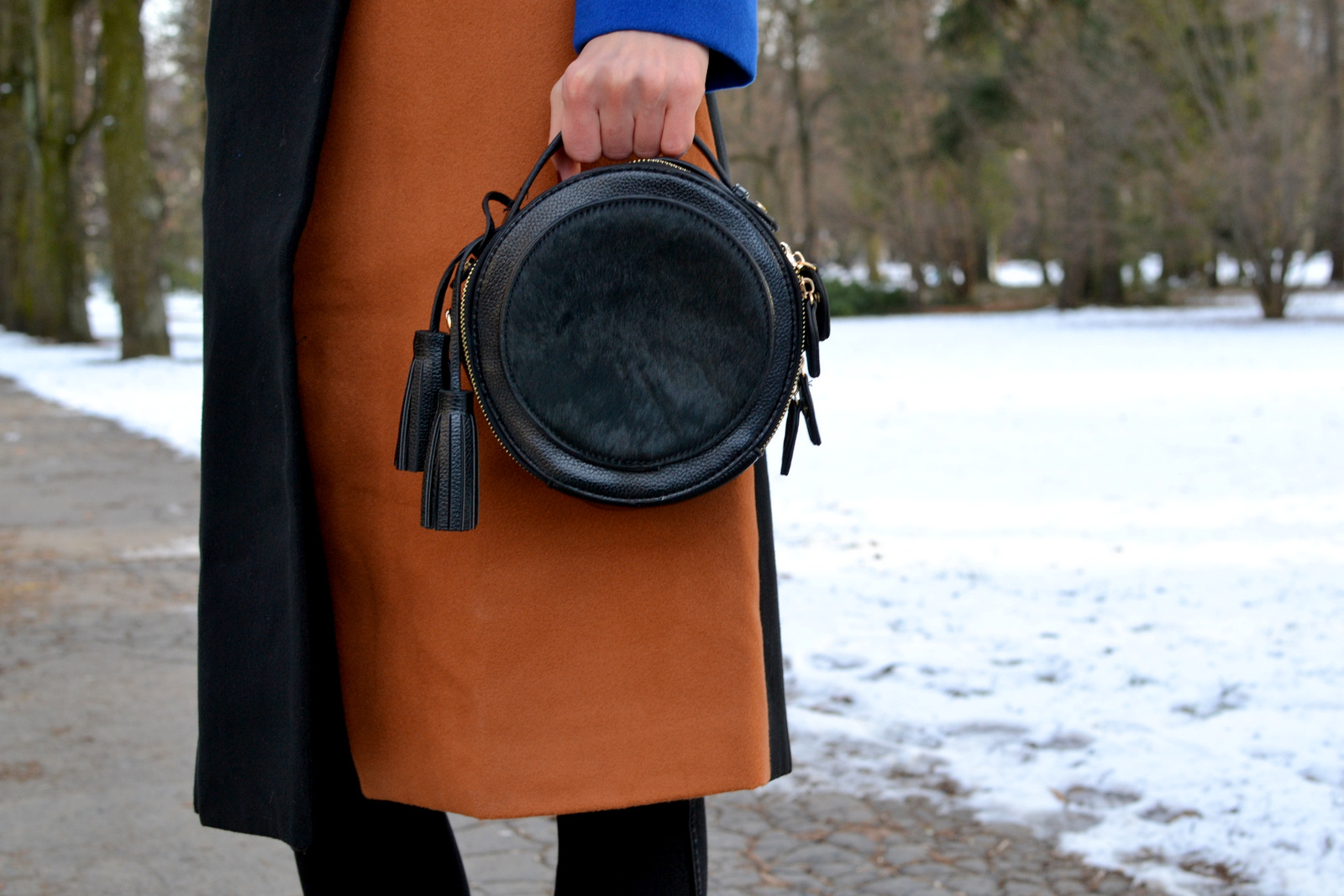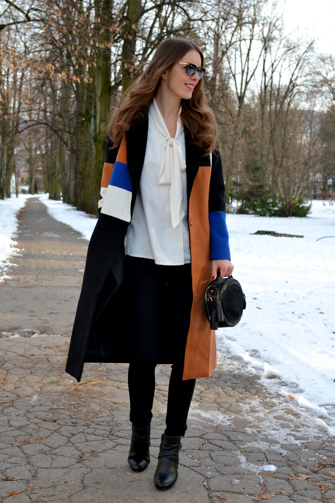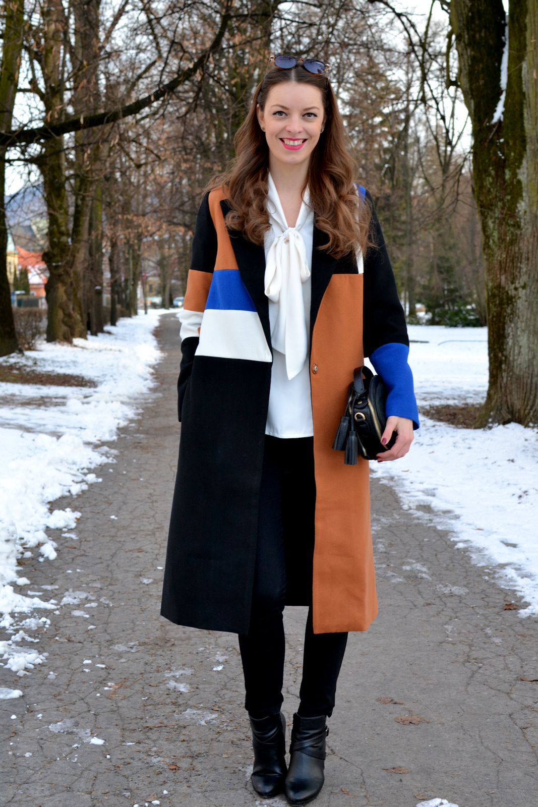 Štvorfarebný dlhý kabát je nádherný a elegantný. Doslova si pýta vysoké opätky. Najprv som si chcela obuť vysoké elegantné lodičky, veď podobné “zimné” outfity s jarnými lodičkami nájdete na množstve blogov, tak som si povedala, že prečo nie, vyzerá to skvele. No ako som vystúpila z auta, tak by ma nikto nedonútil obuť si ich a byť na tom chlade čo i len minútu 🙂 🙂 Možno to slečny fotia za slnečných teplých dní, no ja teraz viem, že outfity s lodičkami budem fotiť v zime iba v interiéri 🙂 Kabát som nakoniec skombinovala s čiernymi nohavicami, členkovými čižmami a smotanovou blúzkou s veľkou mašľou z vlastnej kolekcie 🙂 V ruke držím čiernu okrúhlu kabelku, na ktorú som sa veľmi tešila. Bohužiaľ mi prišla bez remienka cez plece, ktoré je už ale na ceste ku mne. Verím, že príde čoskoro, aby som kabelku mohla nosiť častejšie, takto v ruke to nie je veľmi praktické. Však je rozkošná, čo poviete? Ozdobená je obľúbeným strapcom a z jednej strany ma mikro kožušinku 🙂 Na vlasy som po veľmi dlhej dobe použila klasickú kulmu a myslím, že to budem praktizovať častejšie …. kučery sú bohatšie.