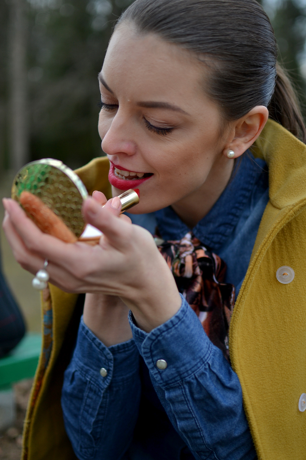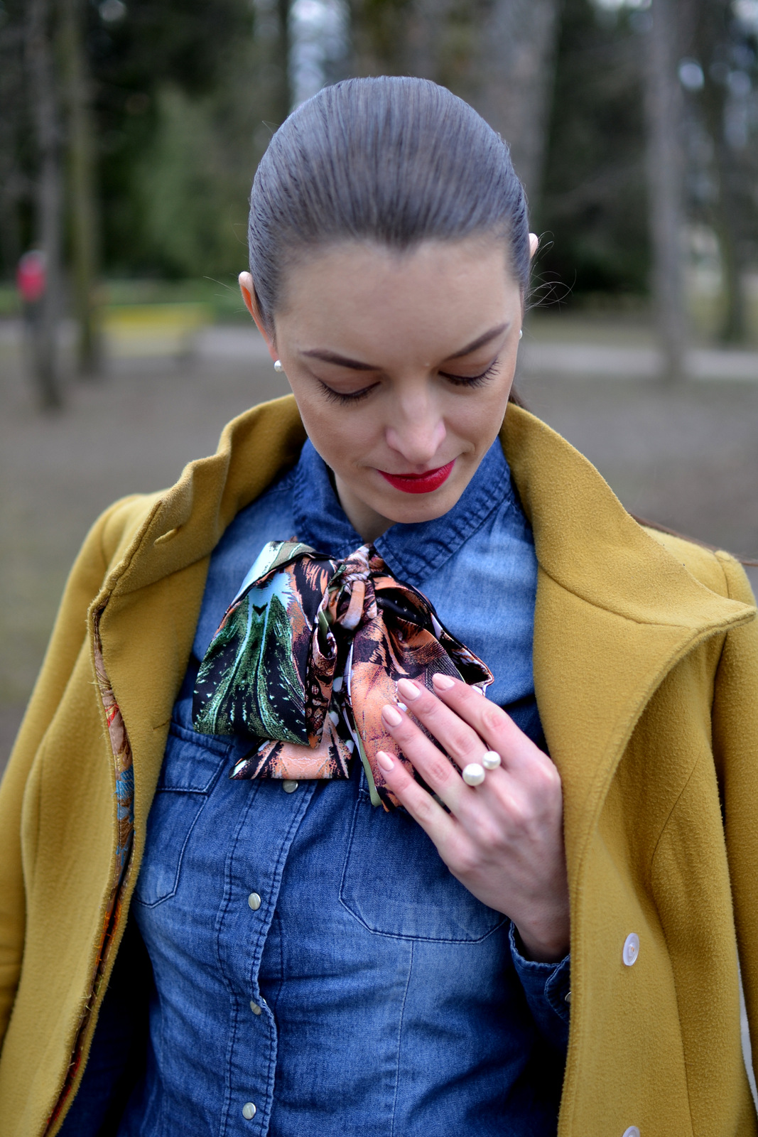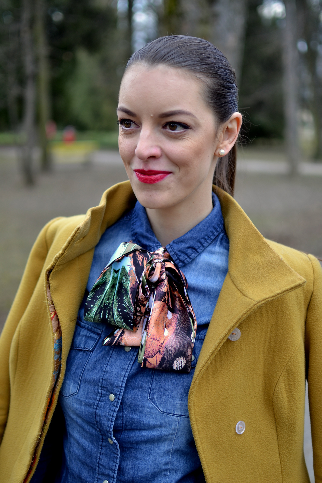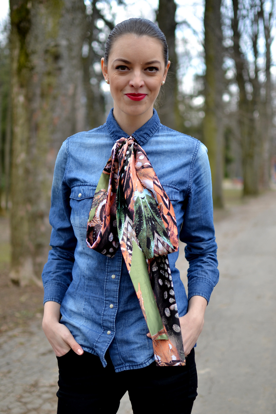 Ružovú saténovú šatku ste videli v predchádzajúcom outfite. Zelenú som zaviazala na dva krát a tým pádom vznikla dvojitá mašľa, uviazaná tesne pod golierom a kratšia ako v prvom prípade. Tenké šatky si môžete zaviazať na viacero spôsobov, záleží len na vašej fantázii. Zelená šatka je aj oveľa dlhšia ako prvá ružová, preto som zvolila dvojitú mašľu. Skombinovala som ju s tmavomodrou riflovou košeľou a čiernymi nohavicami. Tento outfit je trošku viac casual v mestskom štýle aj vďaka riflovej košeli, ktorá nepatrí práve k elegantným kúskom oblečenia. Aby som outfit ešte viac ozvláštnila doplnila som výrazné farby. Matný červený rúž oriflame a jantárový kabát so zaujímavou podšívkou. Doplnky som zvolila trendy perly (bižutériu) a škoricovo hnedú crossbody kabelku. Ktorá tenká saténová šatka sa vám páči viac? Zelená alebo ružová? A ktorý outfit sa vám viac pozdáva? Romantický zladený v ružových farbách alebo mestský s výraznými farbami? Ak sa vám môj blog páči, budem rada ak ma podporíte v súťaži bloger roka na tomto odkaze. btw. neviem prečo vyzerá, že mi je tá košeľa cez prsia úzka, pretože mi je voľná, asi som ju mala len zle upravenú :-/