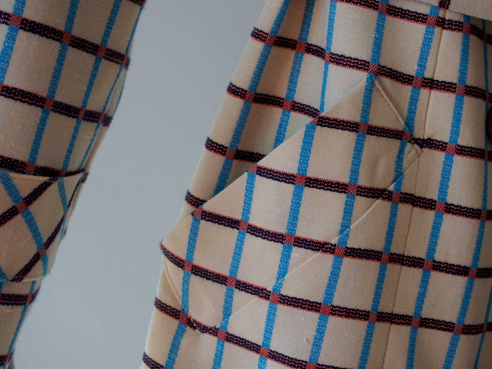 Povedala by som, že už tradične som si vybrala namiesto klasickej podšívky satén. Mám rada výrazné a kontrastné podšívky. Satén sme použili aj v béžovom zimnom kabáte, jantárovom a aj vo fialovom 🙂 Vybrala som si tyrkysový poriadne výrazný satén, ktorý ale pekne ladil s pásikom na látke. Všetko bolo kúpené a mohli sme sa pustiť do šitia resp. mama sa mohla pustiť. Ako si môžete všimnúť kabát má veľa zaujímavých detailov. Kocky sme sa rozhodli nechať rovné, ale na pravom pleci sme látku otočili a vytvorili šikmý vzor. To isté aj na detaily na rukáve. S čím sa mama naozaj pohrala sú vrecká. Pozrite tie dokonale napasované čiary … fakt umenie 🙂 Na prvý pohľad si ani nevšimnete, že sú tam vrecká. Pásik sme pripevnili na dve pútka a na kabát doplnili gombíky v pomarančovočervenom odtieni, ktoré dokonale ladia s farbou malinkej kocky na vzore látke 🙂 Pozrite tie detaily 🙂