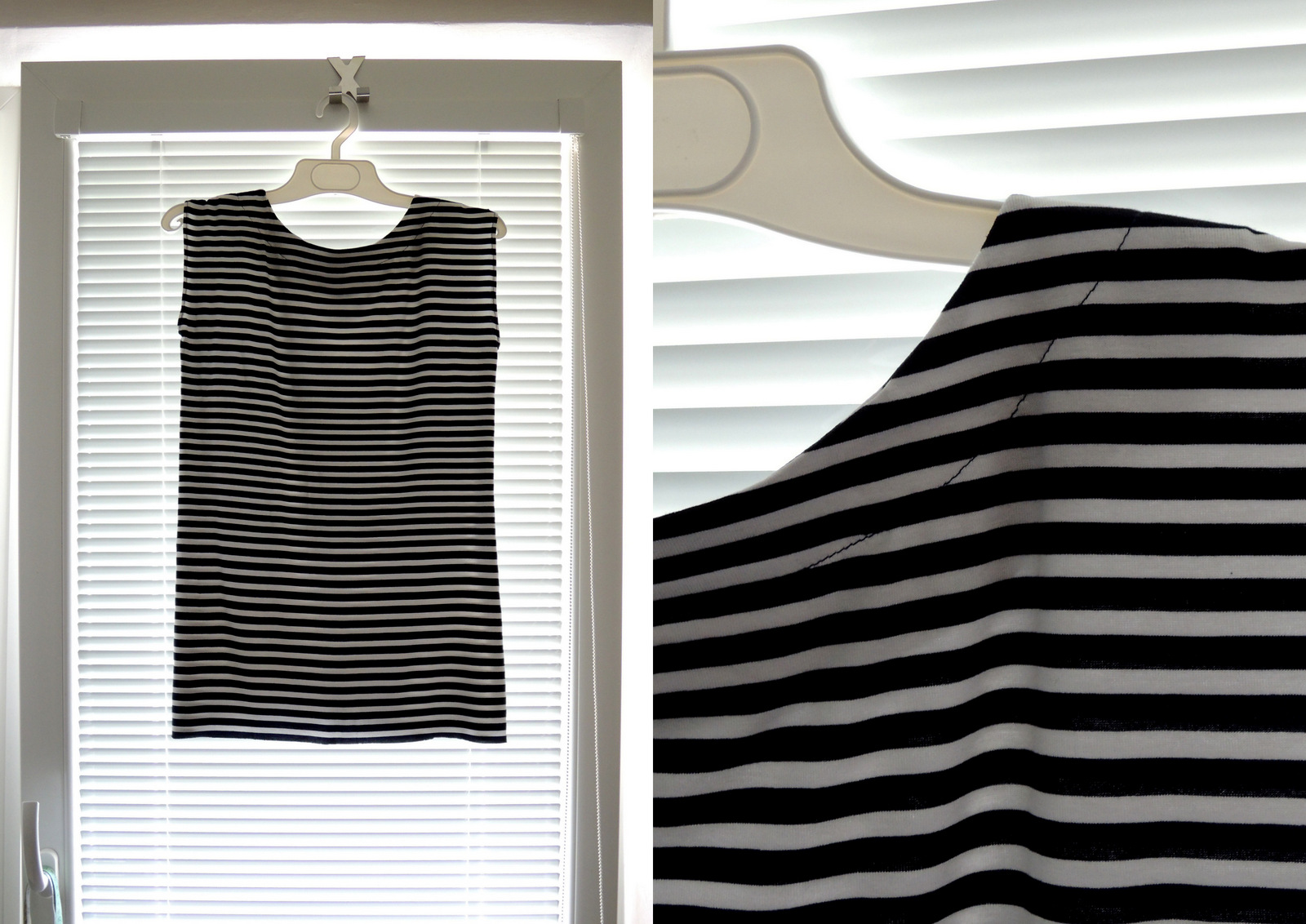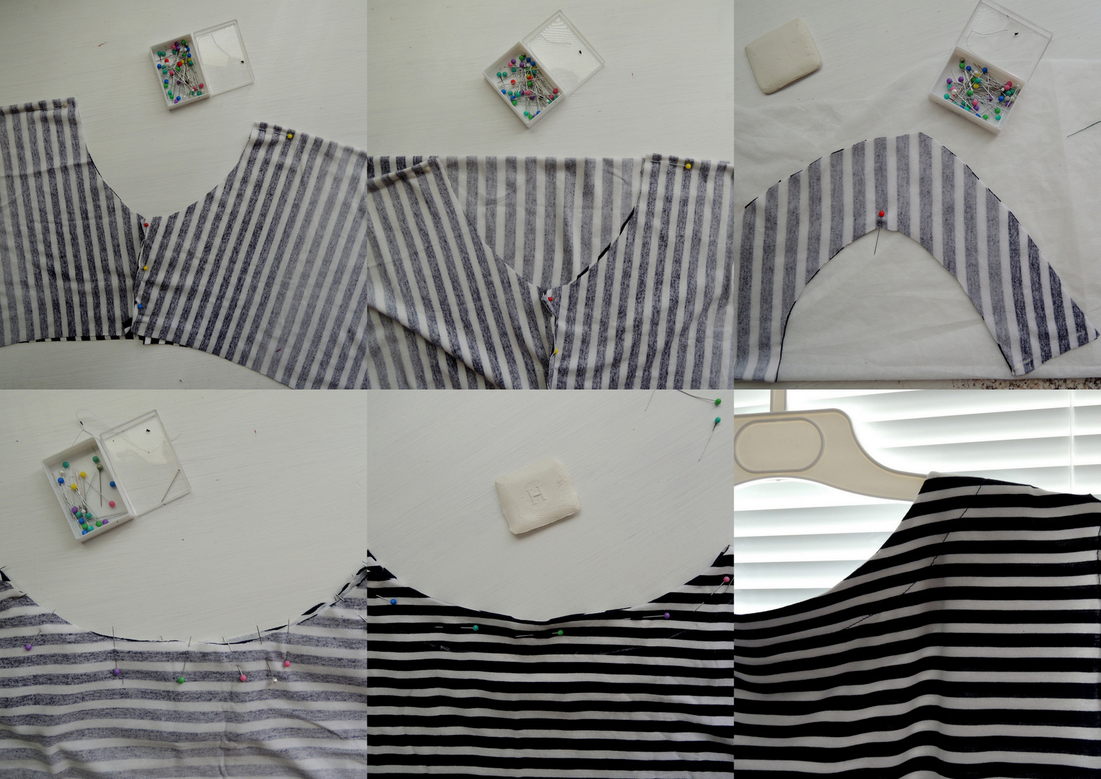 Potom zošite pletia a vystrihnite podsádku výstrihu širokú 4 cm. To isté vystrihnite aj z plátna a plátno nalepte na látku. Potom podsádku výstrihu zošite a vytvoríte tak “kruh”. Začnite prišpendlovať na látku (líce k lícu) a zošitú časť umiestnite na zadnú časť trička (vpredu to nebude pekné aj keď to nebude vidieť). Prišite okolo výstrihu od kraja cca 0,5cm a otočte dovnútra. Opať prišpendlite a zvoľte si ako široko chcete šiť, čím pripevníte výstrih. Ako vidíte na fotkách ja som zvolila trošku širšie 4cm od okraja. Výstrih aj plecia máme hotové a môžete sa pustiť do bokov. Tie spolu zošite, zaendlujte a takisto upravte aj rukáv, buď iba zaendlujte alebo aj prešite cca 0,5 cm aby boli pekné. Potom už iba upravte dĺžku a voliá tričko je na svete 🙂