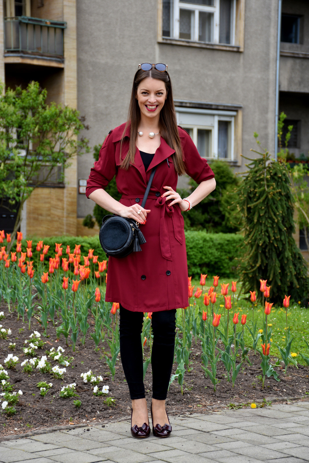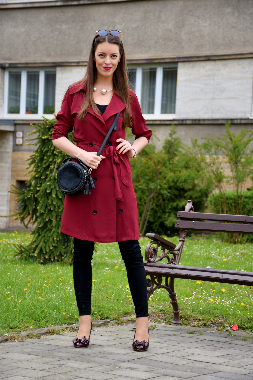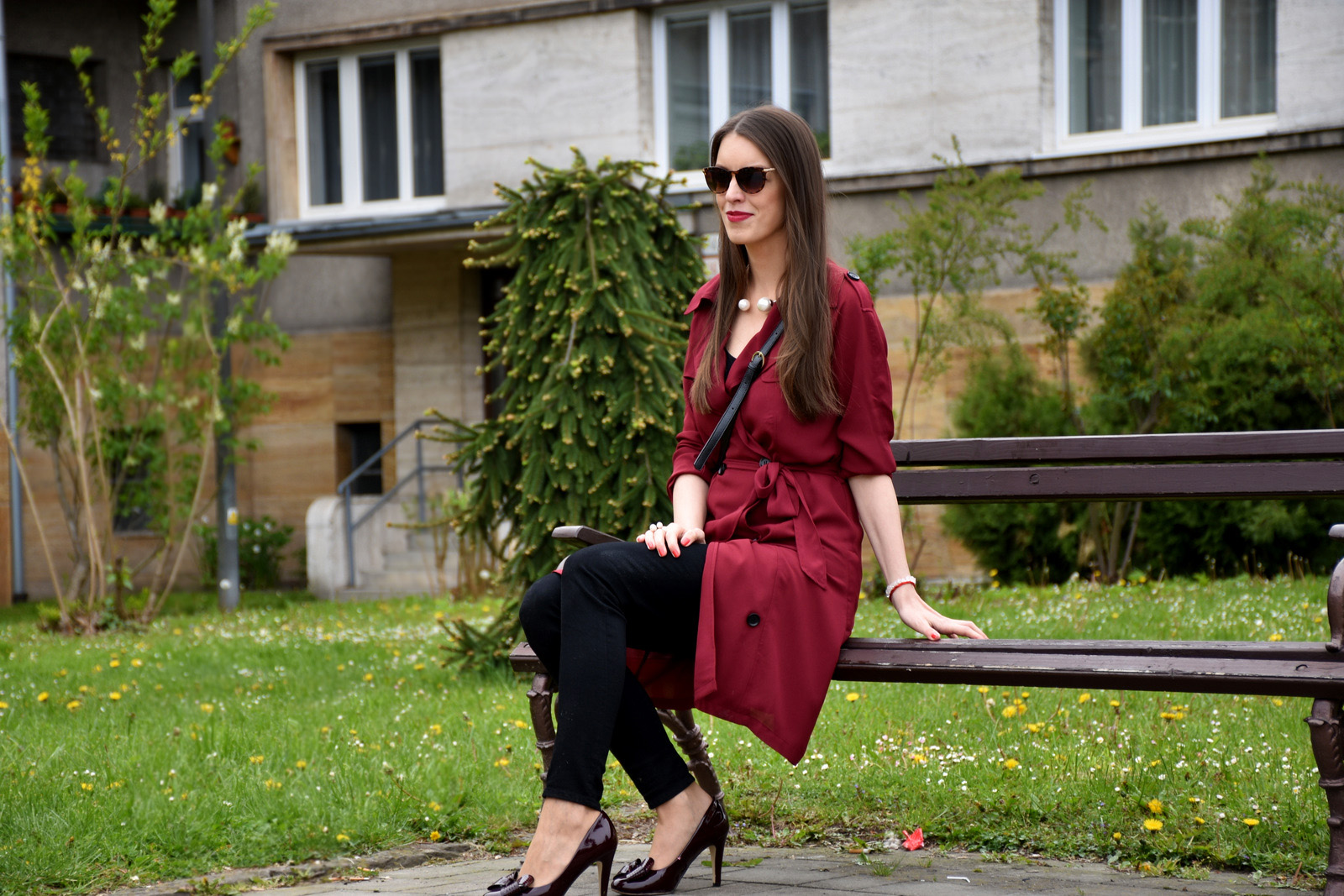 Vínový kabát na e-shope nájdete v časti outerwear, trench coat. Tešila som sa, pretože vínový kabát je naozaj príjemné osvieženie outfitu. No po rozbalení balíka prišlo sklamanie. “Kabát” je ušitý z materiálu, ktorý sa používa na blúzky ehm a k tomu ešte veľmi zlá kvalita. Farba je úplne krásna aj strih je fajn, ale tá látka?! Pýtala som sa sama seba, prečo to nezaradili k šatám alebo k tunikám. Nevadí, ja si poradím so všetkým. Kabát som zapla na všetky gombíky a uviazala na mašľu. Pod kabát som si obliekla čierne nohavice a tielko a zavinovacie šaty sú na svete. Stačí už iba odpárať gombíky a bude to dokonalé. Keby som chcela tento “kabát” nosiť ako kabát, tak si to viem predstaviť ako poistku do kabelky, ak by v lete začalo pršať a nechcela by som mať úplne odhalené ruky (v daždi nič príjemné). Inak kabátik veľmi nezohreje, čo je dosť škoda, lebo by som ho určite vynosila. Pozrite na produktové fotky, zistili by ste, že to nebude kabát z klasickej kabátovej látky? K outfitu som doladila perličkovú bižutériu , okrúhlu kabelku so strapcami a najpohodlnejšie topánky aké mám 🙂