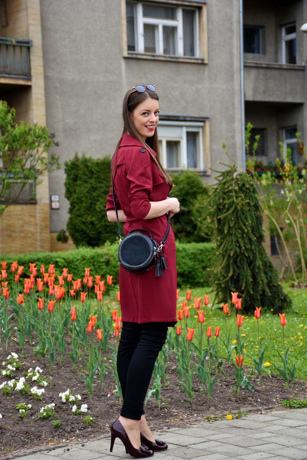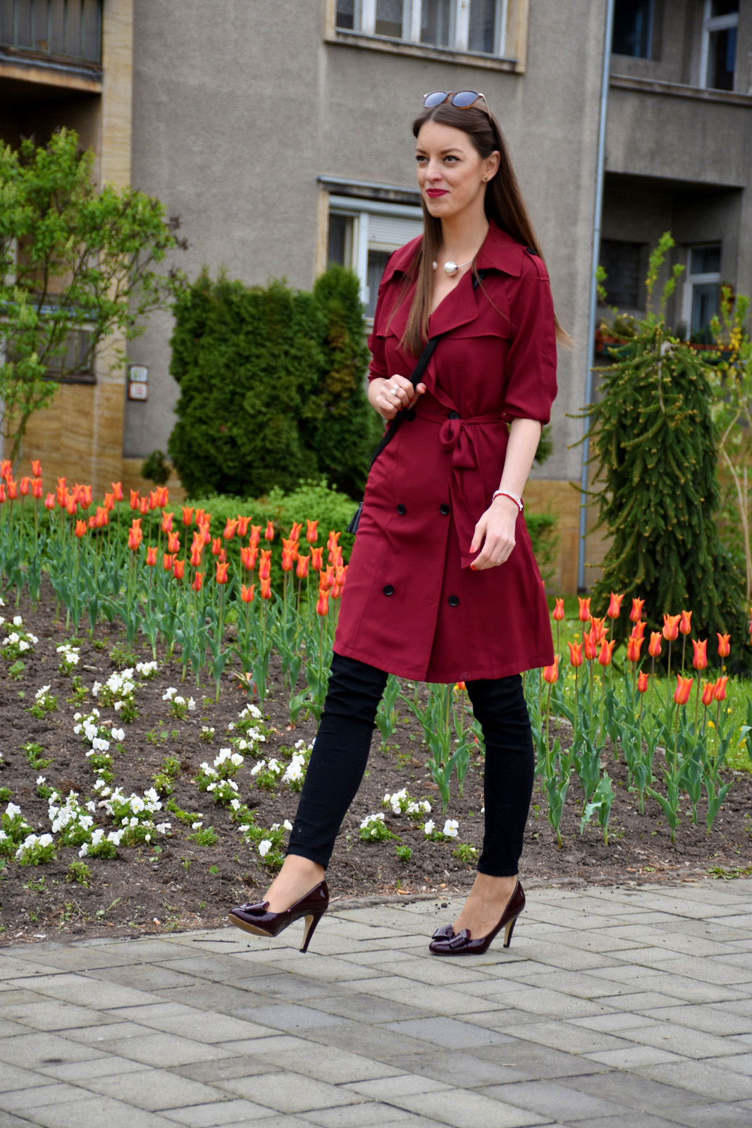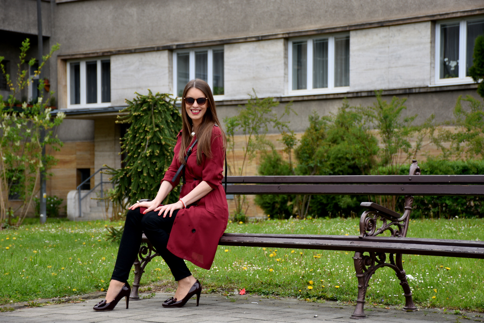 Vínový kabát na e-shope nájdete v časti outerwear, trench coat. Tešila som sa, pretože vínový kabát je naozaj príjemné osvieženie outfitu. No po rozbalení balíka prišlo sklamanie. “Kabát” je ušitý z materiálu, ktorý sa používa na blúzky ehm a k tomu ešte veľmi zlá kvalita. Farba je úplne krásna aj strih je fajn, ale tá látka?! Pýtala som sa sama seba, prečo to nezaradili k šatám alebo k tunikám. Nevadí, ja si poradím so všetkým. Kabát som zapla na všetky gombíky a uviazala na mašľu. Pod kabát som si obliekla čierne nohavice a tielko a zavinovacie šaty sú na svete. Stačí už iba odpárať gombíky a bude to dokonalé. Keby som chcela tento “kabát” nosiť ako kabát, tak si to viem predstaviť ako poistku do kabelky, ak by v lete začalo pršať a nechcela by som mať úplne odhalené ruky (v daždi nič príjemné). Inak kabátik veľmi nezohreje, čo je dosť škoda, lebo by som ho určite vynosila. Pozrite na produktové fotky, zistili by ste, že to nebude kabát z klasickej kabátovej látky? K outfitu som doladila perličkovú bižutériu , okrúhlu kabelku so strapcami a najpohodlnejšie topánky aké mám 🙂