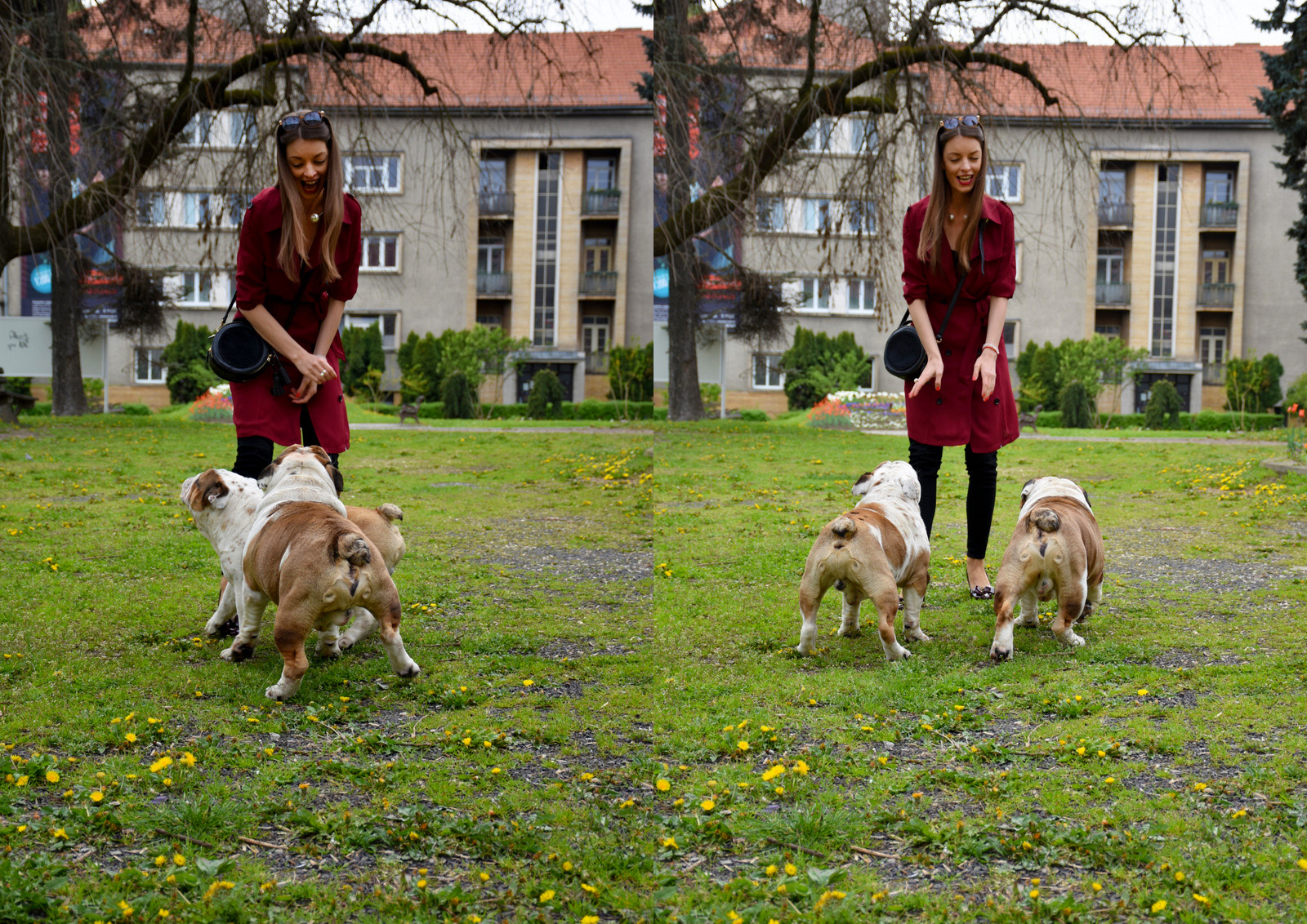 Počas fotenia vínového kabátu sme stretli Sama a Jula. Nie sú to naši známy, ale sú to anglické buldogy, ktoré mi robili spoločnosť pri fotení. Prechádzali sme okolo štátnej opery, hľadali vhodné miesto na nafotenie outfitu a zaujal nás parčík s krásnymi kvetinami a zelenými stromami. Okrem prírody nás zaujali aj títo dvaja nezbedníci, ktorí iba sedeli v tráve a nič sa im nechcelo robiť. Na okraji stál veselý majiteľ psov, ktorý sa už pár desiatok minút snažil Sama a Jula dostať domov, ale oni by celý deň iba sedeli a pozorovali cestu a ľudí. Za krátku chvíľu nám pán Jozef navrhol, že sa s nimi môžeme odfotiť. Fotky so psíkmi hmm to som ešte nemala. Psy do momentu kým som sa k nich nepostavila nerobili nič, no ako náhle som sa k nim zohla, ožili a oslintali mi celé nohavice aj kabát (sem tam to na fotkách vidno) 😀 Hľadanie správneho svetla pochopili ako hru na naháňačku a z fotenia sa stala veľká zábava. Oslintaná som bola ja, ale aj Tomáš. Pán Jozef nám povedal, že sú to bratia, že sú neskutočne leniví a dokonca majú aj vlastnú fun page s videami. Hneď ako sme si sadli do auta sme si profil našli a nevedeli sme sa prestať smiať. TU ho nájdete, zasmejte sa aj vy 😀 No ale poďme aj k outfitu.
