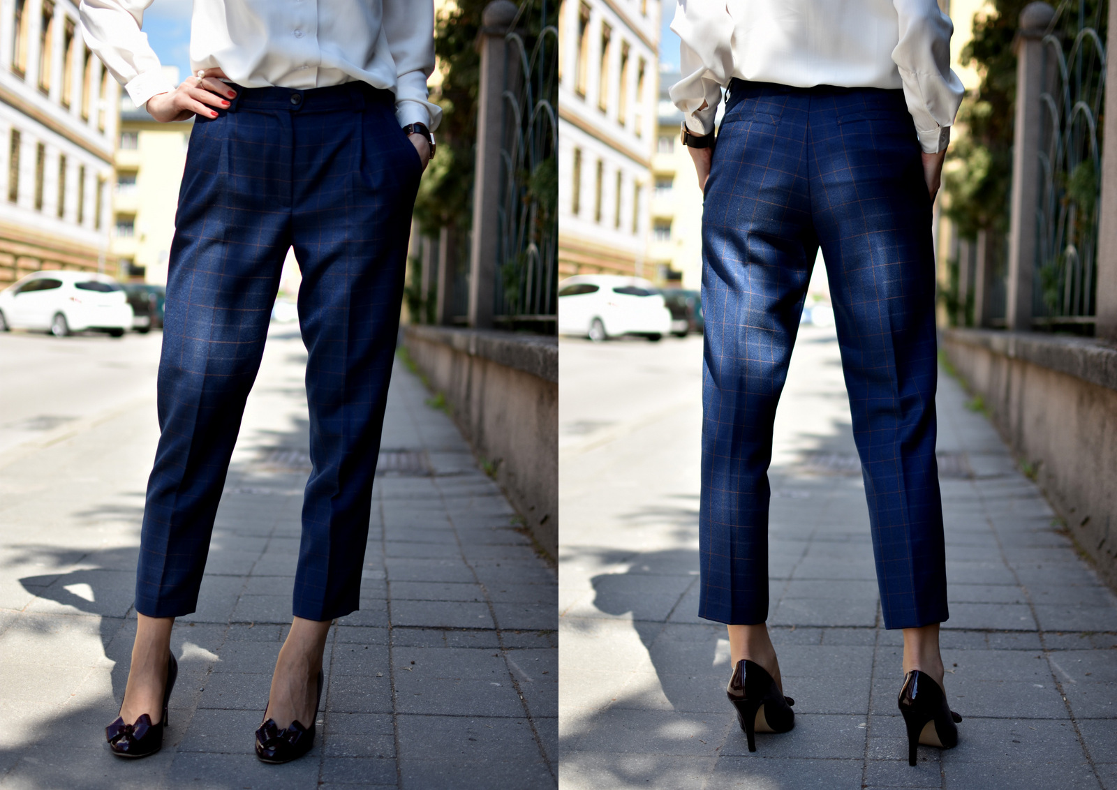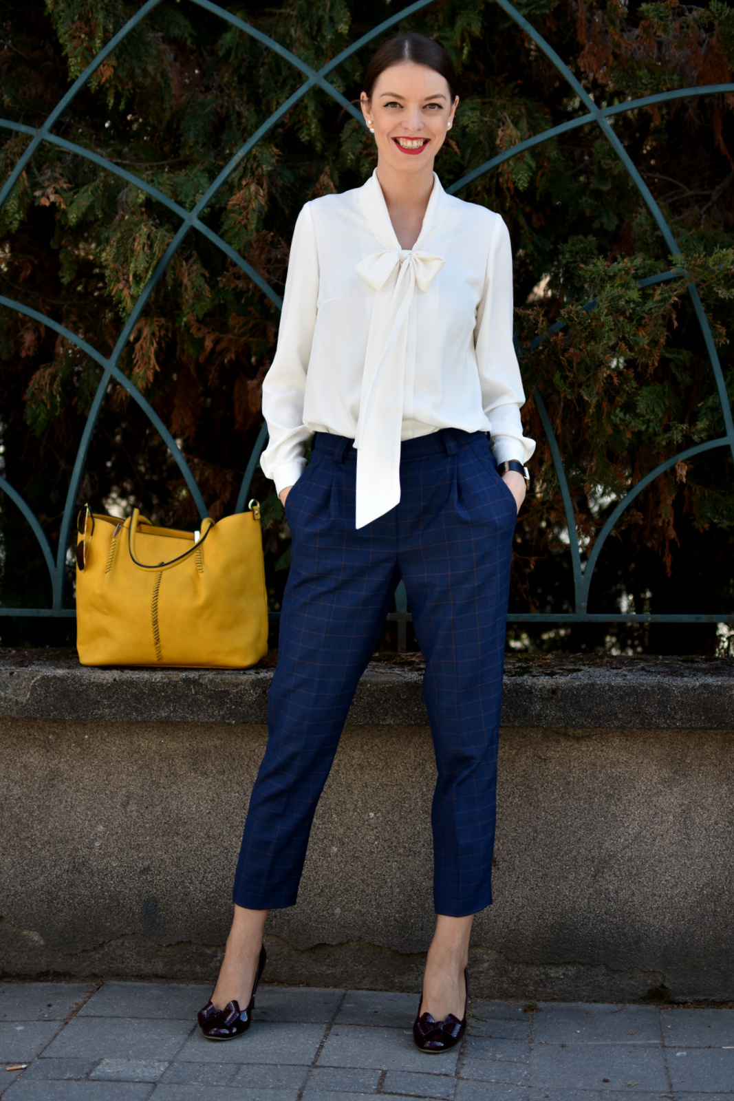 V súhrnnom článku za apríl, som vám spomínala tri kockované látky, z ktorých plánujeme ušiť nové kúsky do môjho šatníka. Kabát ste už mali možnosť vidieť vo viacerých príspevkoch napr. s fotkami od Tomáša alebo od Simony. Druhé v poradí sme, teda mama ušila. Tento krát je to čisto práca maminy, ja som si iba vybrala látku. Mala pár dni čas, tak sa pustila do nohavíc, takže postup šitia nemám zdokumentovaný. Fotili sme ich hneď na mne, lebo nohavice s pukmi na vešiaku, akokoľvek som sa snažila, nevyzerali príliš dobre (česť všetkým stylistom, ktorí to dokážu pekne nafotiť) 🙂 Kockované nohavice majú moju obľúbenú dĺžku, ja to volám 7/8 dĺžka (neviem či je to správny názov), jednoducho siahajú kdesi k členkom, ale nie úplne k nim. Sú tmavomodré s krásnou kombináciou tmavo-oranžovej až tmavo-červenej kocky. Bola som z nej úplne nadšená, látku na nohavice som hľadala asi pol roka. Nohavice majú puky, vrecká a malé záhyby vpredu. Pútka som nechcela, lebo opasky veľmi nenosím a boli by zbytočné. Skombinovala som ich s bielou blúzkou s viazačkou, ktorú som zaviazala na malú mašľu a väčšiu časť som spustila k pásu (minule skončila v obede ehm). Ako doplnky som zvolila vínové lodičky, hodinky a bižutériu oriflame a výraznú žltú kabelku, ktorú právom môžem označiť “never full”, zmestí sa do nej všetko a ešte aj trošku viac 🙂 🙂 V tomto outfite sa cítim skvele a nohavice aj blúzka sú veľmi pohodlné. Kam ho nosím? Do práce 🙂 Na kávičku by som blúzku vymenila za jednoduchší top bez rukávov alebo biele bavlnené tričko, obliekla koženkovú bundičku alebo svetrík na gombíky a topánky na opätku vymenila za mokasíny 🙂 Viac z našej tvorby nájdete v časti šitie.