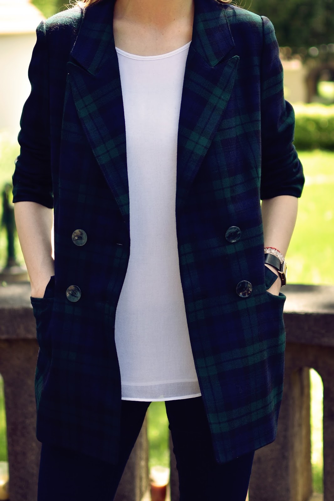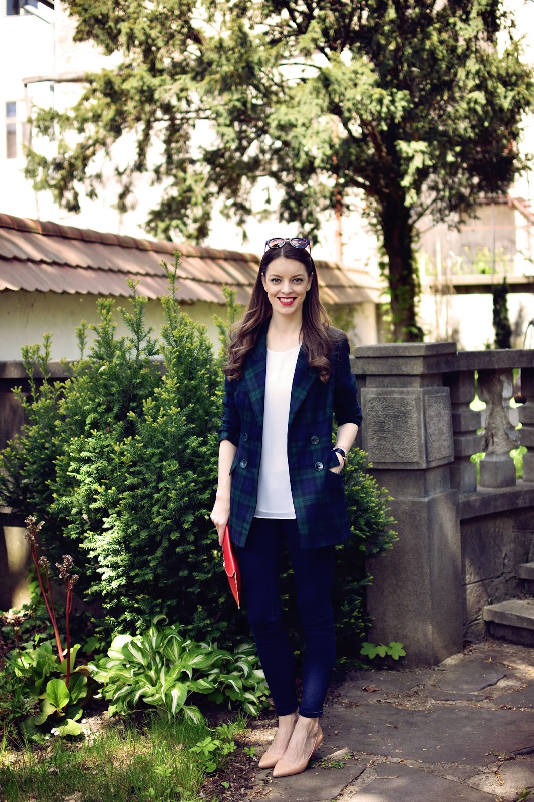 Väčšinu outfitov fotíme v krásnej Banskej Bystrici. V BB som celý život a po absolvovaní sprievodcovského kurzu som si toto mesto obľúbila ešte viac. Keď sa mi do rúk dostane historická fotka napríklad námestia BB som úplne bez dychu. Áno občas otravujem Tomáša s otázkami “vieš čo je toto za budovu?” alebo “vieš z čoho je postavený tento pylón?” ale on je veľmi tolerantný a vždy sa tvári, že to počuje prvý krát 🙂 Miest, kde by sa dalo v BB fotiť v krásnom a zaujímavom prostredí je neúrekom, len nie vždy sú tomu prispôsobené aj svetelné (slnečné) podmienky. Keď sme tak prechádzali uličkami od Štátnej opery, kde bolo príliš veľa slnka a boli sme úplne biele, popri pamätníku SNP, kde bola príliš veľká tma a na fotkách sa nedalo nič rozoznať, sme objavili záhradu, ktorá je naozaj čarovná, malinká a prístupná verejnosti a nikdy som v nej nebola. Je tu veľa lavičiek, zelene a neuveriteľný kľud. Rozhodli sme sa nafotiť outfity práve v tomto prostredí. Stromy vytvárali príjemný tieň a jemný vánok sa pohrával s mojimi vlasmi. Tartanové sako som skombinovala s voľným topom bielej farby a tmavomodrými jeansami. Ako doplnky som zvolila lodičky v telovej farbe a výrazný rúž s kabelkou. Tým, že som mala rozpustené natočené vlasy a červený rúž, nechcela som už žiadny výrazný doplnok v podobe náhrdelníka, aj keď teraz usudzujem, že by sa možno hodil (ale keď nachytám trošku zdravého bronzu bude to vyzerať úplne inak a top nebude až tak splývať s pokožkou). Čo poviete na sako, páči sa vám? Nosíte radšej jednoradové alebo dvojradové saká?