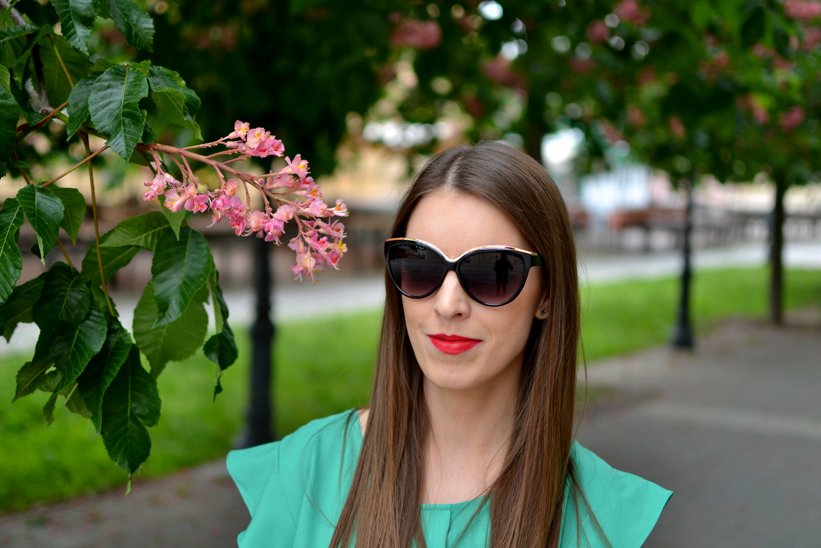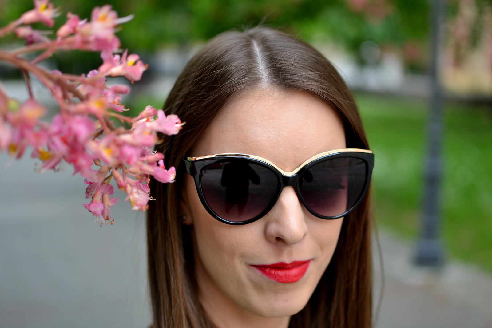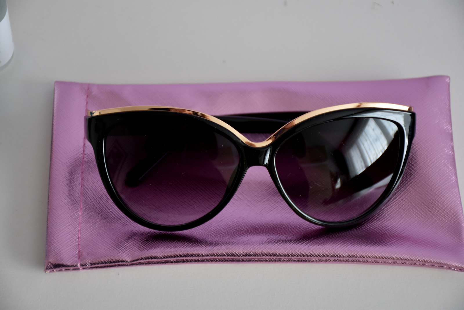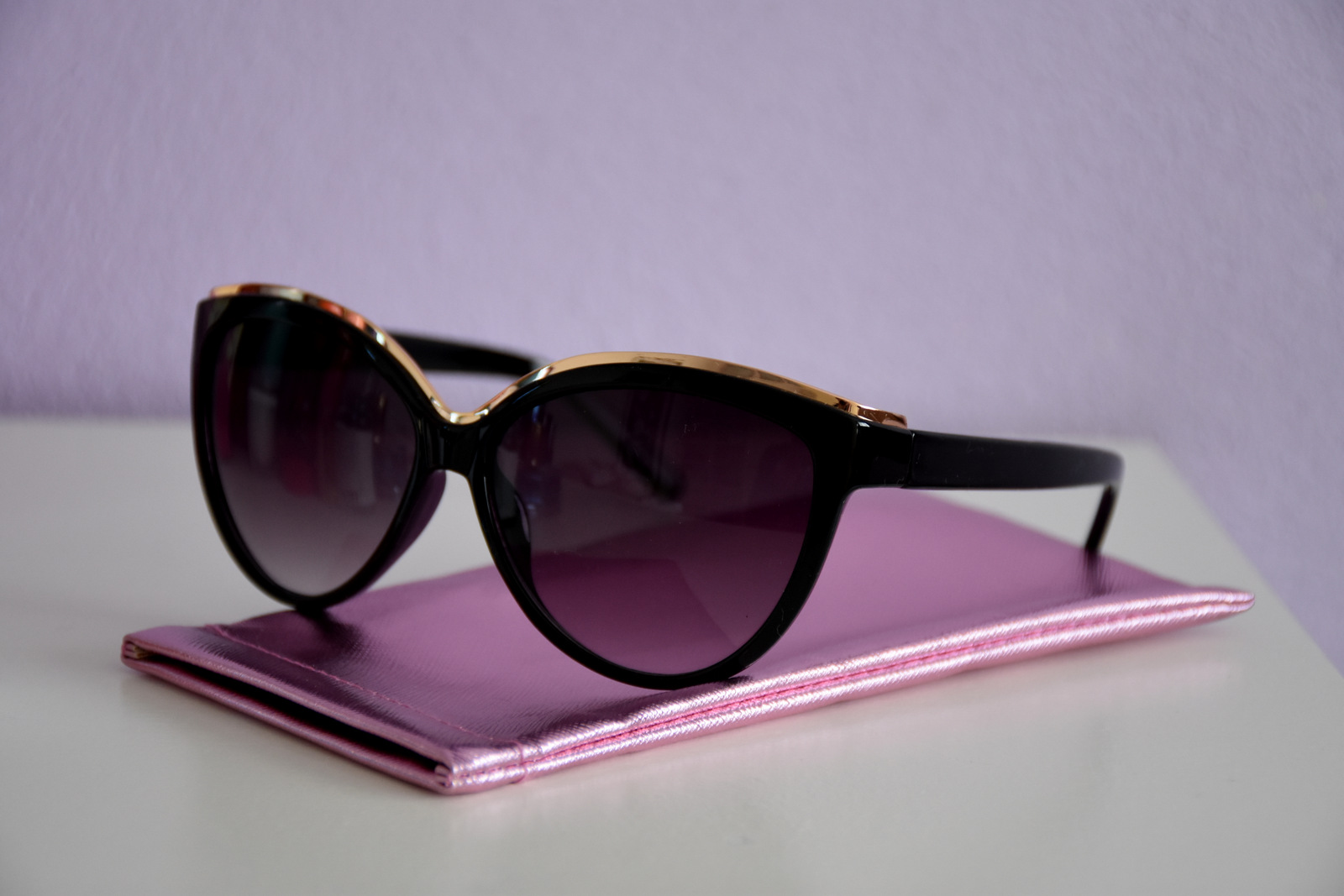 Slnečné okuliare sú veľmi pekné, elegantné. Veľmi pekný detail je okrem tvaru mačacích očí aj zám v zlatej farbe v hornej časti rámu. Aj napriek tomu, že sú sklá čierne nie sú úplne typické čierne cez ktoré vidíte svet negatívne 🙂 Majú pekný fialový nádych, takže vidíte svet pekne a nie pochmúrne. Púzdro je neuveriteľne praktické, úplne som si ho zamilovala a nosím ho v kabelke neustále, zmestia sa do neho všetky typy okuliarov, ktoré mám doma. Okuliare tohto typu sa hodia takmer každému, jedine ak máte príliš úzku tvár tak zvoľte iný typ okuliarov.