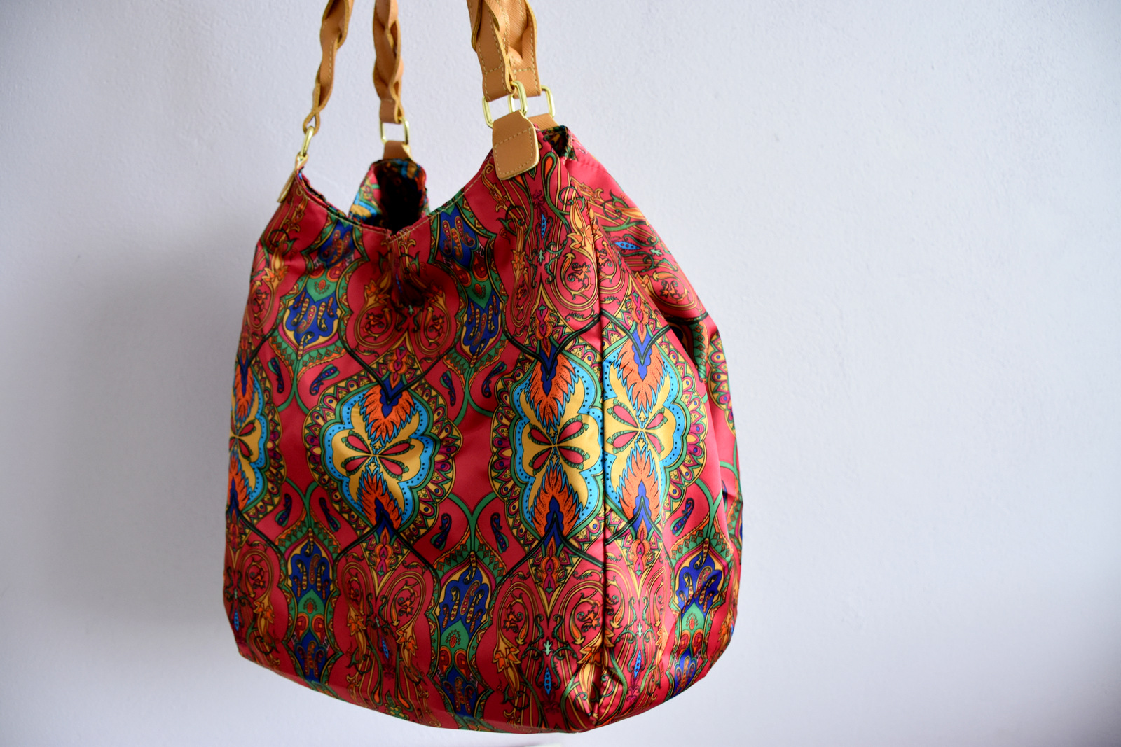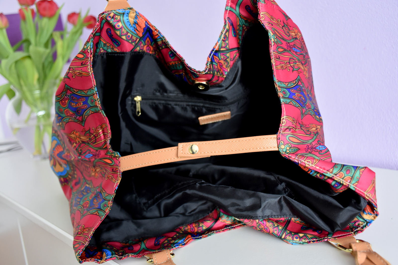 Úžasná taška z jemného polyesteru saténového vzhľadu, ktorá sa hodí do mesta i na pláž. Spája v sebe prvky boho štýlu zo 70 rokov s nádherným kašmírovým vzorom a dve pletené uši z imitácie kože. Materiál: polyester, PU, nylon, zinková zliatina, železo, mosadzné pokovovanie.