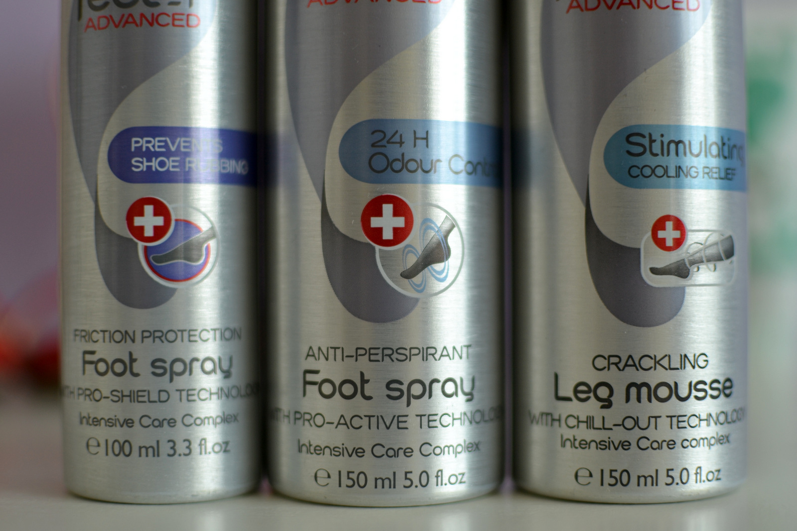 Z rady Feet up Advanced som už vyskúšala tri produkty. Sprej na nohy s 24 hodinovou ochranou proti poteniu, sprej na nohy, ktorý zabraňuje vzniku otlakov a penu na unavené nohy. Všetky tri majú úžasnú vôňu a môžem vám potvrdiť ich účinky, naozaj to funguje. Produkty sú odlíšené rozdielnymi vrchnáčikmi aj veľkosťou 🙂