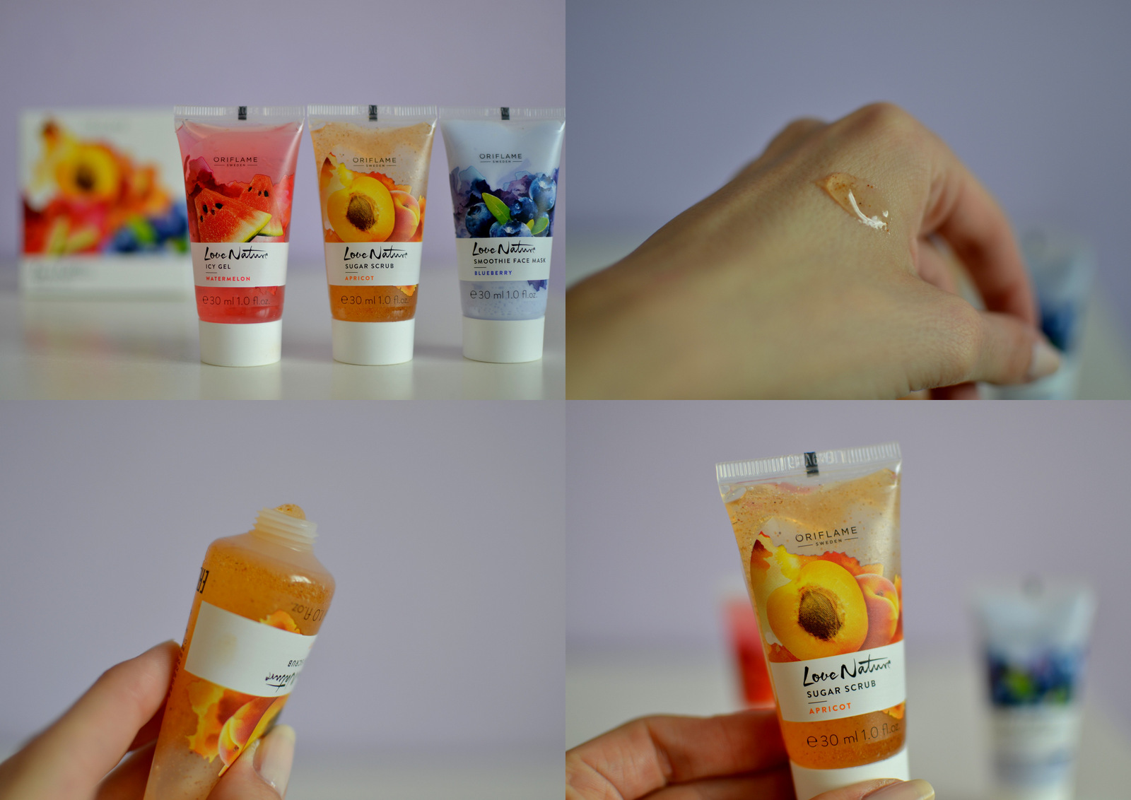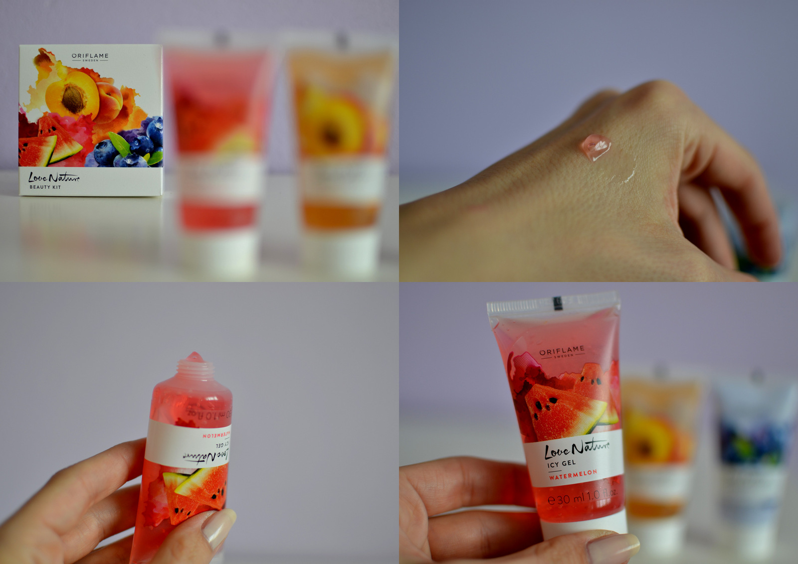 Biela krabička s troma maličkými produktami ma nesmierne potešila. Produkty sú úžasné napríklad aj na letné výlety a cestovanie. V balení je spolu píling, maska aj chladivý gél na záver. Po prvom wau efektne prichádza druhý wau efekt. Tieto malé poklady voňajú ako košík čerstvo natrhaného ovocia. Marhuľový píling má príjemnú oranžovú farbu, ktorá ešte viac umocňuje predstavu čerstvého ovocia (ako keby to bol džem). Píling krásne vonia, obsahuje malinké čiastočky, ktoré pleť veľmi jemne vyhladia. Má gélovú konzistenciu, ktorá nesteká ani nepení. Ako druhú v poradí nanášajte čučoriedkovú masku. Má úžasnú krémovú konzistenciu a počas 10 minútach pôsobenia ani neviete, že ju na pleti máte. Prvý krát som na ňu naozaj zabudla, no druhý krát som si nastavila budík 🙂 Opäť vás očarí neuveriteľná vôňa čučoriedok a čučoriedková farba. Pleť zanecháva ešte jemnejšiu ako po pílingu a pleť krásne vonia. Posledné v poradí použite chladivý gél, ktorý má pre zmenu vôňu a farbu červeného melónu. Pleť na záver pekne upokojí a naozaj schladí resp. ukľudní. Ani jeden prípravok nezanechával na pleti nepríjemný pocit, filter alebo nepríjemné ťahanie, vysušovanie ani mi nezostali červené fľaky alebo podráždená pokožka po pílingu. Nepostrehla som žiadne nežiadúce účinky. Chladivý gél a píling má gélové zloženie a maska je krásne krémová.