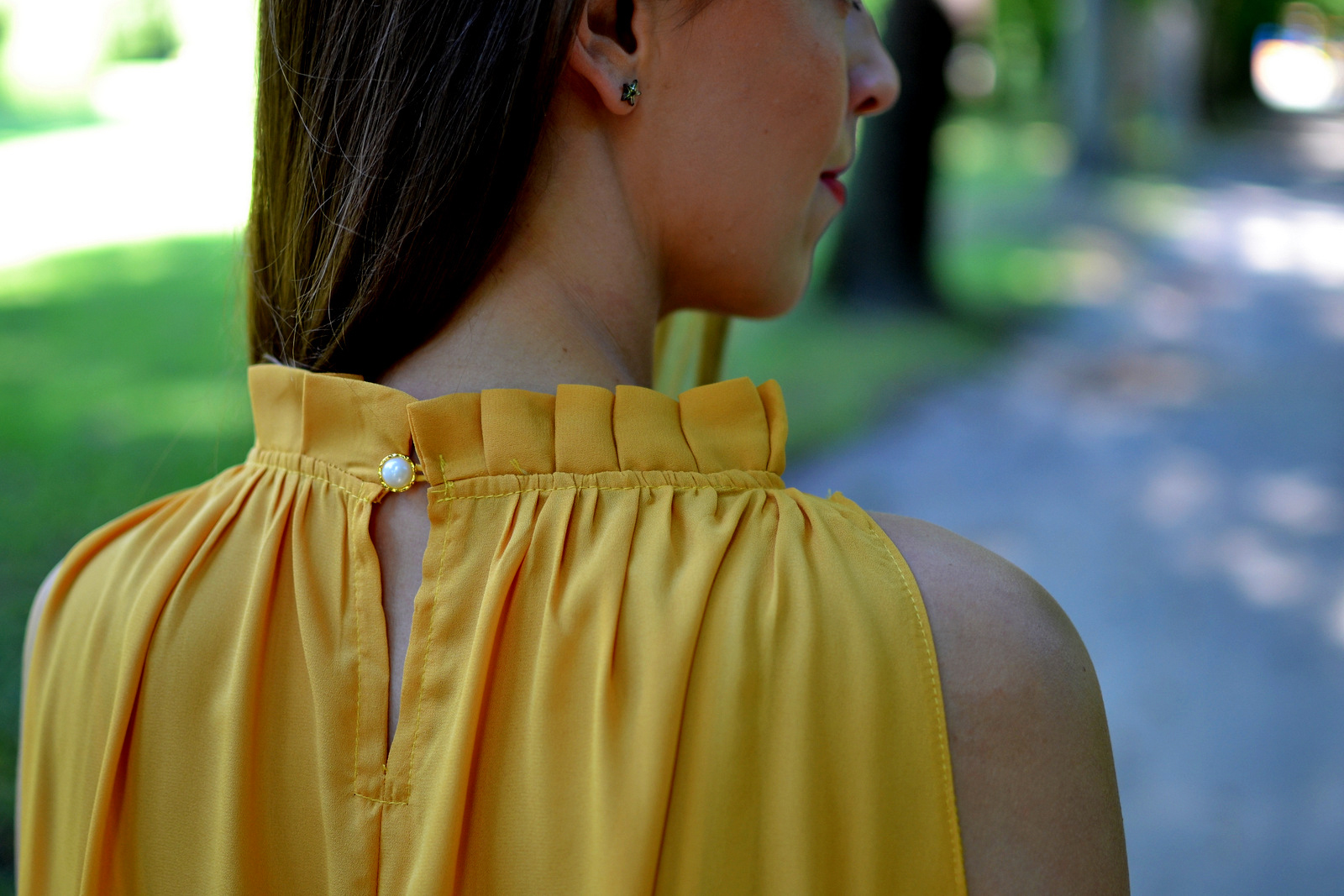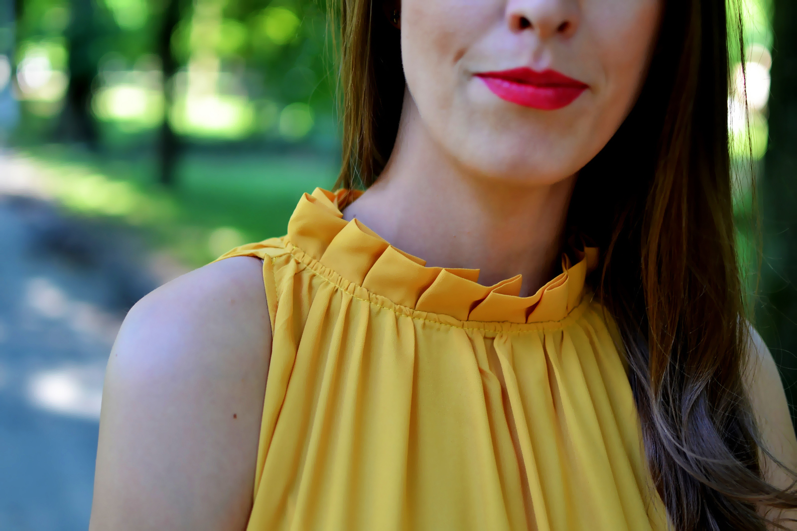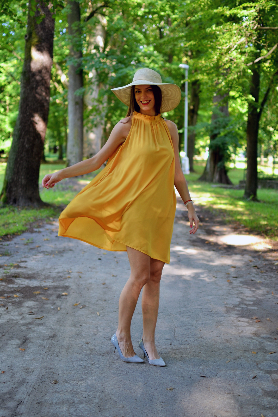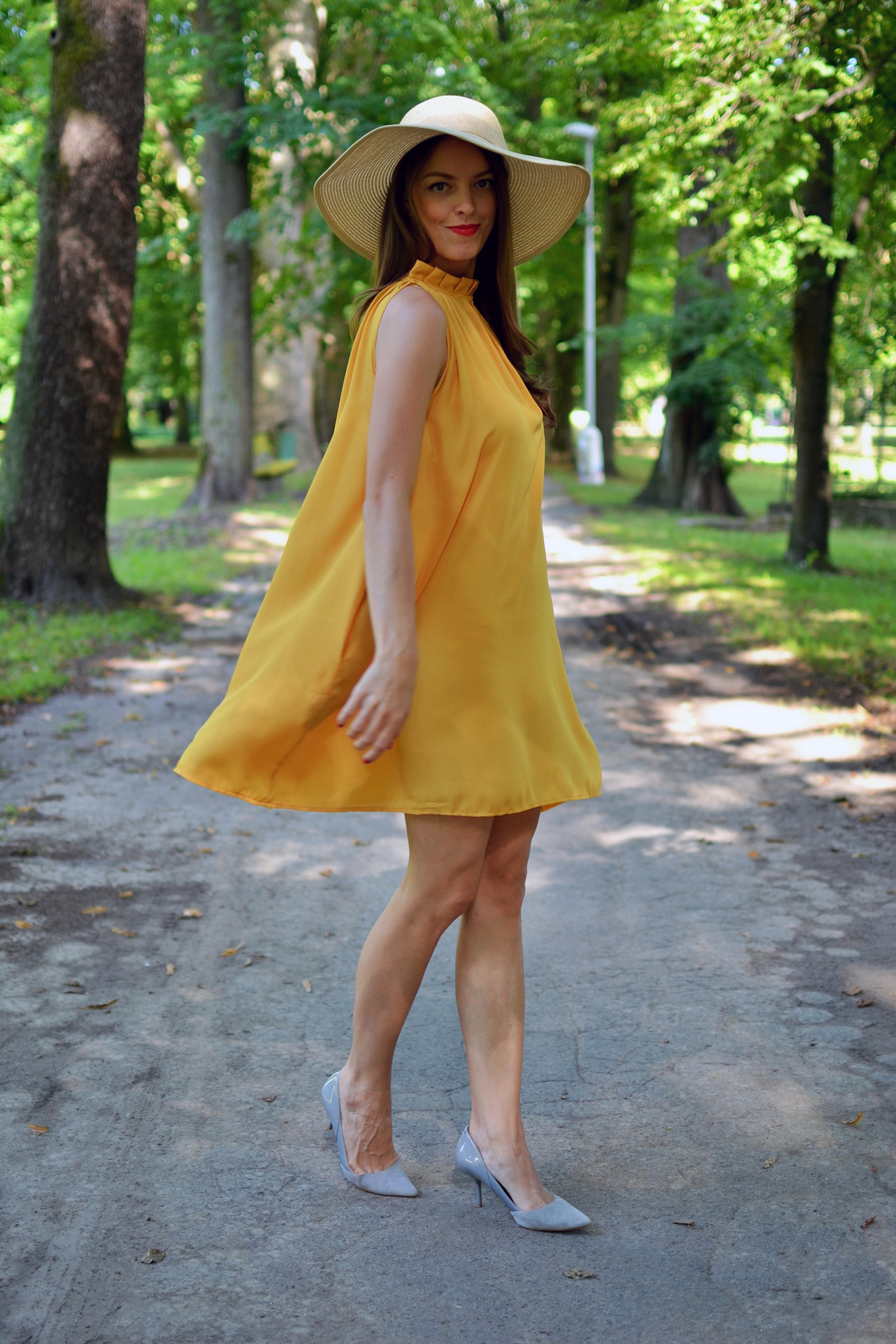 Jantárová, horčicová, žltá alebo tmavožltá? Pri pomenovaní odtieňa žltej farby šiat sa asi nezhodneme, ja ich budem volať horčicové, pretože jantárová farba je predsa len trošku viac do hneda. K šatám patria aj tenké šnúrky, ktoré by sa mali previazať v páse, no tým, že šaty majú strih do “A”, šnúrka šaty zbytočne deformujú a pri chôdzi sa posúvali kade-tade a namiesto vychutnávania si pocitu z nosenia šiat bola neustála kontrola, či je všetko na mieste. Šaty majú dokonca aj vrecká a práve na tejto úrovni sú aj našité šnúrky na previazanie. Stiahnuté nevyzerali skutočne dobre a stiahnuté vrecká naviac deformovali aj postavu, preto som sa rozhodla šnúrku zastrčiť do vreciek a nechať ich “rozviazané”. Podľa mňa vyzerajú takto oveľa lepšie ako na produktových fotkách. Skombinovala som ich s veľkým klobúkom a novými šedými lodičkami, ktoré som si doniesla z Nemecka a cítim sa v nich vždy tak výnimočne 🙂 Sú neuveriteľne pohodlné, majú dokonalú výšku, vydržíte v nich celý deň a viete aj pobehnúť na autobus 🙂 Kúpila som ich v 70% zľave za cca 10 EUR. Outfit som doplnila červenými detailami, rúžom na pery a listovou kabelkou. Nenechajte sa obmedzovať nejakými šnúrkami a šaty si uviažte ako to vám vyhovuje 🙂 Páči sa vám kombinácia týchto farieb? Páči sa vám viac zaviazaná alebo rozviazaná verzia šiat?