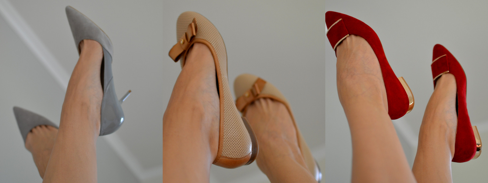 Moja najväčšia slabosť v nemeckých obchodoch sú topánky. Vždy majú moje číslo a väčšinou stoja v zľave 10 EUR. Tento krát som neodolala trom. Šedé sú moje obľúbené, perfektne sa nosia, prispôsobia sa nohe a opätok je perfektný na celodenné nosenie. Hodia sa k jeansom, šatám aj k nohaviciam super! Druhé sú kožené baleríny v telovej farbe, ktoré takisto v lete využijem naozaj na sto percent, hlavne k šatám a keď je vonku škaredo a nemôžem si dať sandále. Boli trošku drahšie a trošku sa mi aj roztiahli, ale nevadí, žijeme len raz 🙂 Bordové zatiaľ nenosím, mala som ich iba raz, ale zatiaľ je na ne príliš teplo 🙂 Majú malý široký opätok a brošňu na špičke. Teším sa na ich nosenie. Tenisky som si kúpila ešte na Slovensku pred odchodom do DE v humanicu za neuveriteľných 8 EUR, obávala som sa ale sú parádne a vyzerajú na nohe super.