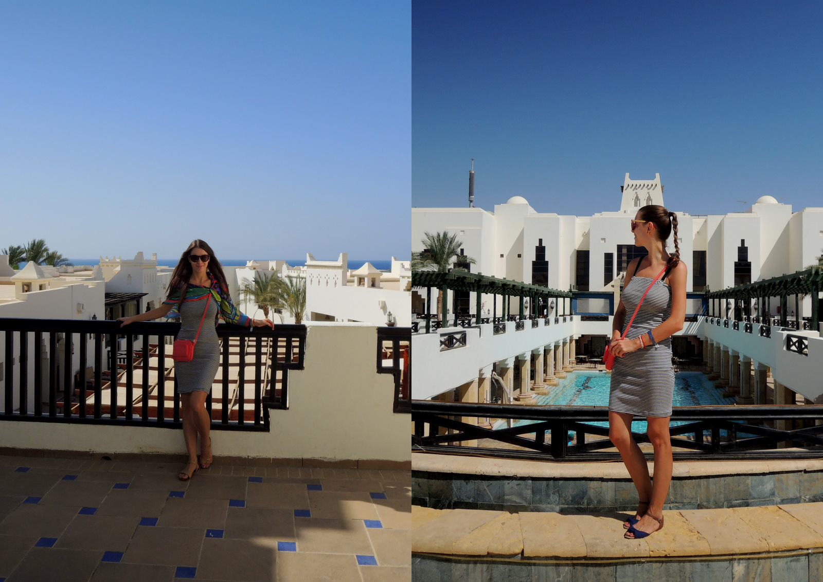 Šaty som si zbalila aj na letnú dovolenku do Egypta. Nosila som ich oblečené na raňajky, so šatkou na ramenách alebo bez 🙂 (Kabelku som v Egypte mala iba jednu malú na foťák, mobil a hotelový preukaz preto je na každej fotke)