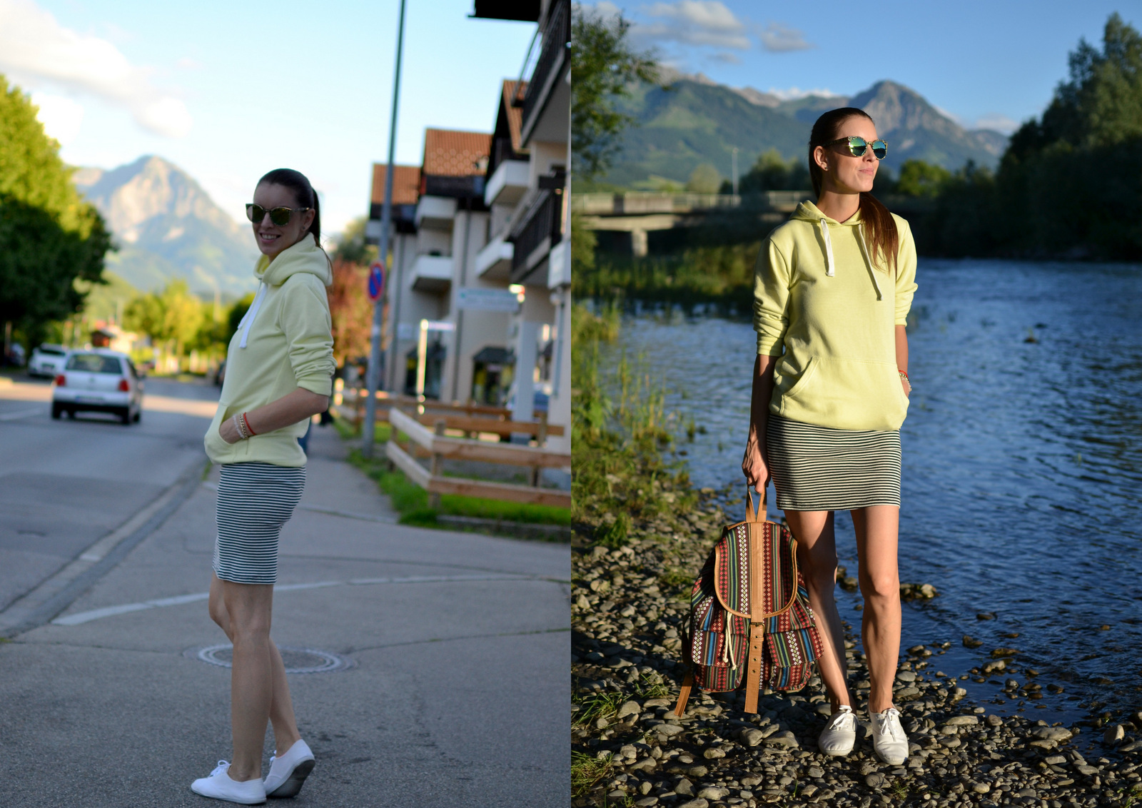 Šaty som si v páse potiahla vyššie aby z nich vznikla minisukňa, v ktorej sa pohodlne chodí. Obula som si biele plátené tenisky a aby mi nebolo chladno obliekla som si svetložltú mikinu. Zrkadlové okuliare a veľký ruksak, do ktorého sa zmestí všetko potrebné a môžeme vyraziť na výlet či už na hrad, mesta alebo prechádzku po rovnom povrchu.