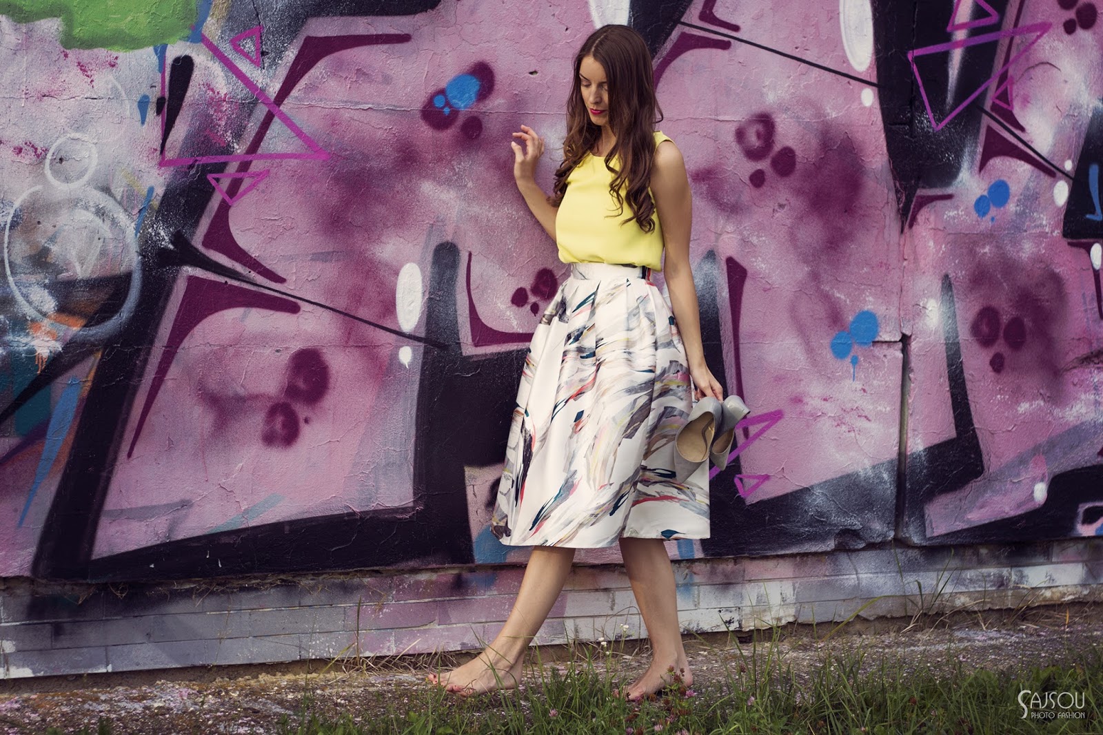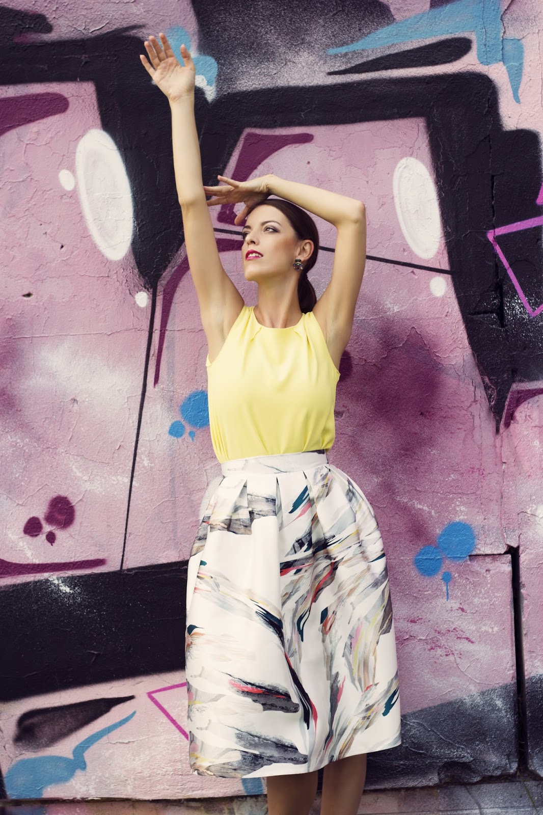 Trvalo jej to asi iba tri mesiace, ale nakoniec sa jej to podarilo 🙂 O čom hovorím píšem? Vysvetlím. Simona, ktorá fotí takéto krásne fotky, ma chcela dostať ku stene s grafitmi. Ja som bola vždy proti, pretože som si predstavila počmárané steny na našom sídlisku (nemám nič proti grafitom je to tiež jedna metóda ako vyjadriť svoju kreativitu a svoje ja) a v kombinácii s elegantnými sukňami a šatami mi to stále nesedelo. Nepomohlo ani “pozri aj Blaire sa fotí pri grafitoch”. Pred pár dňami sme sa stretli, Sima mala náladu na niečo kreatívne, ja som chcela odfotiť zaujímavú sukňu, tak som jej povedala, rob si so mnou čo chceš 🙂 Nalíčila ma, učesala ma, obliekla som sa sama, a potom to prišlo. Počas líčenia. “Vybrala som aj miesto”, urobila krok dozadu a skontrolovala rovnomerne nalíčené lícne kosti. Ja nadšene “faaaakt? aké?” a urobila som grimasu. “hmm, uvidíš”, pokojne ďalej líčila pery, “grafity?” povedala som kľudným hlasom s neistým otáznikom na konci. “To bude dobré”, povedala a ja som si ďalej listovala v katalógu, veď som vlastne povedala, že mi to je dnes jedno 🙂 No a pozrite sa aká je tá obávaná stena krásna a ako krásne dopĺňa celkový outfit. Som veľmi milo prekvapená z výsledku a preto sme pri stene odfotili ešte jeden outfit, ktorý bude inak farebne ladený, veď uvidíte. Aký je váš názor na podobné fotky? Páčia sa vám alebo by ste sa pri grafitoch nefotili?