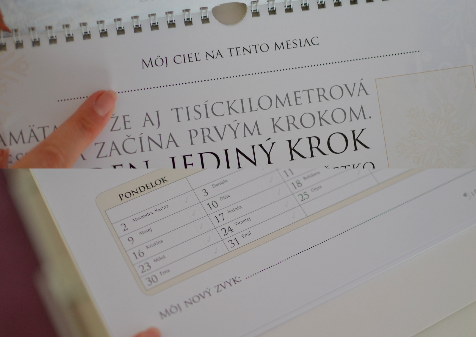 - každý mesiac vám pomôže zamerať pozornosť na svoj cieľ, vytvoriť si nové úspešné zvyky a poslúži vám ako nástenka vizií, na ktorú si môžete každý mesiac nalepiť obrázok vášho cieľa