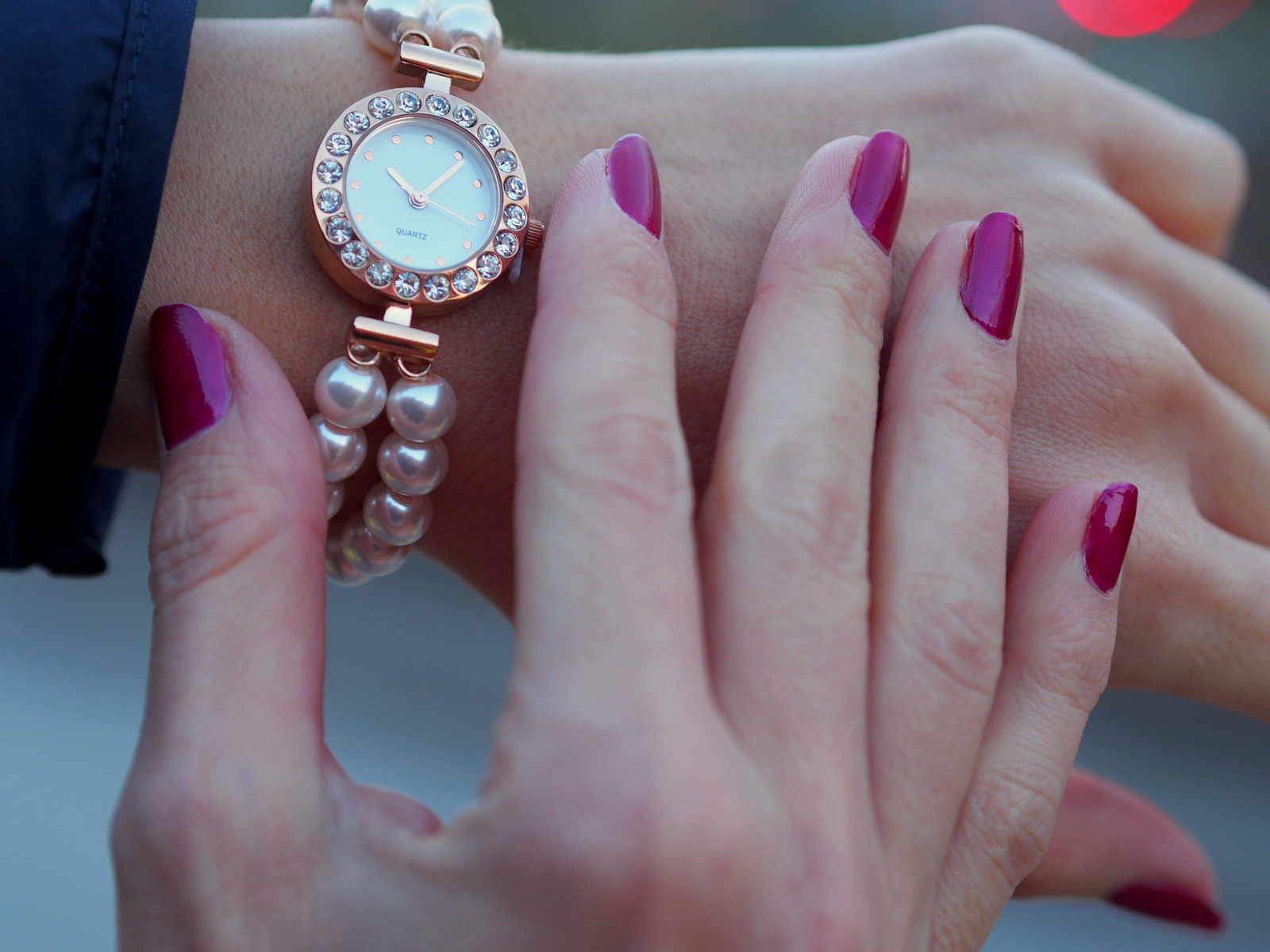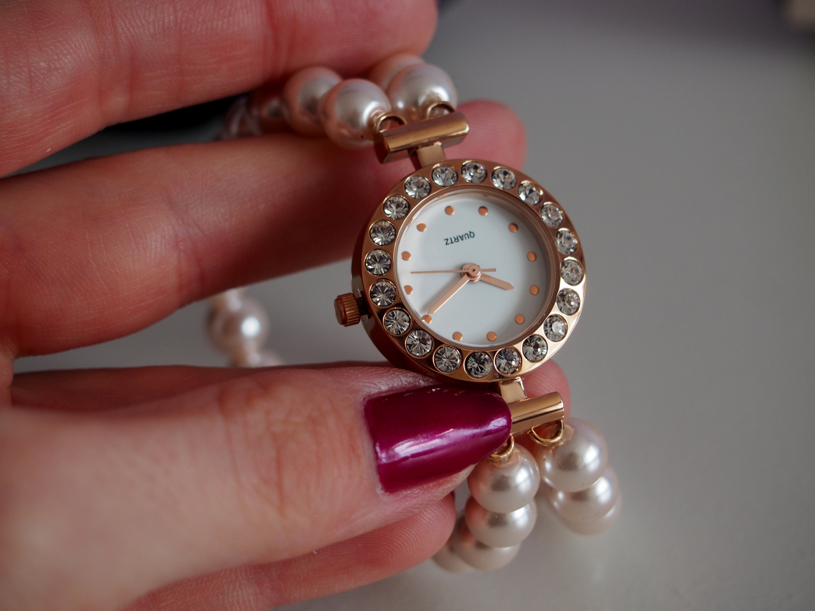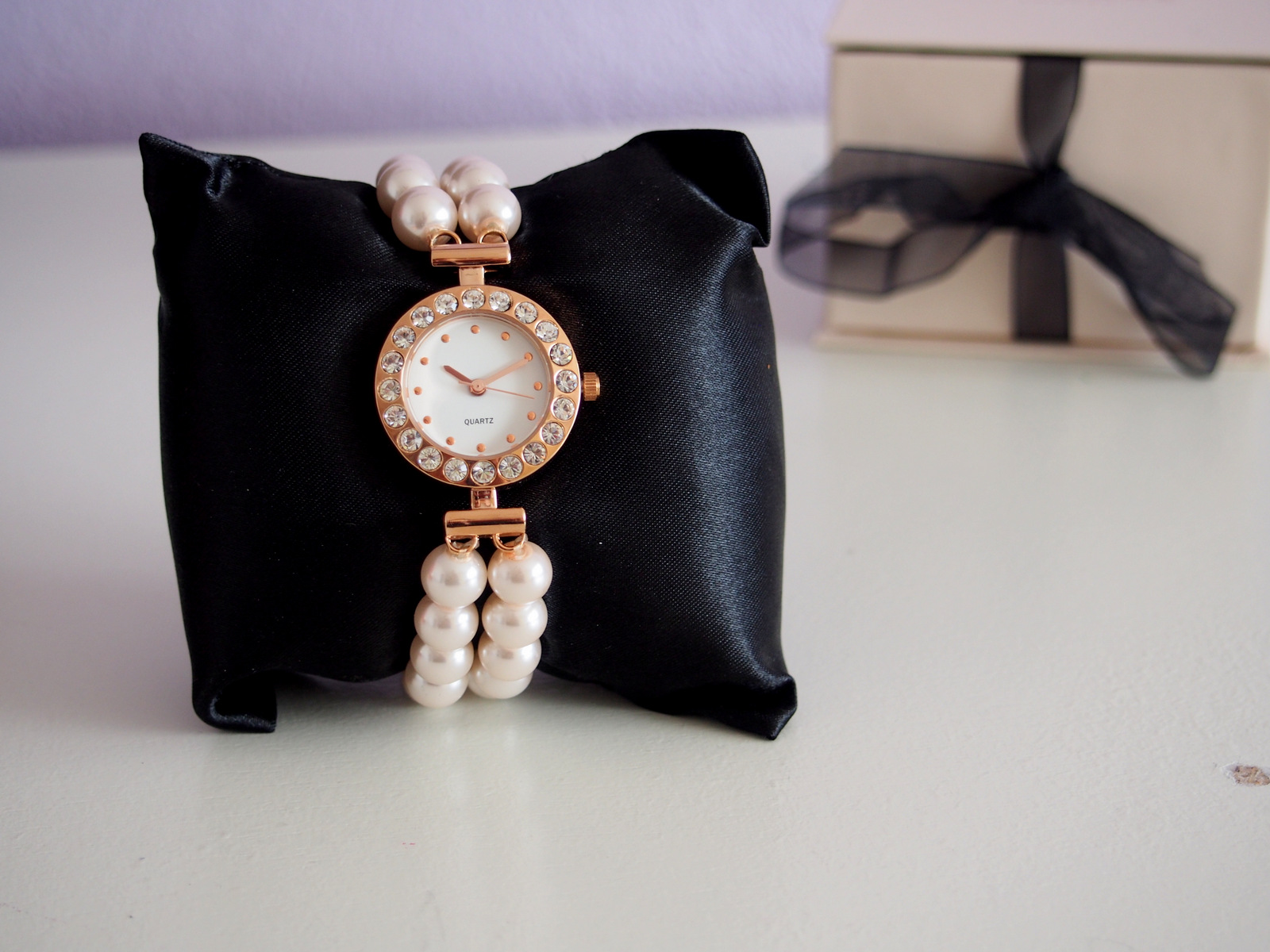 Hodinky vám prídu v peknej krabičke previazané šifónovou mašľou, ktorá sa dá vždy odviazať a zaviazať. Hodinky sú uložené na mäkkom saténovom vankúšiku a súčasťou je aj návod na použitie. Samozrejmosťou je aj baterka v hodinách, čo vždy poteší a máte o starosť menej 🙂 Perličkové guličky sú navlečené na priesvitnej gumičke v dvoch radoch. Ciferník je z imitácie ružového zlata a ozdobený kamienkami, ktoré vyzerajú ako štrasy. Hodinky pôsobia veľmi pekne a elegantne. Hodinky môžete otočiť naopak a máte perličkový náramok. Nádhera. Super trik aj na porady, kde sa nesleduje čas 🙂 Ja mám perličky veľmi rada, takže som sa týmto hodinkám veľmi potešila. Ciferník nemá čísla iba bodky, ale to nie je prekážka 🙂
