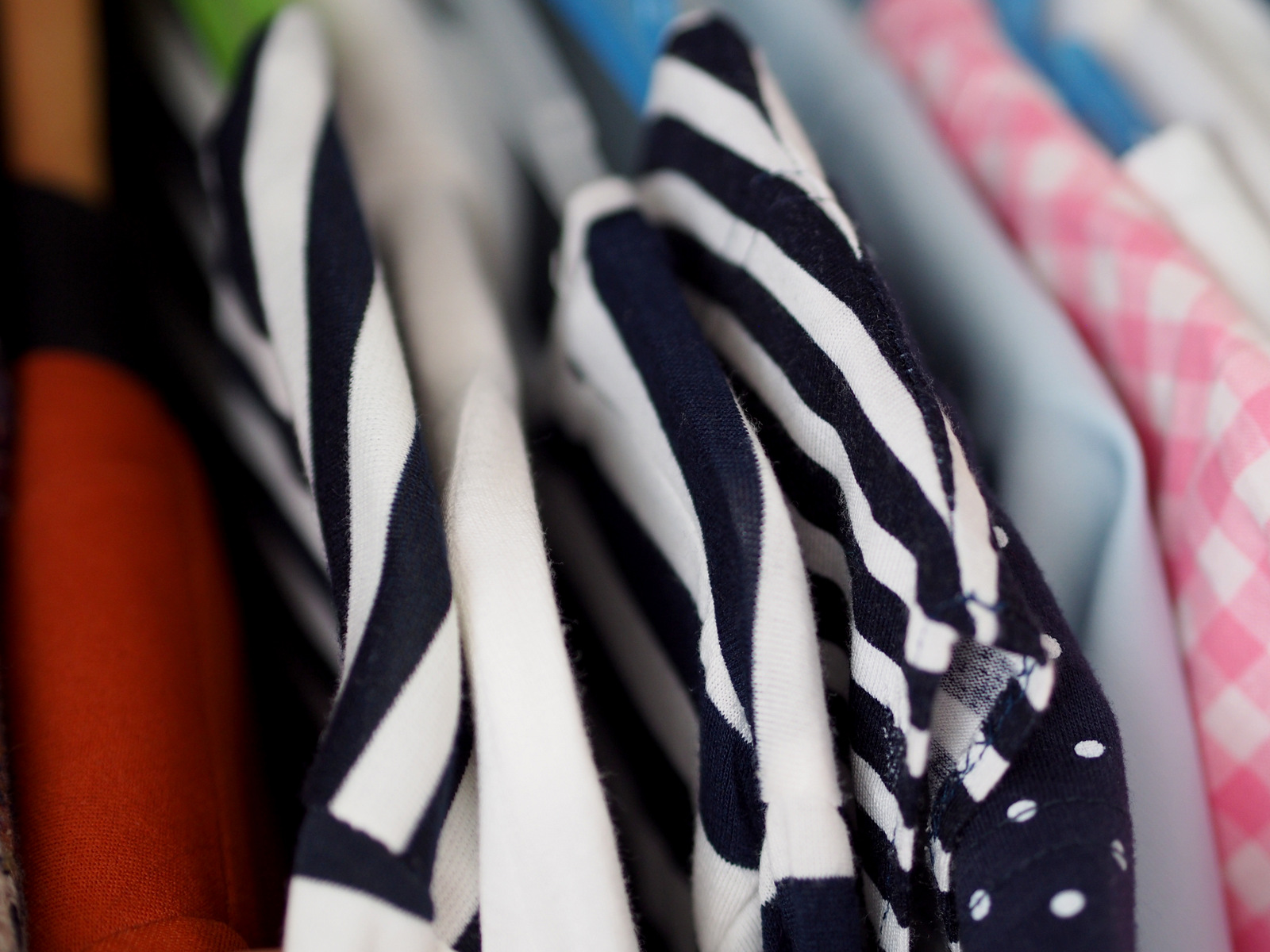 Pri tričkách a blúzkach dbám na viac detailov. Zavesené sú na tenkých vešiakoch, po jednom. Používam plastové vešiaky, ale keby som mala viac tých z čistiarni, tak používam tie. Tričká mám zoradené podľa materiálu a dĺžky rukávu 😀 Čo to znamená. Na začiatku mám úpletové tričká s krátkym rukávom, potom nasledujú blúzky s dlhším rukávom, šifónové blúzky, nasledujú biele blúzky s dlhým rukávom a potom riflové košele s dlhým rukávom. Takto presne viem, kde čo je.