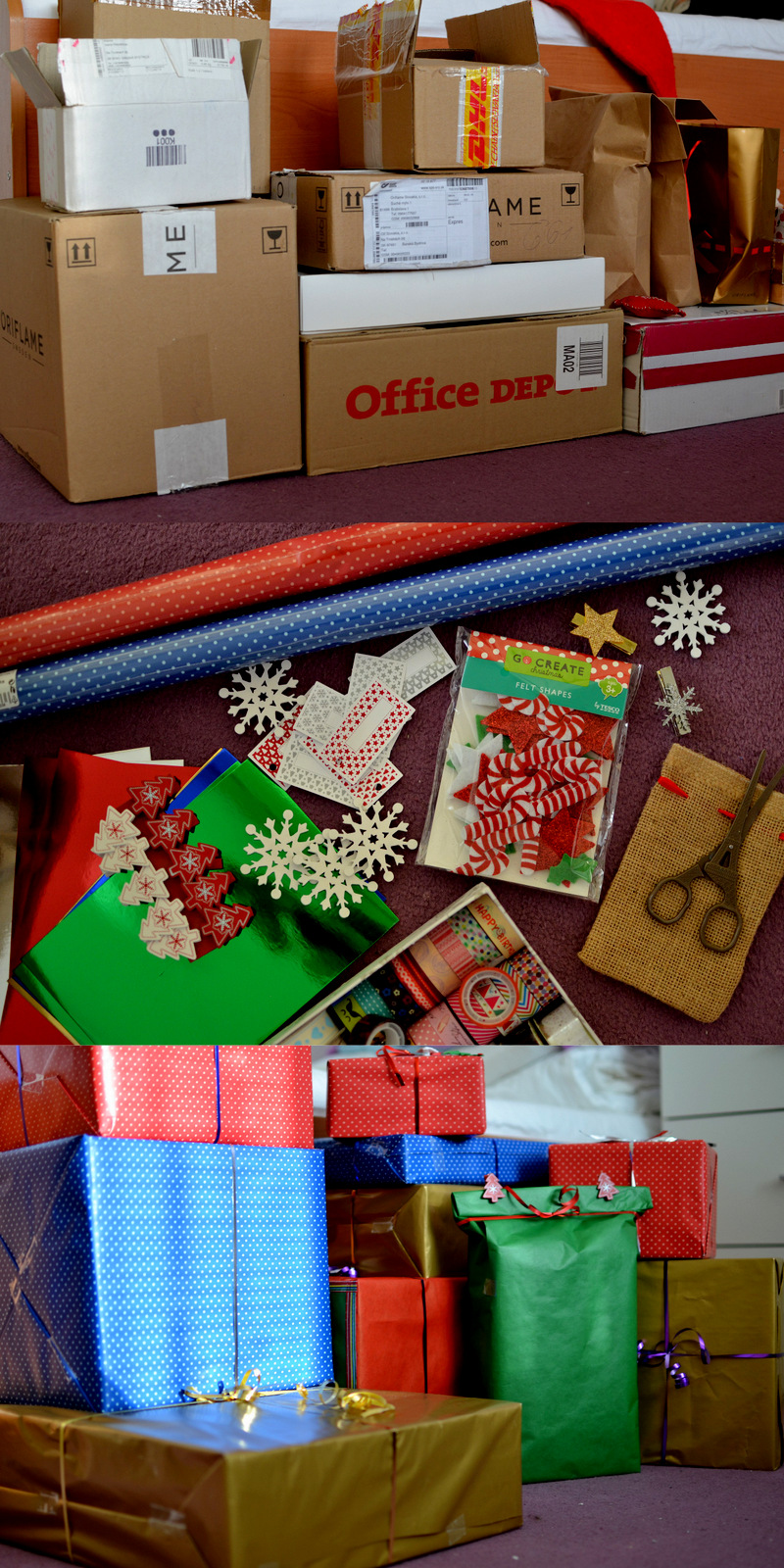 Tento rok som opäť odkladala už od začiatku novembra krabice z balíčkov, ktoré nám chodia do práce. Potom som si ich všetky zobrala domov a zabalila do nich darčeky. Takto sa jednoduchšie balia a balíčky sú krajšie (perfekcionizmus och). Tento rok som si kúpila bodkovaný papier – červený a modrý, zlatý a zelený. Dozdobila som ich vianočnými ozdobami z filcu a drevenými bielymi vločkami. Nádhera 🙂