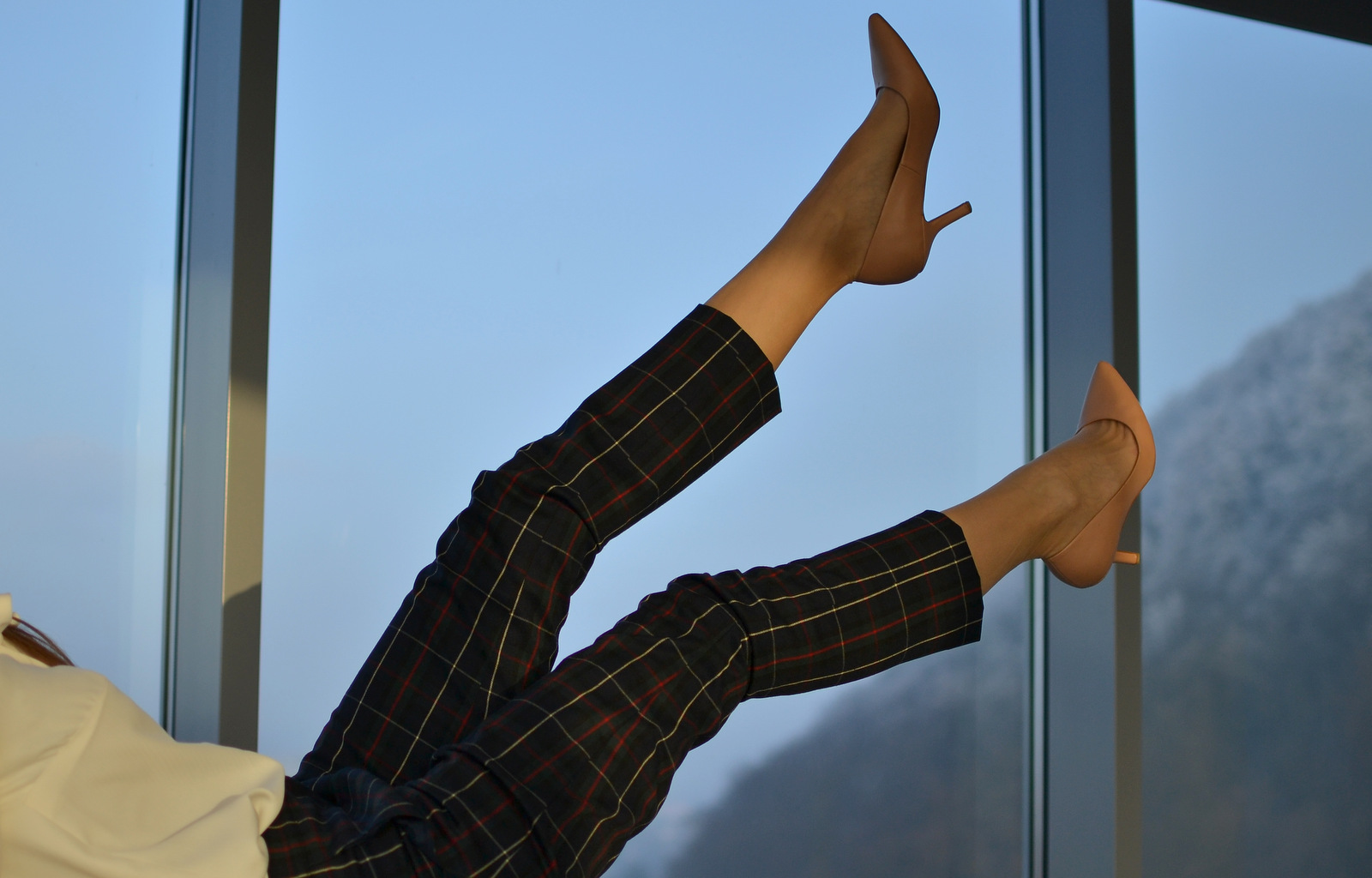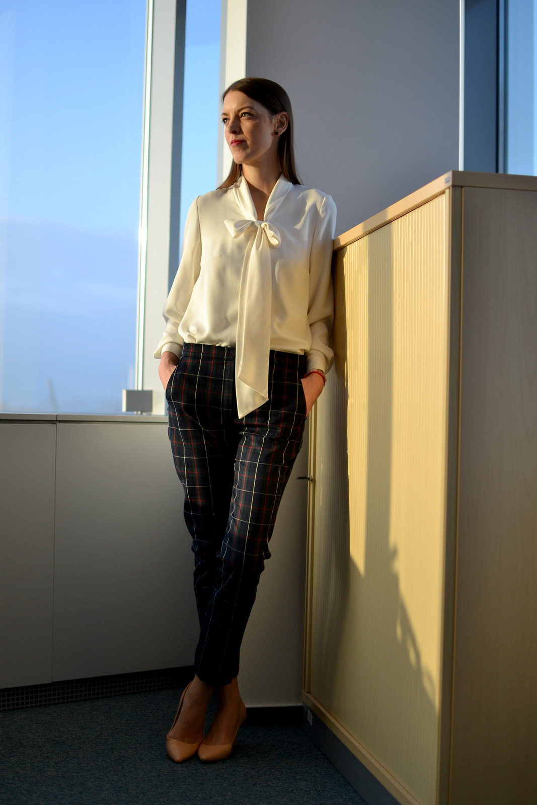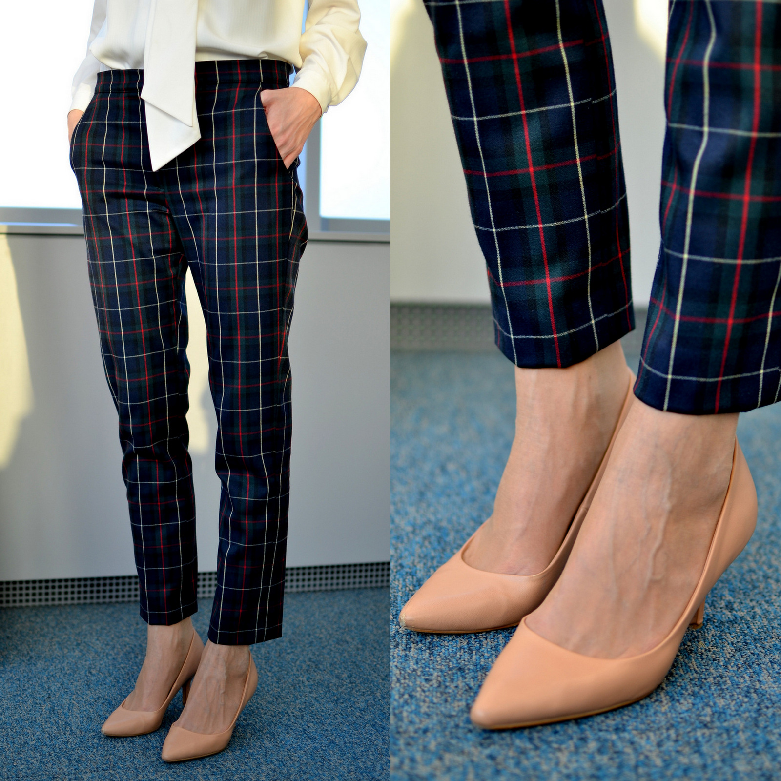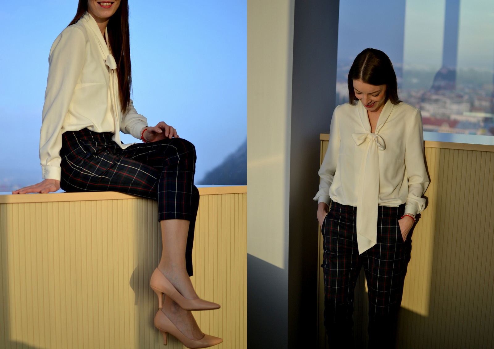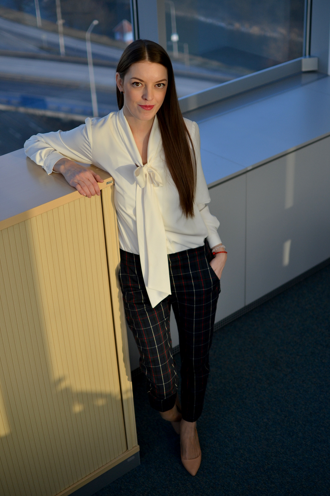 Elegantné nohavice s kockovaným vzorom z našej dielne, som mala zatiaľ oblečené dva krát. Prvý krát na celofiremnom stretnutí a druhý krát v práci. Prvý krát sme boli v hoteli, v izbe som sa aj prezliekla a nemusela som vytiahnuť ani nos do tej zimy. Druhý krát som na tú zimu pozabudla a vybrala som sa v nich len tak ako keby bolo vonku dvadsaťpäť stupňov nad nulou. To sa mi stalo osudné a poriadne som ochorela. Preto som sa rozhodla, že to nebudem opäť riskovať a odfotím ich jednoducho v interiéri v teple. Vždy je to pomerne komplikované, pretože doma nemáme dobré svetelné podmienky, tak fotíme inde, ale myslím, že môj brat sa s tým vyhral dobre. Na zimu tieto nohavice naozaj nie sú to najlepšie, preto som sa rozhodla, že sa jednoducho budem v práci prezliekať, aby nemuseli visieť v skrini do jari. Zvyknete sa prezliekať v práci/v škole? Ja to robím pomerne často a vôbec mi to neprekáža. Dokonca sa prezúvam (aj v lete), lebo vo vysokých lodičkách dlho nevydržím. V práci som elegantná a po práci mi je teplúčko a maximálne pohodlne v hrubom svetri a jeansoch.