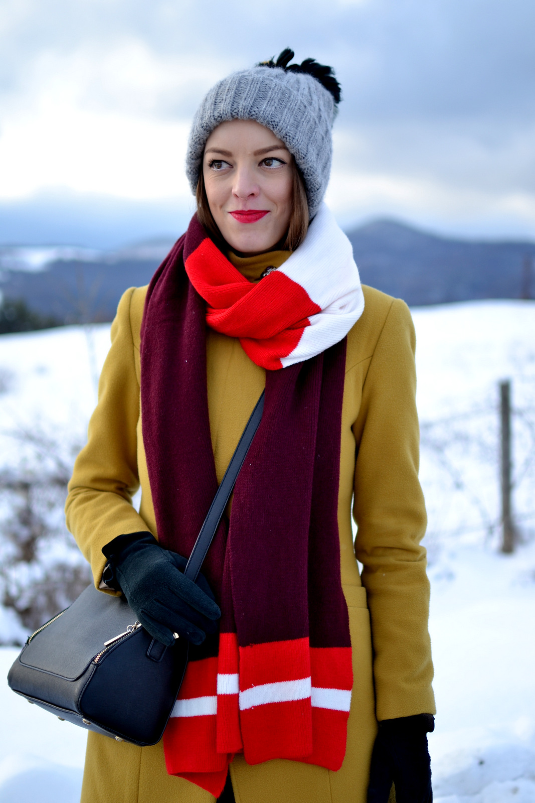 Po prvý krát som využila zľavy aj na e-shopoch. Očarilo ma tchibo, spartoo, astratex a zara. V Zare si väčšinou kupujem iba topánky, a to v poriadnych zľavách, počas zimnej dovolenke v Nemecku. Cena je od päť do deväť EUR a tie topánky vyzerajú skvele aj po rokoch nosenia (zatiaľ som žiadne nevyradila ako nenositeľné, nemoderné alebo zničené) a môžem tvrdiť, že sú nadčasové. Tento rok som si nebola istá, či stihneme výpredaje v Nemecku, a preto som si čosi kúpila cez e-shop ešte na Slovensku 🙂 Veľmi som túžila po teplom šále, ktorý je klasický štrikovaný a nie je to veľká šatka alebo “deka”. Tých mám dosť veľa a nie každé ráno mám náladu na vymýšľanie ako ich uchytiť a zaviazať, aby na kabáte vyzerali dobre. Do oka mi padol tento trojfarebný bordovo-červeno-maslový a k tomu som si doobjednala aj šedú čiapku s farebným brmbolcom. Urobila som veľmi dobre, pretože šál je úplne perfektný, vyzerá pekne na žltom kabáte, béžovom kabáte, ale aj navetrovke v zelenej farbe. Nie je iba pekný, ale dokonca aj zahreje (väčšinou sa stretávam s tým, že buď hrejú alebo vyzerajú dobre – tento má oboje). Často ho nosím zaviazaný na stranu a konce šálu spustené do jednej strany (ako keď malé deti obliekajú maminky, ale vyzerá to fajn). Rozhodnutie prihodiť do objednávky aj čiapku bolo takisto super rozhodnutie. Je mäkučká, nie je podšitá a trošku mi na hlave lieta, ale je veľmi univerzálna a takisto sa dá kombinovať s množstvom oblečenia aj vďaka farebnému brmbolcu. Najlepšie vyzerá v kombinácii práve s trojfarebným šálom. Ako vidíte nemusíte sa báť, že sa vám nebude hodiť niečo len preto, že v sebe nemá farbu vášho kabáta alebo vetrovky a už vôbec nemusíte nosiť trojkombináciu rovnakého šálu, čiapky a rukavíc. Práve naopak, skombinujte rôzne farby a budete vyzerať sviežo a veľmi štýlovo. Čierne rukavice sú z imitácie semišu (alebo brúsenej kože), šál je dlhý s hustým štrikovaním a čiapka je infantilná s veľkým vzorom a výrazným brmbolcom. Nebojte sa a vyskúšajte bláznivú kombináciu aj vy už dávno neplatí pravidlo, že musí všetko so všetkým ladiť 🙂 Ďalšie výpredajové úlovky, vám predstavím v súhrnom článku s novinkami za január. Čím ste si vo výpredajoch urobili radosť vy?