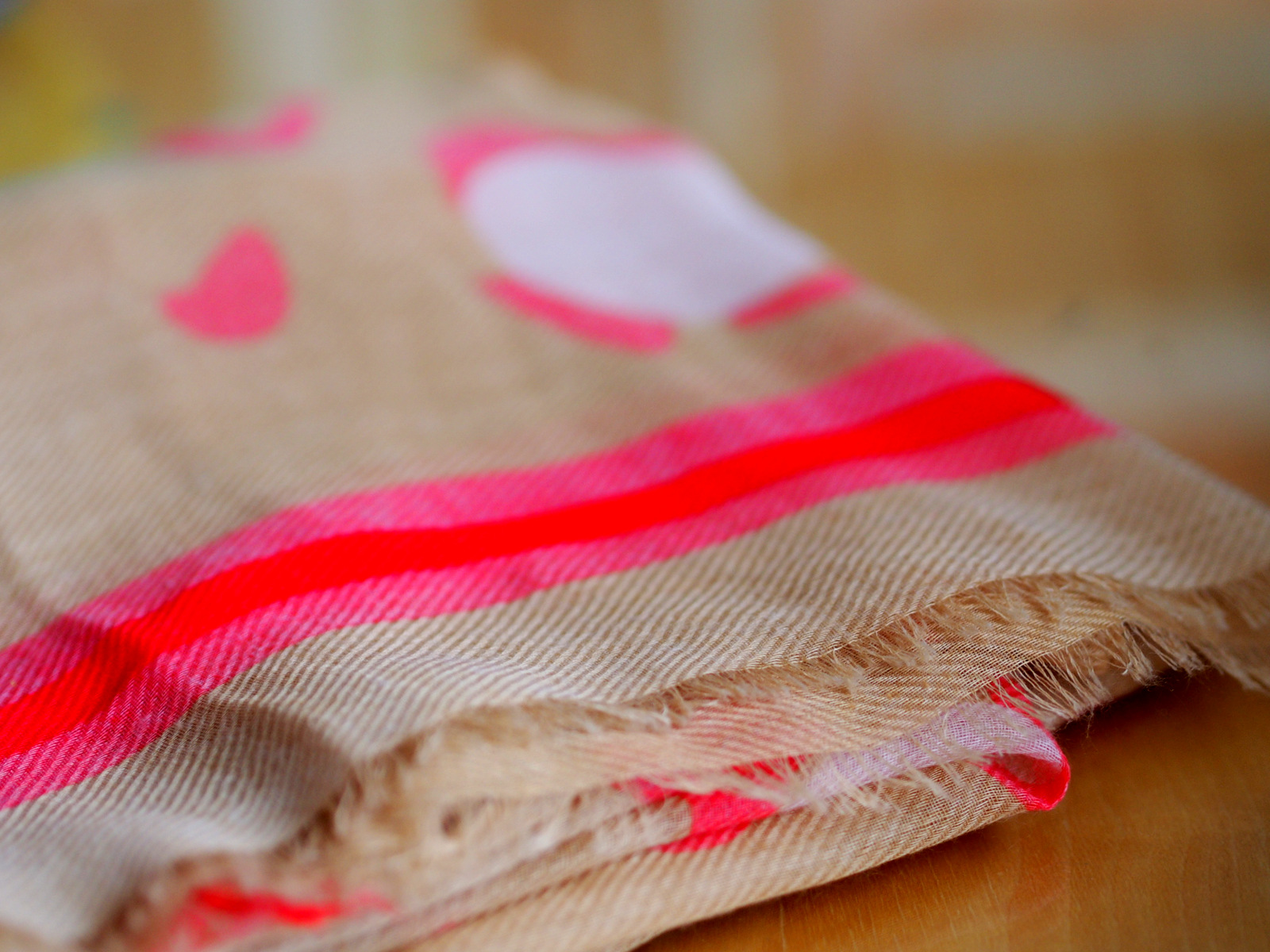 Obdĺžniková keprová šatka z polyesteru vo farbe ťavej srsti s moderným červeným a ružovým vzorom.