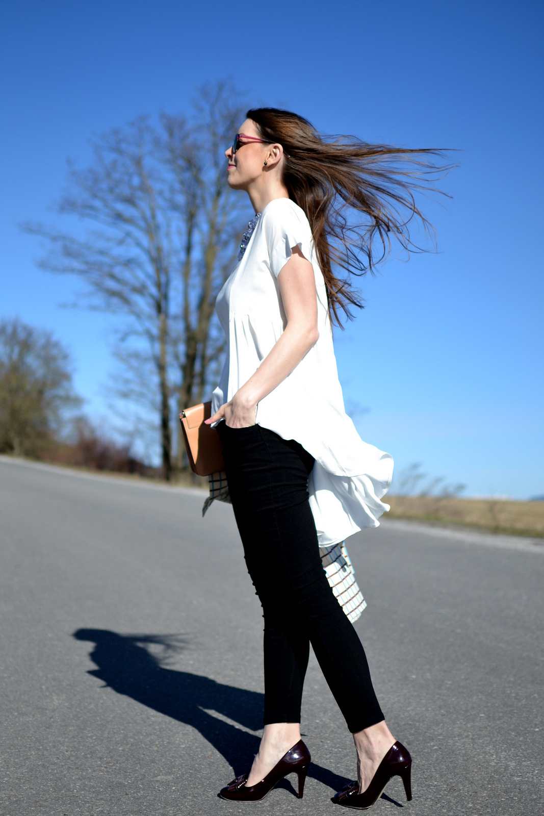 Opäť je to tu … ranné nekonečné rozmýšľanie ako nakombinovať outfit, aby ste ráno nezamrzli a po práci nešli ako vešiak. Po ceste stretnete ľudí obutých v mokasínkach, v čižmách, oblečených v koženkových bundách, ale aj v čiapkach. Posledný týždeň sa s nami počasie hrá zaujímavú hru. Ráno prší, obloha je zatiahnutá, moja nálada je na bode mrazu a obliekam si ešte zimnú vetrovku, čiapku a čižmy. No ako náhle si sadnem do autobusu oblaky ustupujú, slnko svieti do očí a namiesto dáždnika som si mala zobrať radšej slnečné okuliare. Vystupujem spotená, s kabelkou plnou oblečenia, lebo otvoriť okno v autobuse je ako vypýtať si dávku negatívnej energie od spolucestujúcich. V piatok som bola na služobnej ceste v BA a mala som pocit ako keby som prechádzala cez dva podnebné pásma 🙂 Samozrejme som na to bola pripravená a už z domu, aj za riziko ranného chladu, som išla iba v balerínkach a v jarnom kabáte. Trošku sa mi to vypomstilo a moja imunita bola zmätená a tak som si dva dni poležala v posteli. Zo šatníka som už ale definitívne odložila na letný spánok všetky čiapky, hrubé šále, roláky aj svetre a pekne ich sfúkla do vákuových vriec, lebo zaberajú neskutočne veľa miesta. Pri tejto príležitosti, ako som písala v tomto článku, som vytriedila veľa oblečenia, ktoré nenosím a mám ho v skrini iba z nostalgie. Ale späť k rannej dileme a outfitu:) Môj najlepší kamarát, v týchto nejasných jarných teplotách, je rozhodne kardigan a dlhé zateplené vesty. Zahrejú a dajú sa jednoducho poskladať a odniesť. Ani v tomto outfite by som nevydržala, keby som nemala oblečený kardigan (na fotkách ho ale nenájdete). Na e-shope som si vyhliadla túto božskú blúzku aha TU v plnej kráse. Určite viete, že mám veľmi rada kúsky, ktoré sú vzadu dlhšie ako vpredu. Trošku som sa obávala, či nebude vpredu až príliš krátka, ale tým, že som nebola limitovaná ani prsnými odševkami, ktoré mi často nesedia, tak som to riskla a urobila som dobre. Blúzka je z veľmi príjemné materiálu, vzadu sa zapína na zips a sedí perfektne. Len pre info objednala som si M a mám výšku 175 cm. Rovno som si doobjednala aj čierne nohavice, aha tieto. Tento risk už nebol tak pozitívny ako v prípade topu. V recenziách som našla info, že nohavice si mám kúpiť radšej väčšie lebo sú ako pre bábiky, tak som to tak urobila. Nikde však nepísali, že tieto nohavice sú extrémne elastické a mala som si objednať radšej o číslo menšie 🙂 Takže teraz mám o dve čísla väčšie nohavice, nevadí rada sa učím na vlastných chybách, a tieto asi posuniem mamine alebo niekomu inému. O tom, prečo som sa rozhodla riskovať a objednať si nohavice cez e-shop vám napíšem už budúci týždeň 😉 Do čierno-bieleho outfitu som zakomponovala aj môj milovaný jarný kabát s nádhernou tyrkysovou podšívkou, na ktorého nosenie sa už veľmi teším. Minulý rok som si ho nestihla až tak užiť. Ako doplnky som zvolila bordové lodičky, bordovo-fialové zrkadlové okuliare, ktoré spolu krásne ladili, btw. na e-shope som ich už nenašla ale veľmi podobné sú tieto, a kabelku oriflame 🙂 Napíšte mi vaše tipy ako riešite ranný chlad a poobedňajšie teplo 🙂 A nezabudnite sa zapojiť do súťaže.
