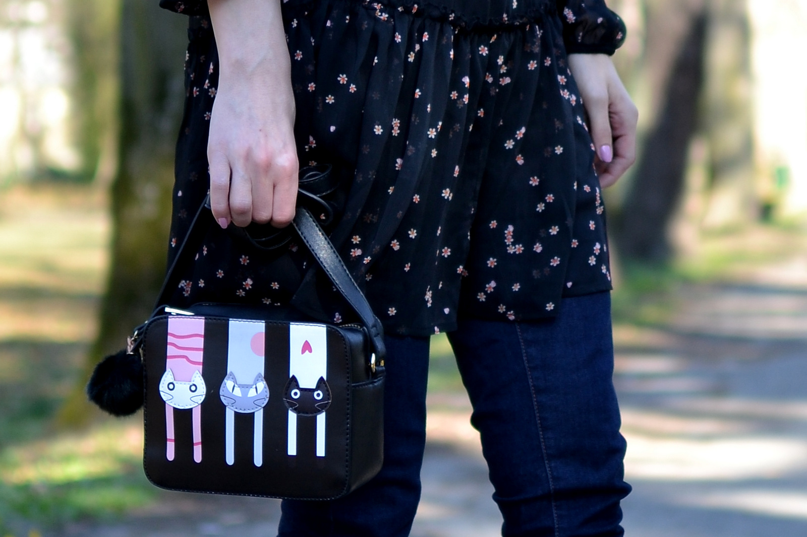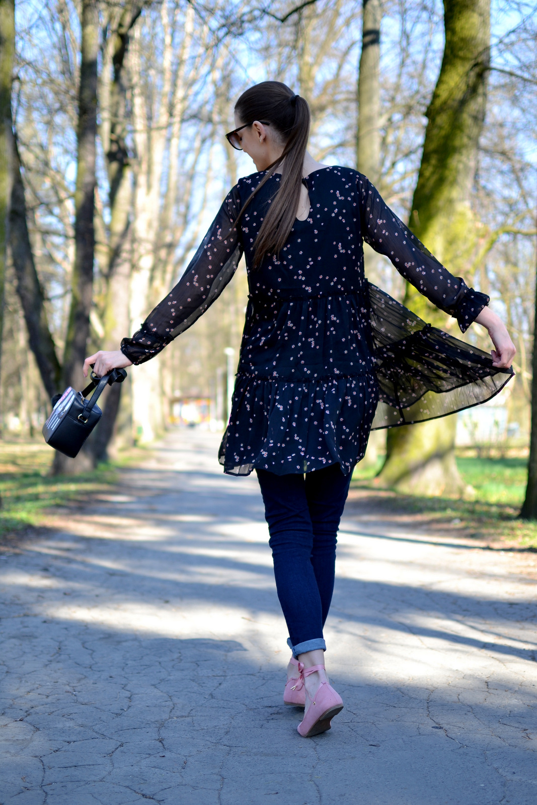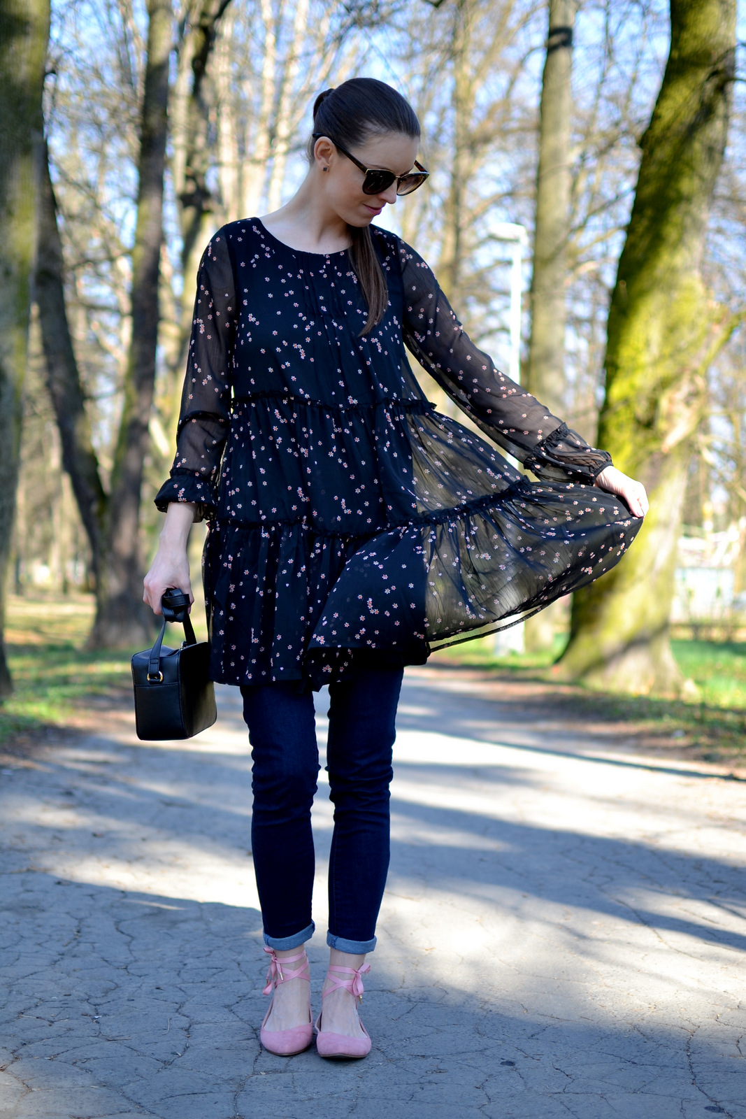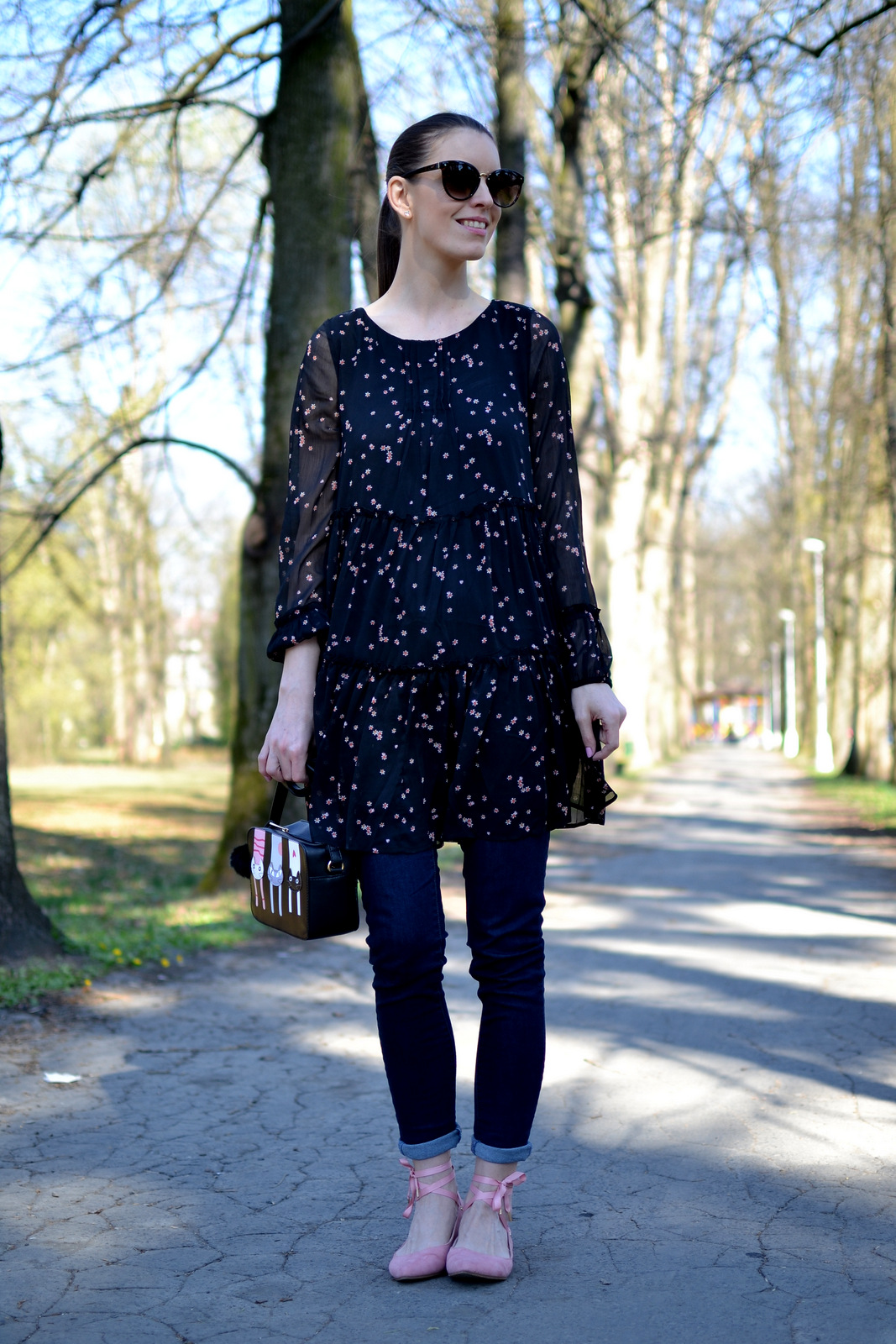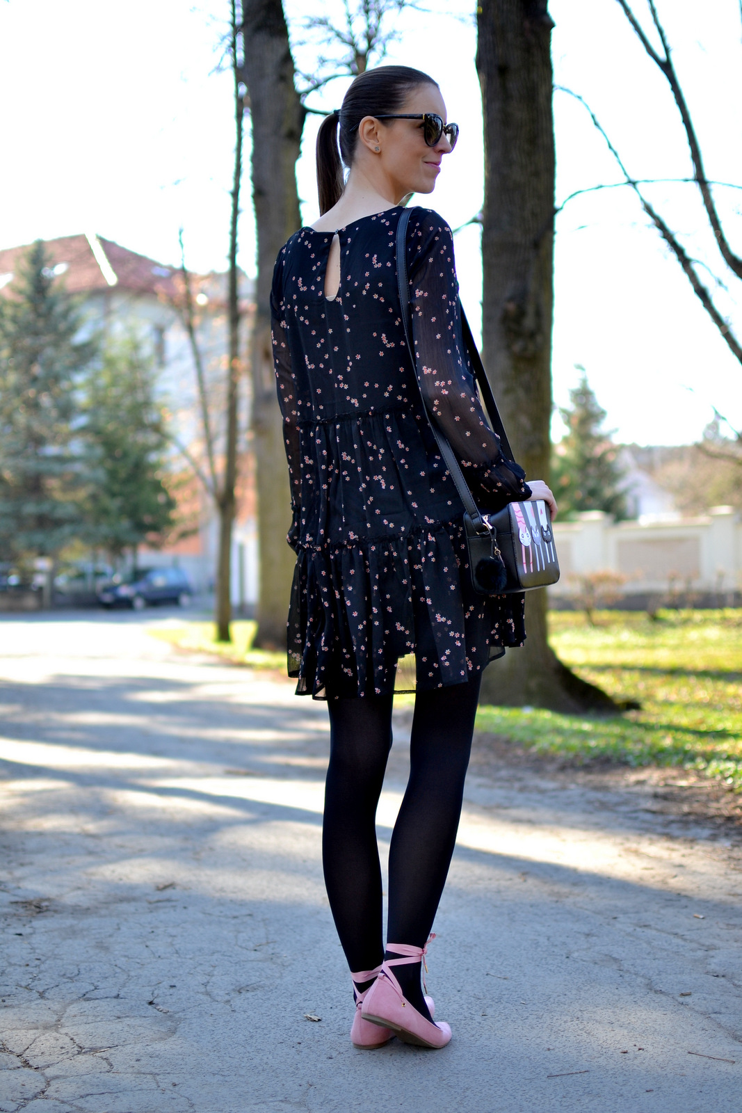 V druhej časti s novou kolekciou House, vám v outfite predstavím krásne vzdušné šaty, ktoré sa dajú nosiť aj ako tunika. Do outfitu som použila rovnakú kabelku, balerínky aj okuliare, aby som vám ukázala, že aj z mála sa dá vytvoriť viacero variácií a outfitov. Čierne šaty sú ušité zo šifónu a podšité úpletom, preto sú vhodné práve na aktuálne počasie, kedy neviete či ranné slnko vydrží až do večera 🙂 Zapínajú sa vzadu na malinký gombík so slzičkou. Všimli ste si, že balerínky môžete zaviazať na viacero spôsobov? Buď ich začnete viazať spredu dozadu alebo začnete presne naopak, tak ako to vidíte na pančuchách. Zozadu a nad členkami vytvoríte mašličku 🙂 Zistila som, že šnúrky sa dajú aj vytiahnuť a môžete si tam navliecť napríklad saténové stužky v iných farbách. Perfektné, čo poviete? Ak si trúfnete môžete zvoliť aj farebné alebo vzorované pančuchy. Po poslednom outfite som dostala množstvo otázok na mačičkovú kabelku, pripomínam, že odkaz na všetky časti z outfitu nájdete pod fotkou, ktorý vás nasmeruje priamo na e-shop 🙂 Prvý outfit jarnej kolekcie House nájdete TU.